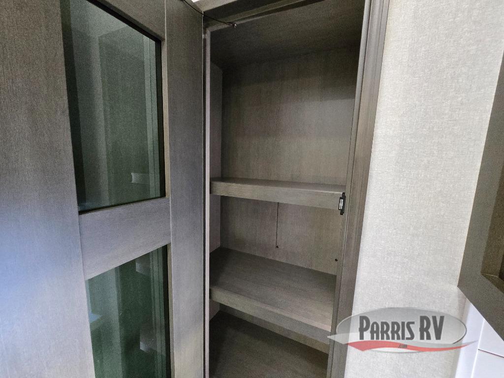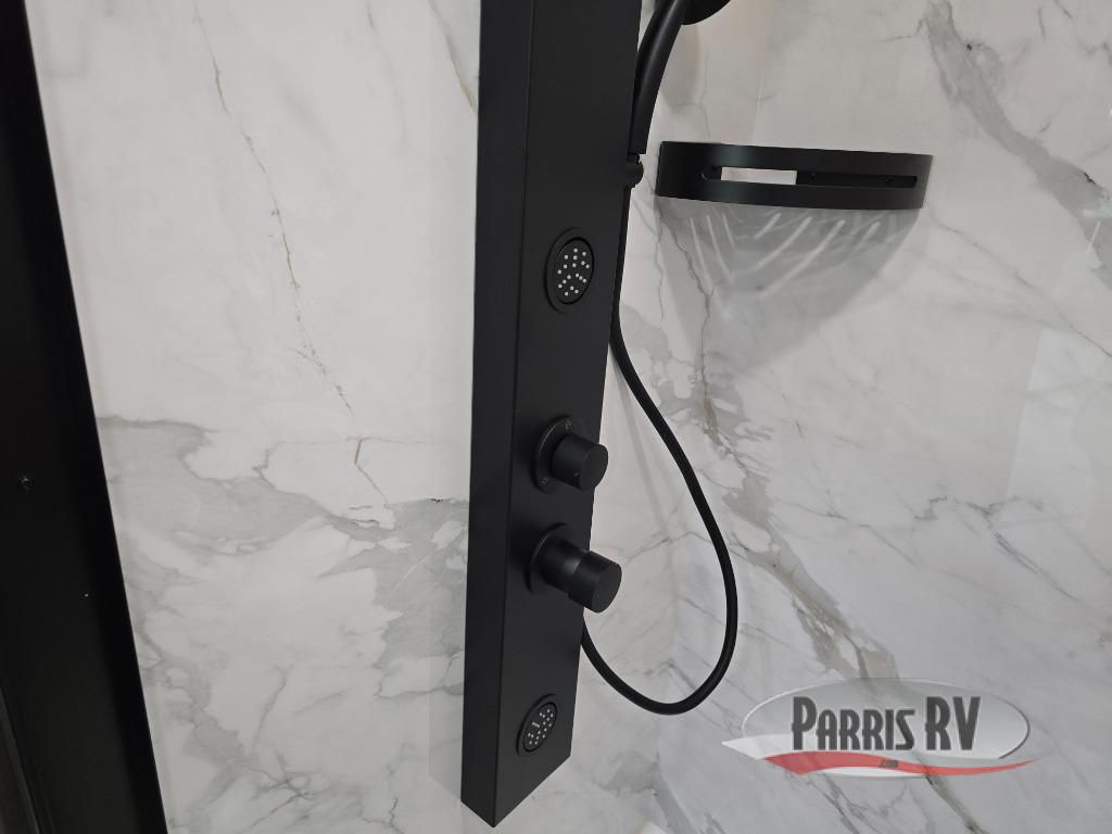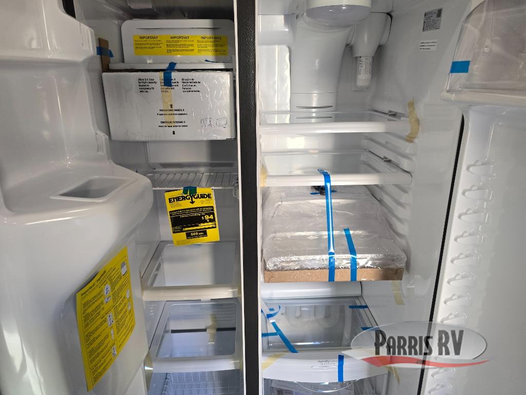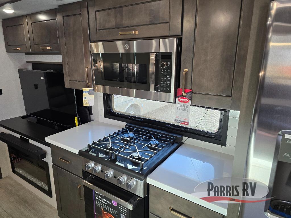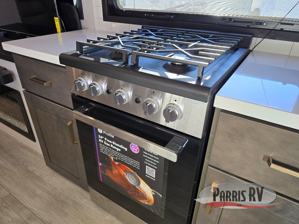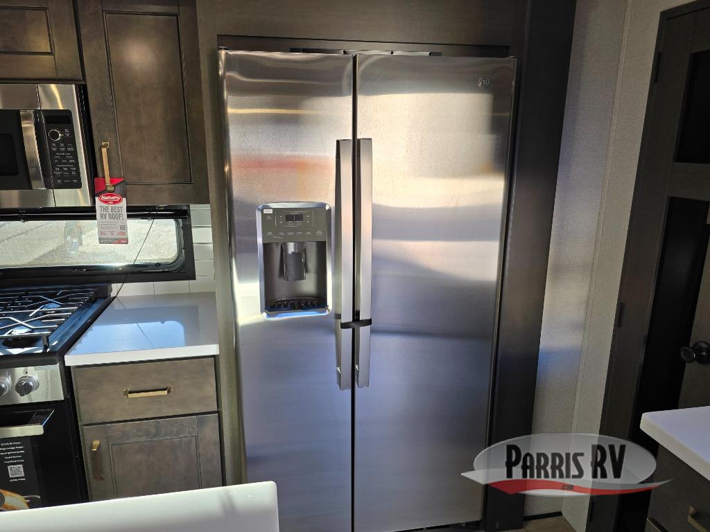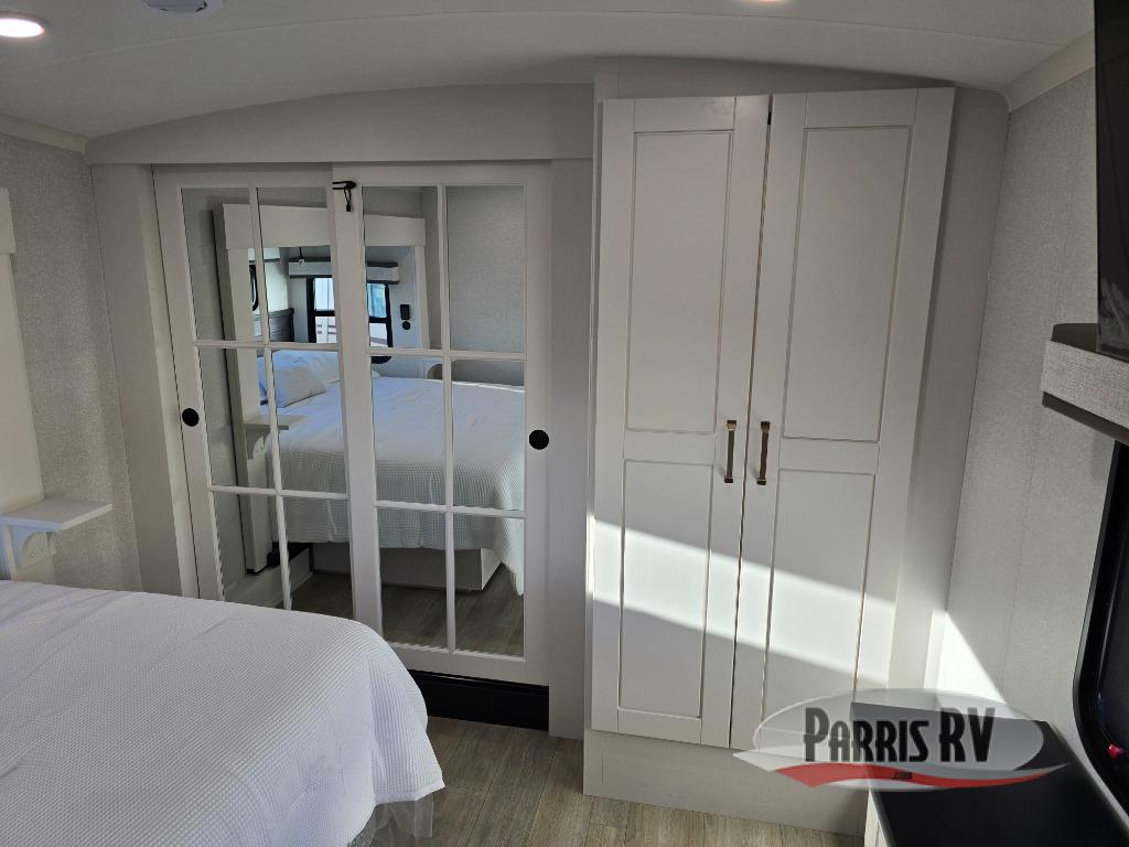 At the front of the unit, the spacious main bedroom offers a 72" x 80" king bed, providing ample room to relax and unwind. A wardrobe with drawers and a built-in hamper ensures plenty of organized storage for clothing and essentials, while a flip-up dresser across from the bed adds even more convenience. Moving down the hall, you’ll find a full bathroom featuring a large 36" x 48" shower with a built-in seat for added comfort. Toward the rear, the main living area has dual opposing slides that open up the space for maximum comfort and functionality. One slide hosts the fully equipped kitchen, complete with overhead cabinets, a convection microwave with built-in air fryer, a 24" range, and a 21-cu. ft. residential refrigerator, everything you need to cook in comfort. The central kitchen island features a residential “Do-It-All” sink with a pull-out faucet, glass rinse, vegetable rinse, and a pull-out cutting board for easy meal prep, while the corner pantry provides generous storage. Opposite the kitchen, you can relax in the theater seating or enjoy meals at the roll-out table. At the rear, a 78" hide-a-bed sofa offers additional lounging space or converts into extra-sleeping accommodations when needed.