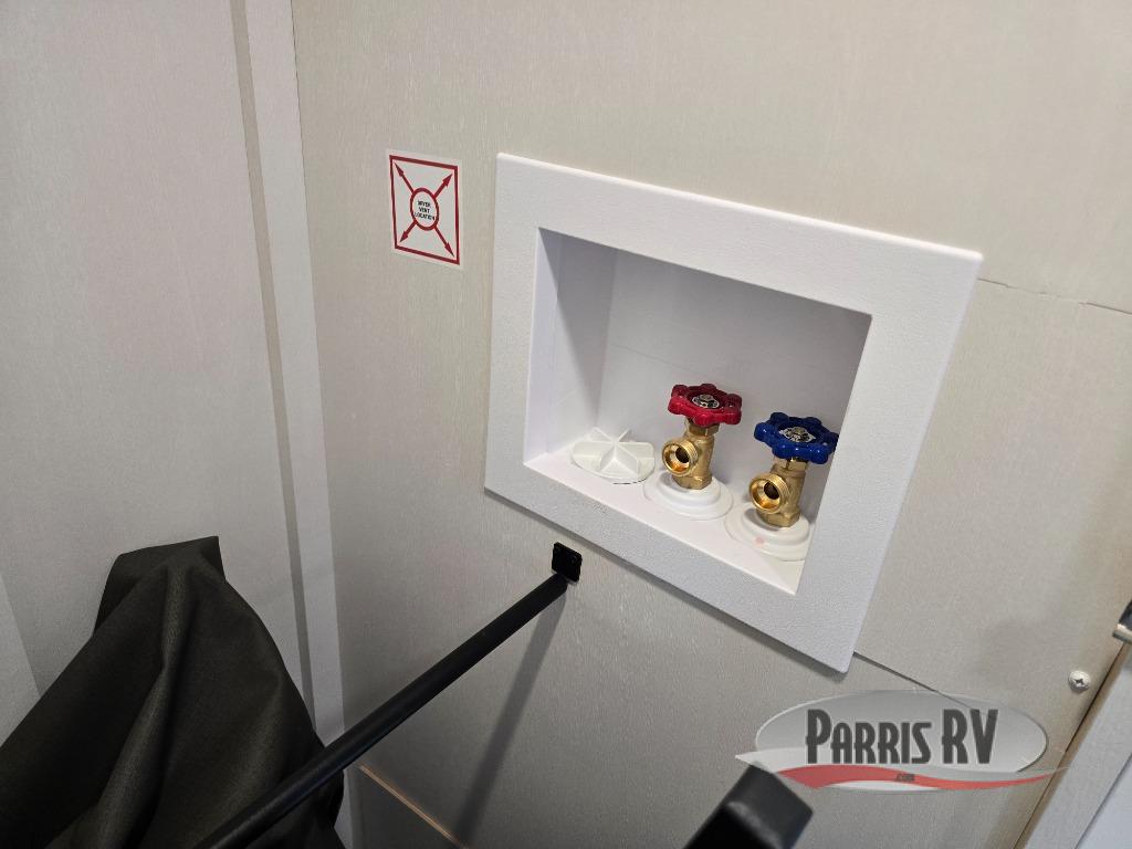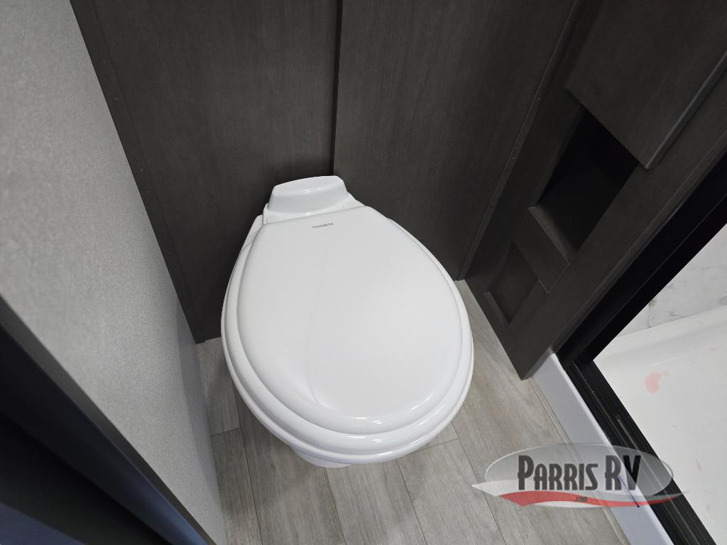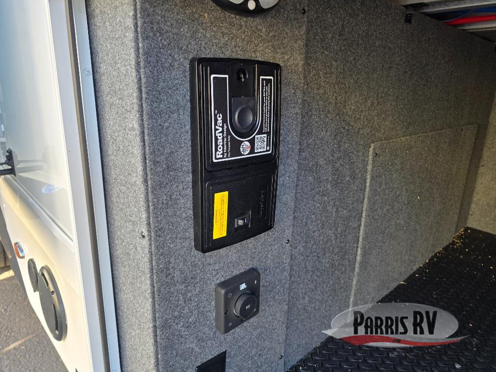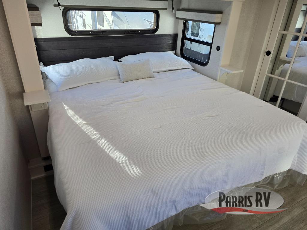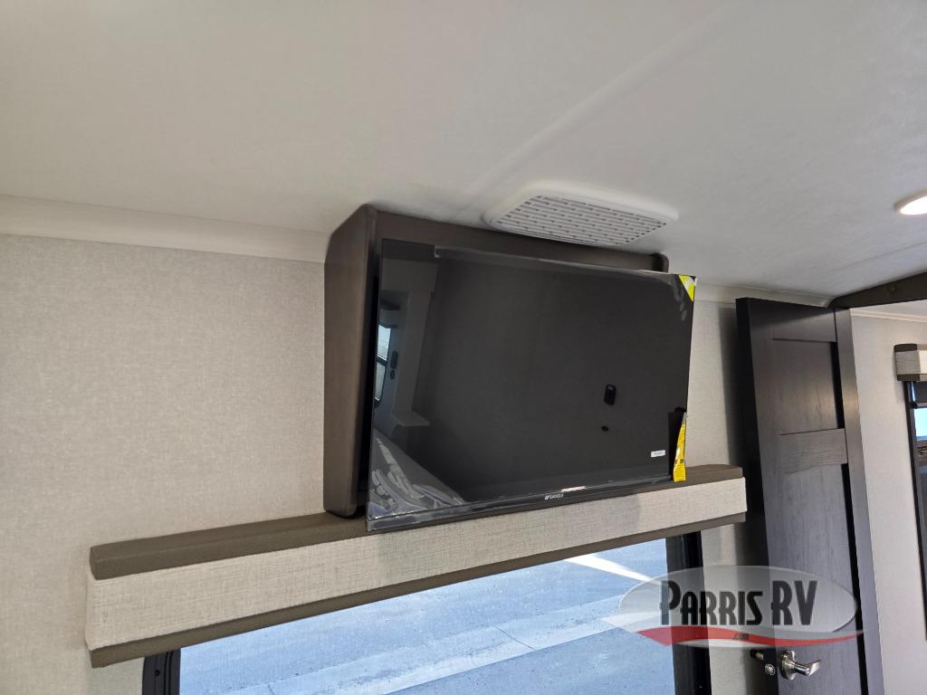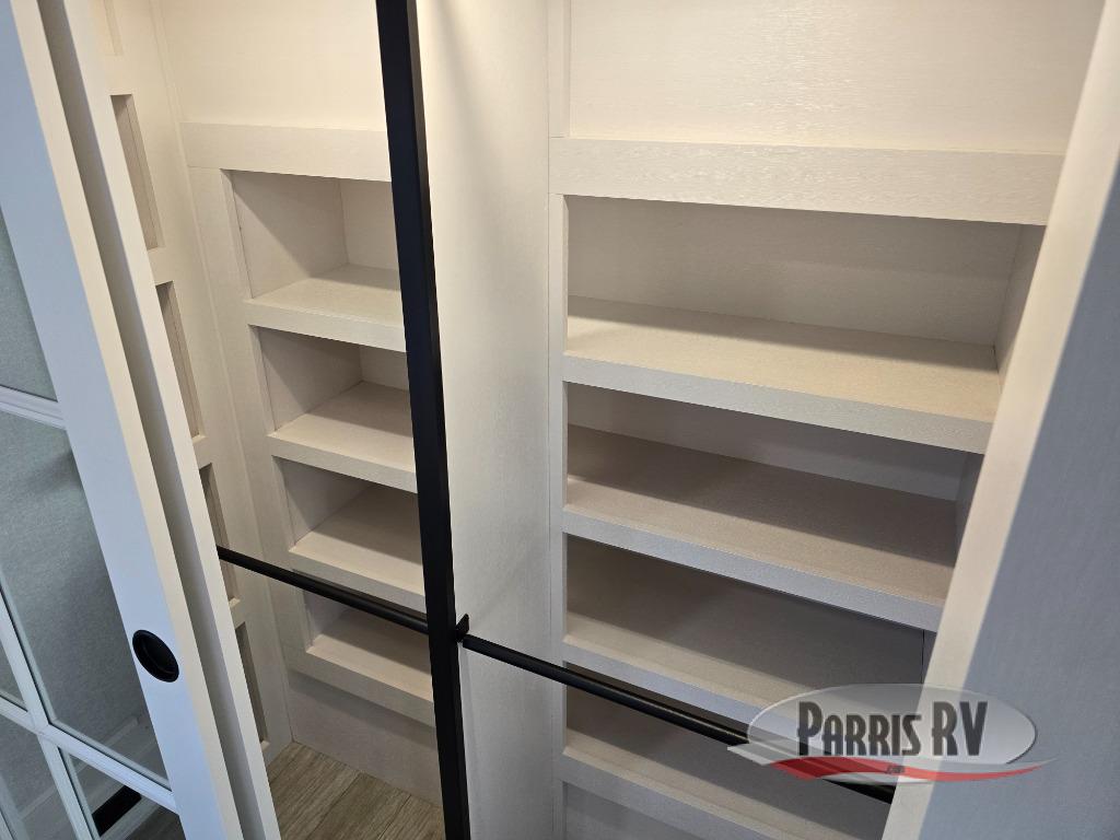 At the front of the unit, the spacious main bedroom offers a 72" x 80" king bed, providing ample room to relax and unwind. A wardrobe with drawers and a built-in hamper ensures plenty of organized storage for clothing and essentials, while a flip-up dresser across from the bed adds even more convenience. Moving down the hall, you’ll find a full bathroom featuring a large 36" x 48" shower with a built-in seat for added comfort. Toward the rear, the main living area has dual opposing slides that open up the space for maximum comfort and functionality. One slide hosts the fully equipped kitchen, complete with overhead cabinets, a convection microwave with built-in air fryer, a 24" range, and a 21-cu. ft. residential refrigerator, everything you need to cook in comfort. The central kitchen island features a residential “Do-It-All” sink with a pull-out faucet, glass rinse, vegetable rinse, and a pull-out cutting board for easy meal prep, while the corner pantry provides generous storage. Opposite the kitchen, you can relax in the theater seating or enjoy meals at the roll-out table. At the rear, a 78" hide-a-bed sofa offers additional lounging space or converts into extra-sleeping accommodations when needed.