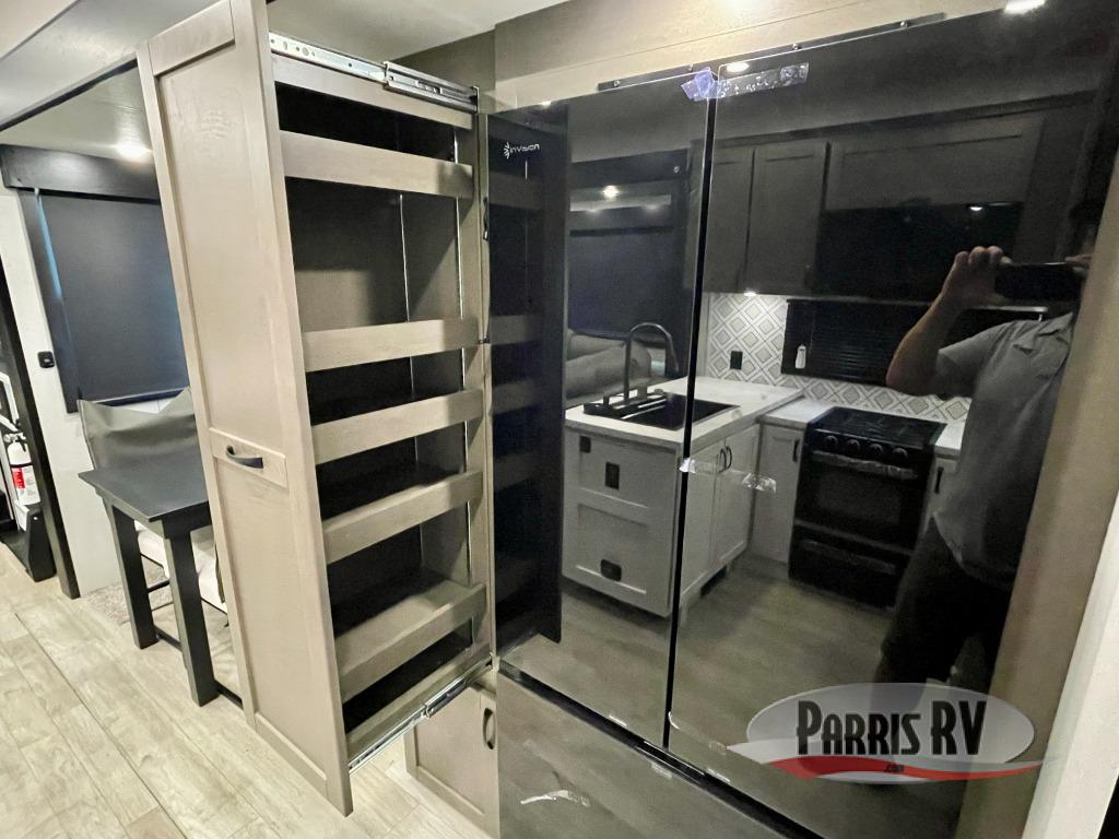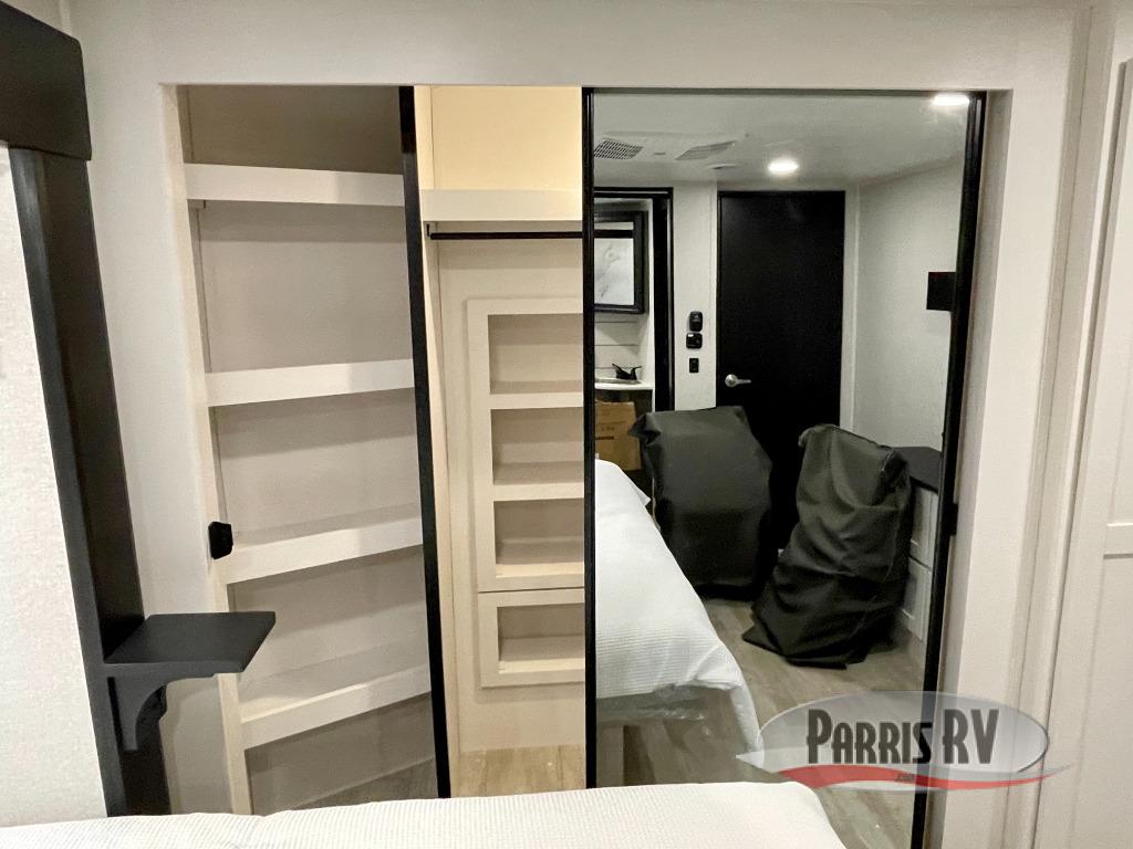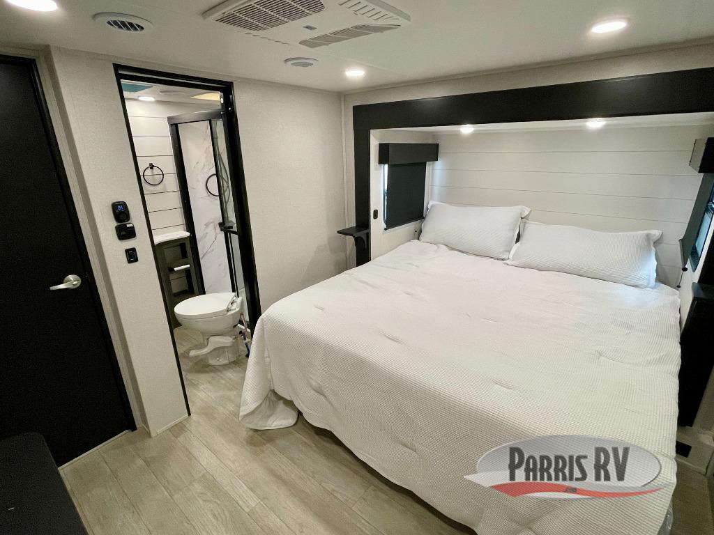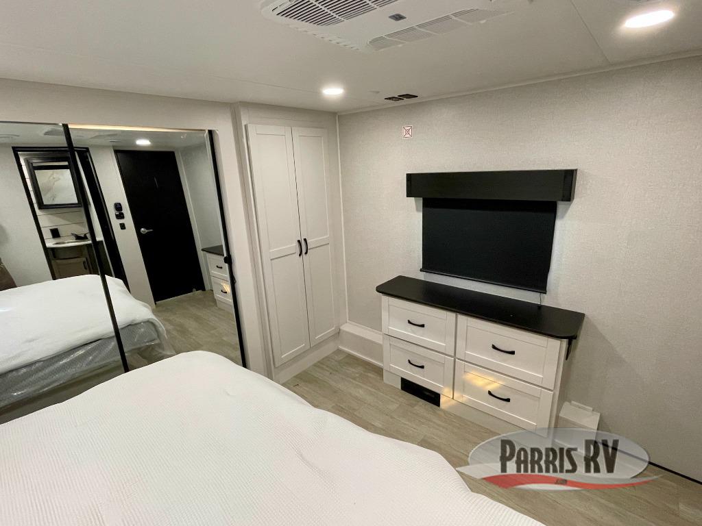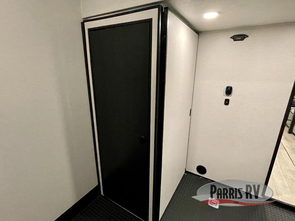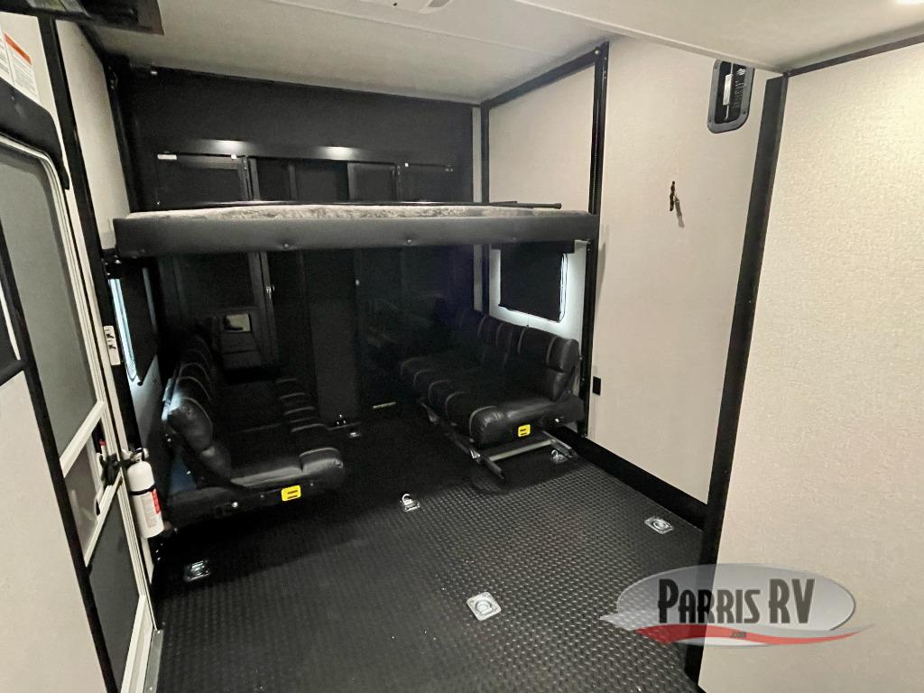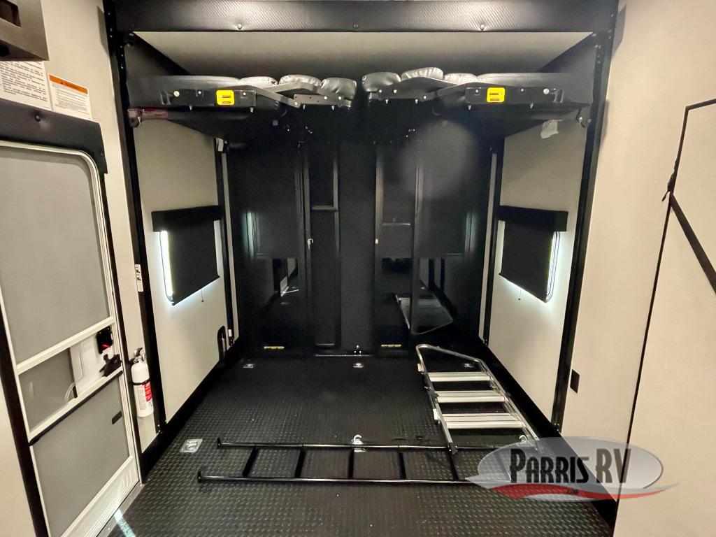 The 13' 6" garage is the perfect space for your toys, with enough room for your ATV, motorcycle, or other gear. Plus, the electric queen bed provides a comfortable spot to rest after a long day. The overhead loft with storage provides additional space for your gear, keeping it out of the way but still accessible. The kitchen is fully equipped with a microwave, sink, overhead cabinets, pantry, and coffee bar. The L-shaped sofa provides ample seating for relaxation, and the TV is perfectly positioned for viewing. The full bathroom is a welcome convenience, providing a private space to freshen up. Also, the front bedroom is a luxurious retreat, featuring a king bed, a walk-in closet, and drawers, and on the exterior, the two entry/exit doors provide easy access to the outside, making it perfect for loading and unloading your gear.