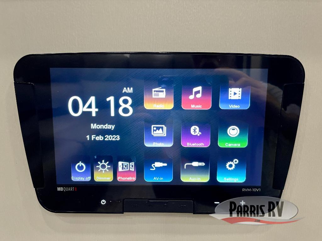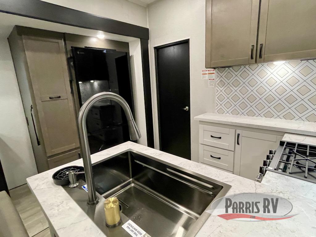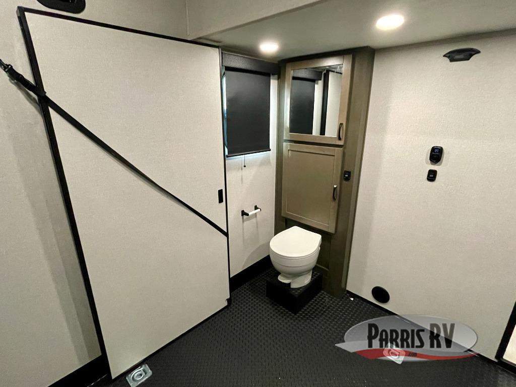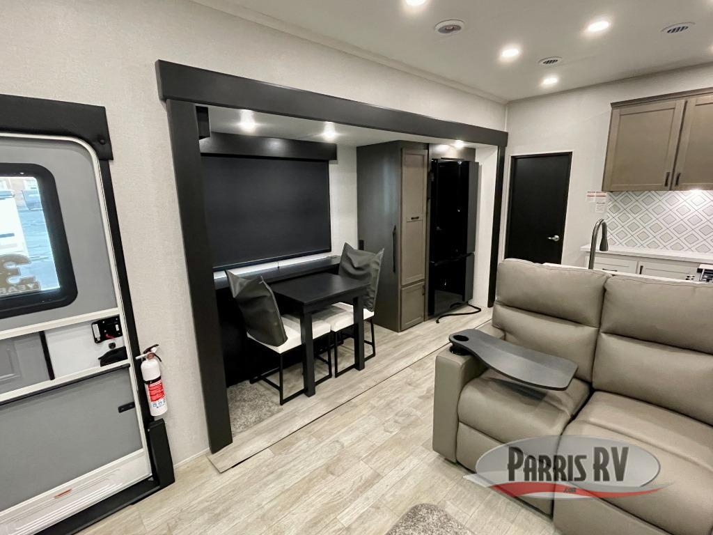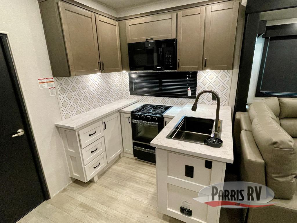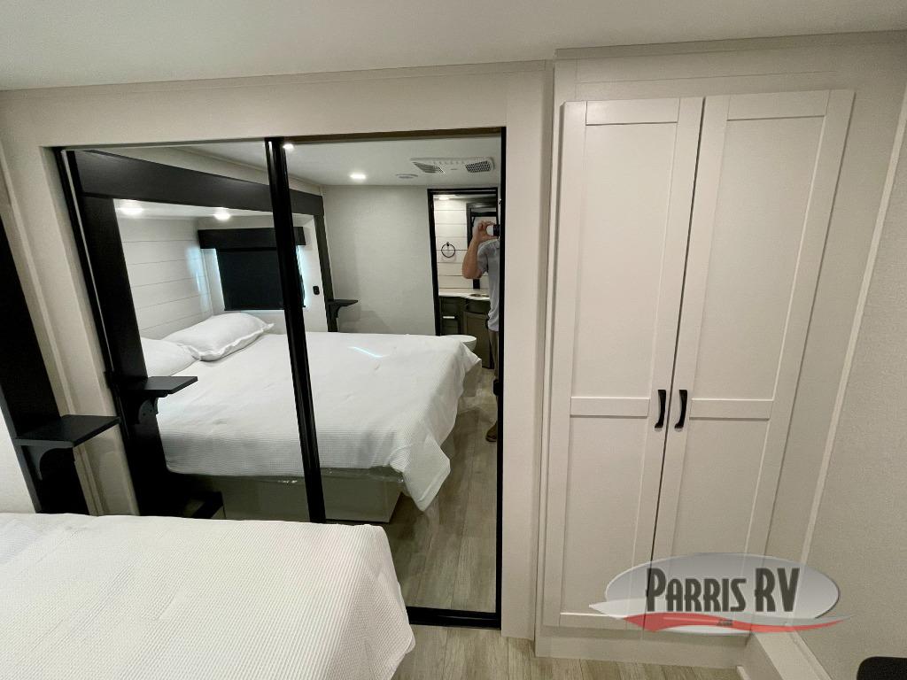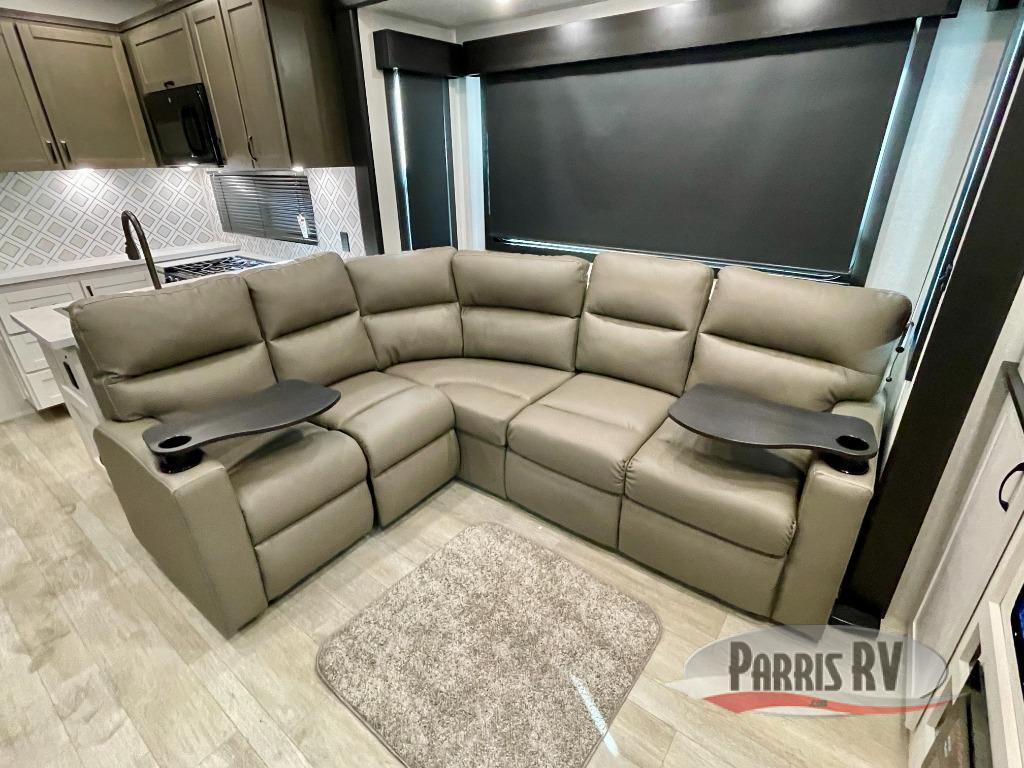 The 13' 6" garage is the perfect space for your toys, with enough room for your ATV, motorcycle, or other gear. Plus, the electric queen bed provides a comfortable spot to rest after a long day. The overhead loft with storage provides additional space for your gear, keeping it out of the way but still accessible. The kitchen is fully equipped with a microwave, sink, overhead cabinets, pantry, and coffee bar. The L-shaped sofa provides ample seating for relaxation, and the TV is perfectly positioned for viewing. The full bathroom is a welcome convenience, providing a private space to freshen up. Also, the front bedroom is a luxurious retreat, featuring a king bed, a walk-in closet, and drawers, and on the exterior, the two entry/exit doors provide easy access to the outside, making it perfect for loading and unloading your gear.