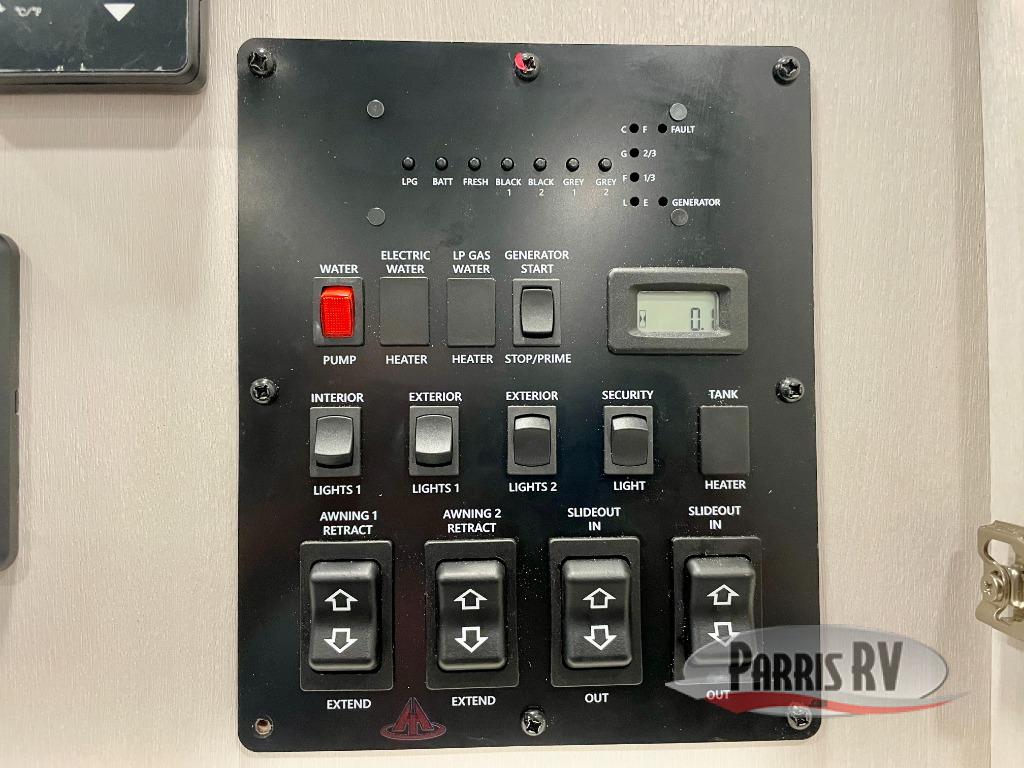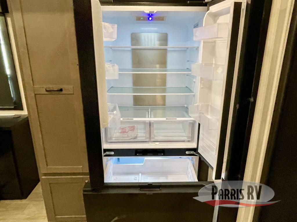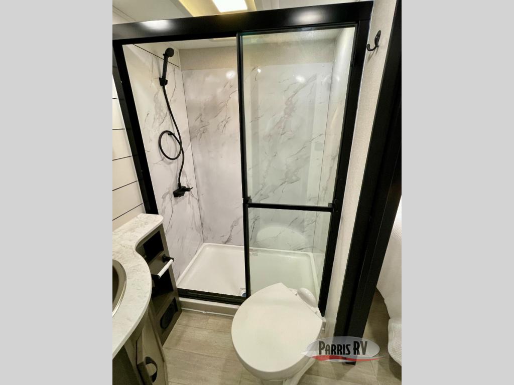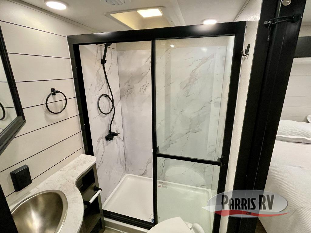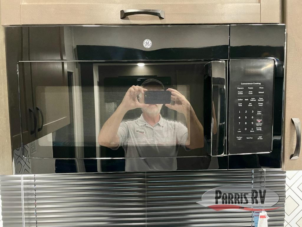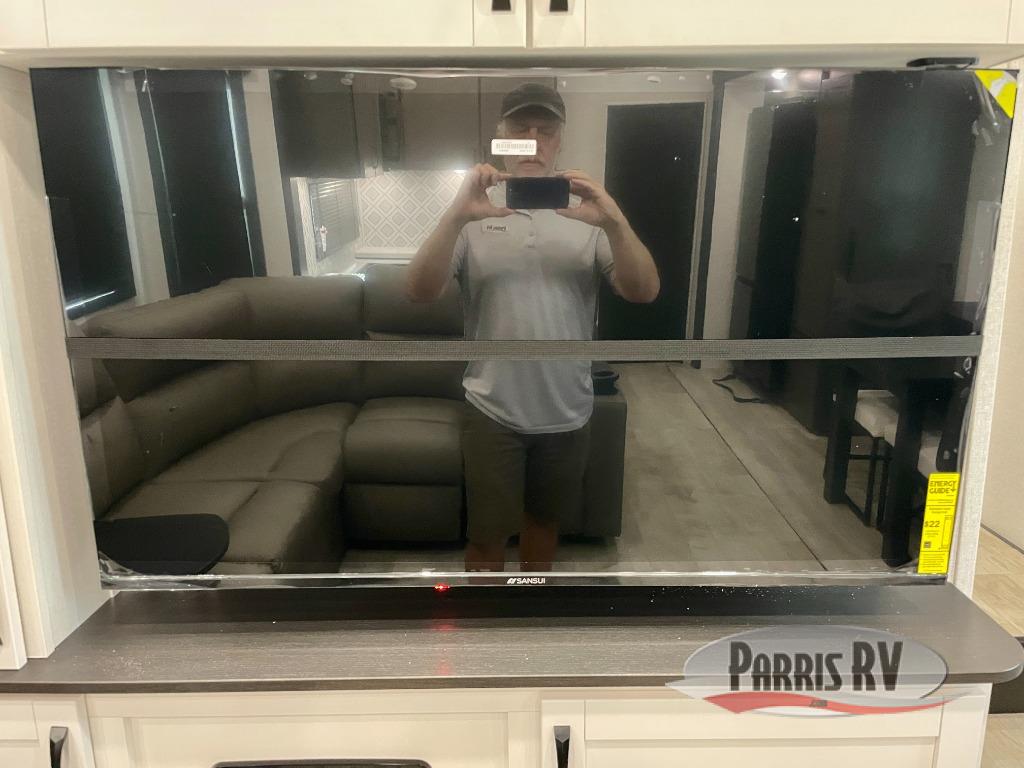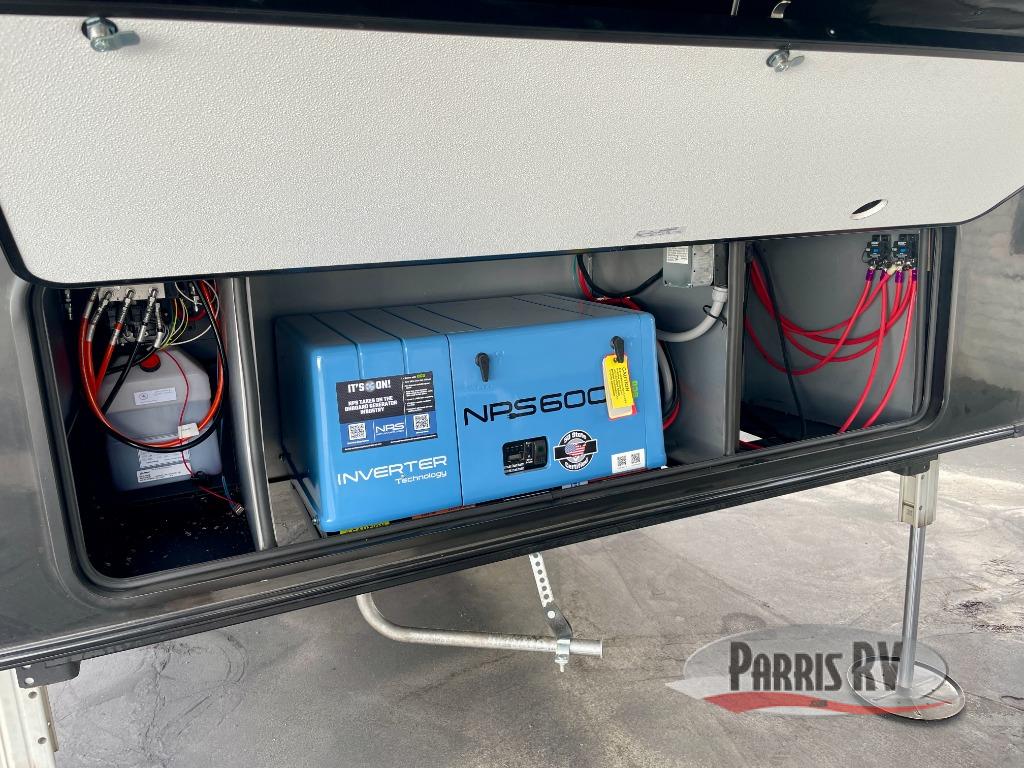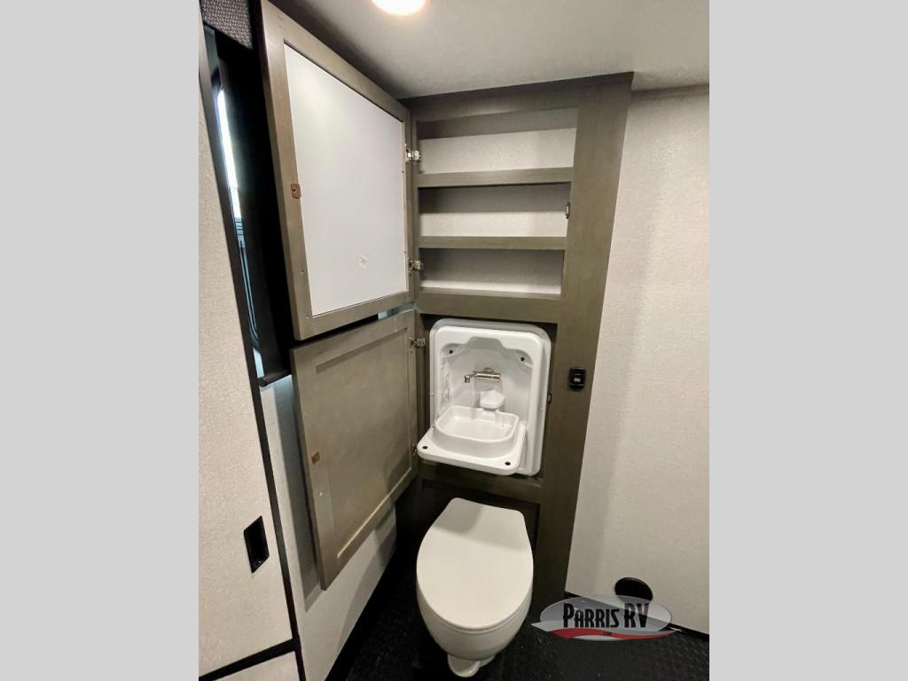 The 13' 6" garage is the perfect space for your toys, with enough room for your ATV, motorcycle, or other gear. Plus, the electric queen bed provides a comfortable spot to rest after a long day. The overhead loft with storage provides additional space for your gear, keeping it out of the way but still accessible. The kitchen is fully equipped with a microwave, sink, overhead cabinets, pantry, and coffee bar. The L-shaped sofa provides ample seating for relaxation, and the TV is perfectly positioned for viewing. The full bathroom is a welcome convenience, providing a private space to freshen up. Also, the front bedroom is a luxurious retreat, featuring a king bed, a walk-in closet, and drawers, and on the exterior, the two entry/exit doors provide easy access to the outside, making it perfect for loading and unloading your gear.