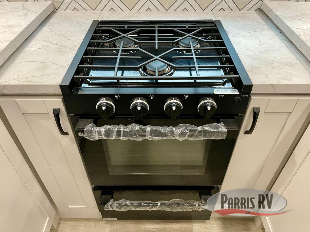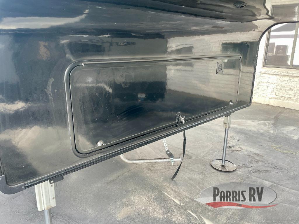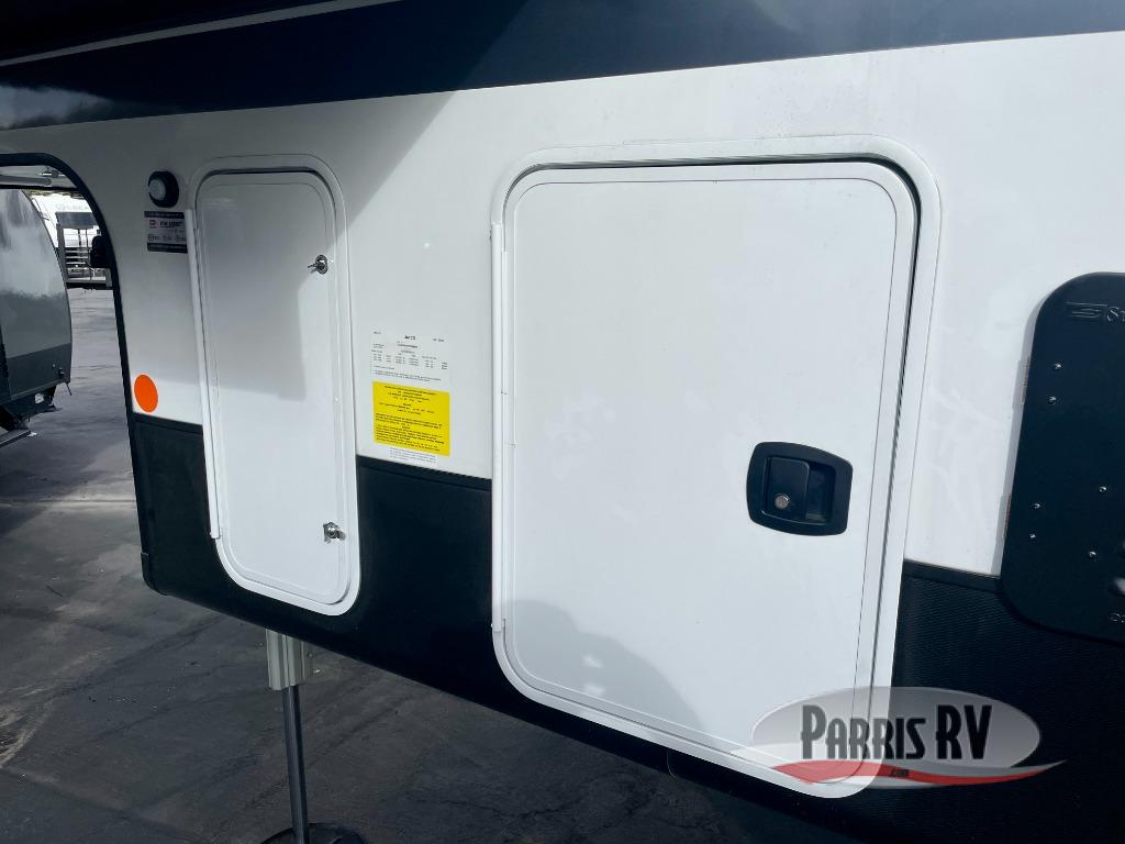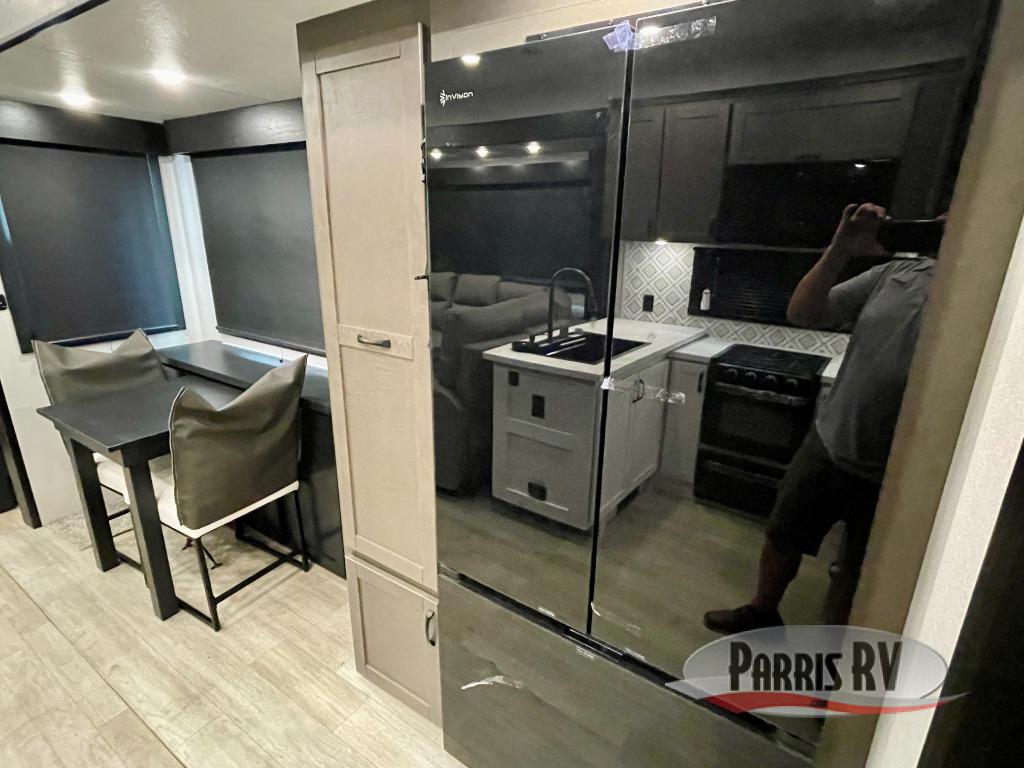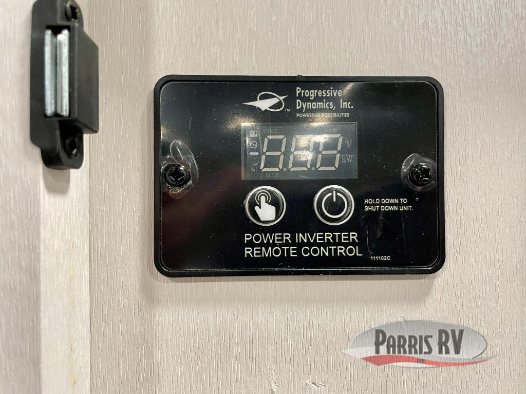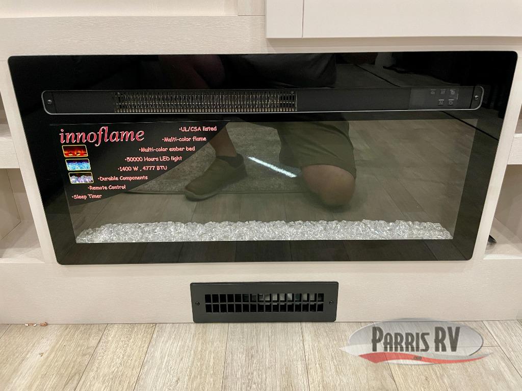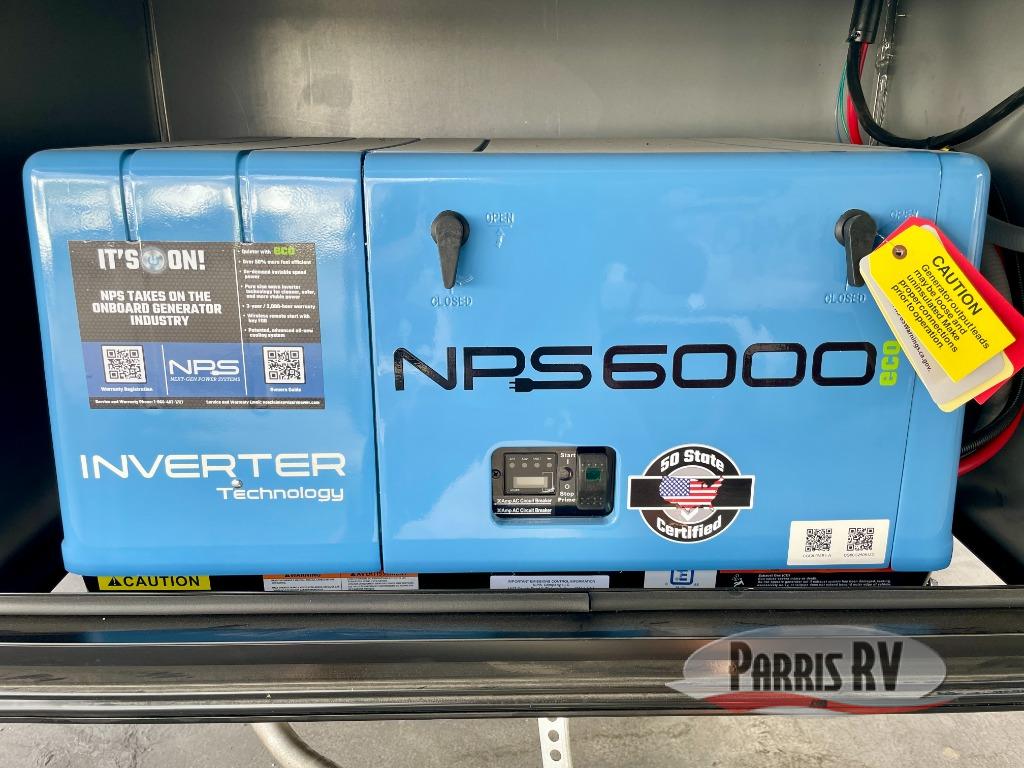The 13' 6" garage is the perfect space for your toys, with enough room for your ATV, motorcycle, or other gear. Plus, the electric queen bed provides a comfortable spot to rest after a long day. The overhead loft with storage provides additional space for your gear, keeping it out of the way but still accessible. The kitchen is fully equipped with a microwave, sink, overhead cabinets, pantry, and coffee bar. The L-shaped sofa provides ample seating for relaxation, and the TV is perfectly positioned for viewing. The full bathroom is a welcome convenience, providing a private space to freshen up. Also, the front bedroom is a luxurious retreat, featuring a king bed, a walk-in closet, and drawers, and on the exterior, the two entry/exit doors provide easy access to the outside, making it perfect for loading and unloading your gear.