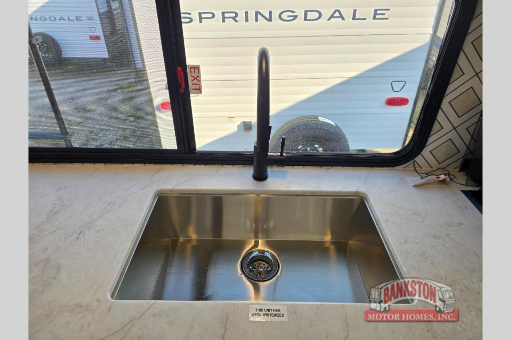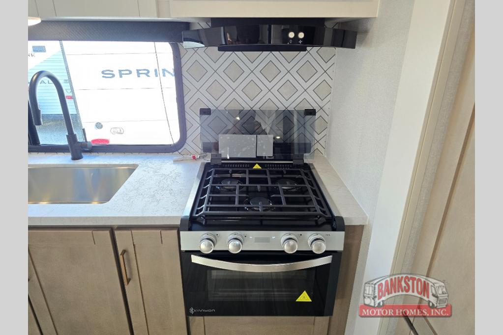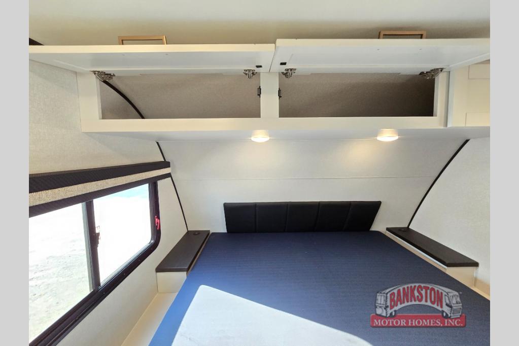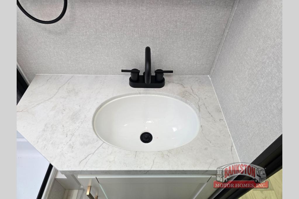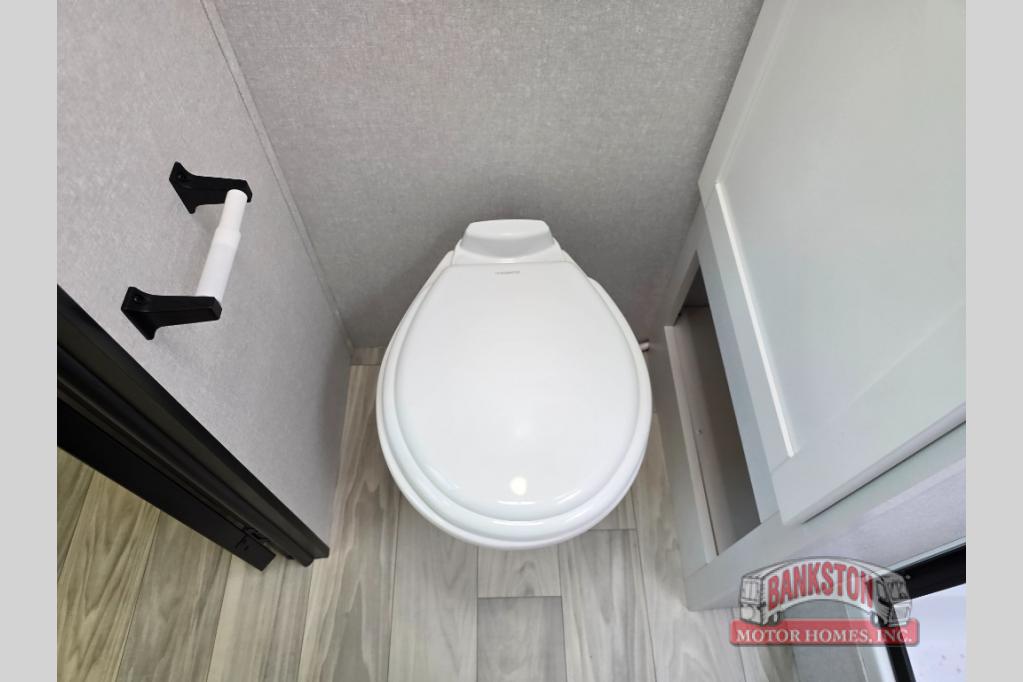 At the front of this travel trailer, you'll find a private bedroom featuring a spacious 60" x 80" queen bed, complete with pull-out nightstands and wardrobes on each side for convenient storage of clothes and essentials. One of the two entry doors is located here, providing added privacy and easy access. Moving down the hall, the full bathroom offers a 30" x 36" shower, a porcelain foot-flush toilet, and a linen cabinet to keep towels and hygiene items neatly organized. In the main living area, you can enjoy meals or game nights at the 38" x 68" booth dinette, while the 60" theater seat in the slide-out provides a cozy spot to relax. At the rear, the kitchen spans the full width of the trailer and includes a stainless-steel single-basin sink with a high-rise pullout faucet and butcher block cutting board, a three-burner range, and generous seamless countertops. Also, in the slide-out are a pantry and an 11-cu. ft. refrigerator, giving you plenty of room to store food, snacks, and leftovers for the whole trip. The second entry door is located in between the kitchen and dinette for your convenience.