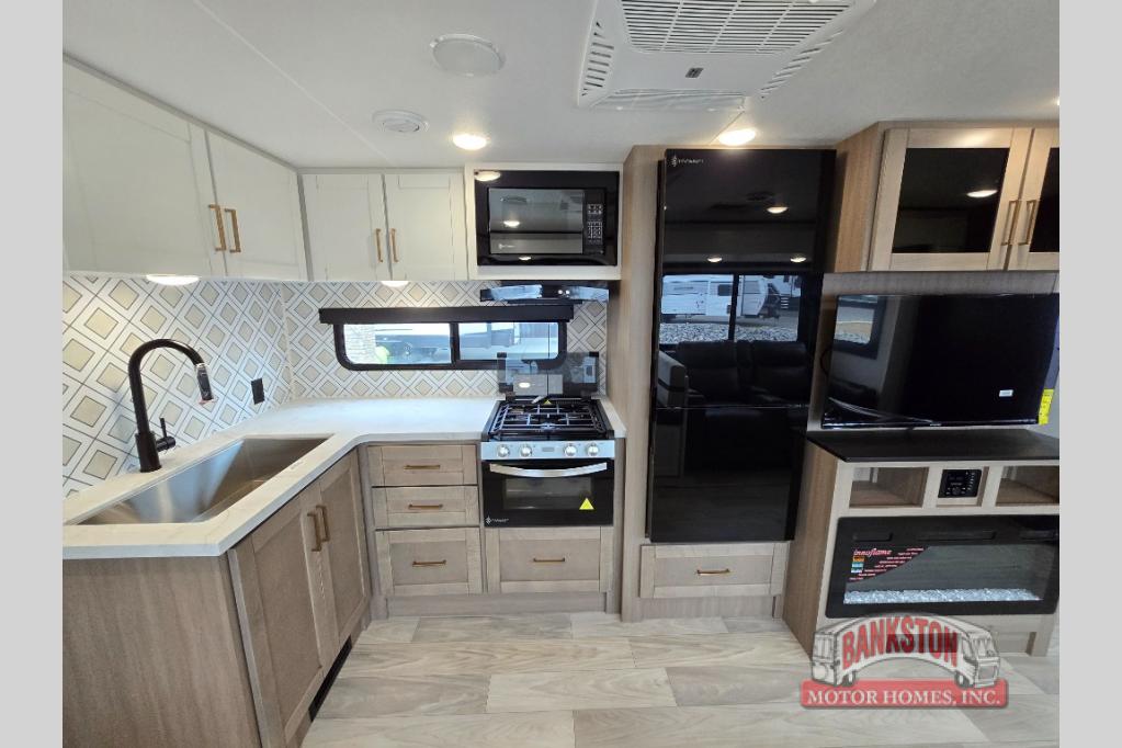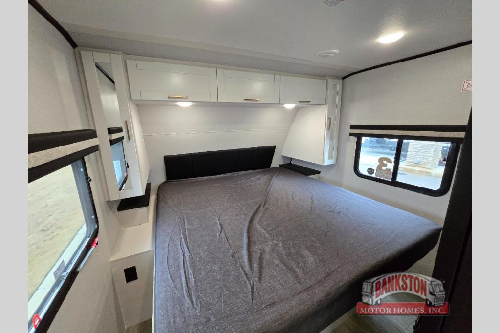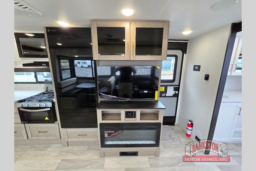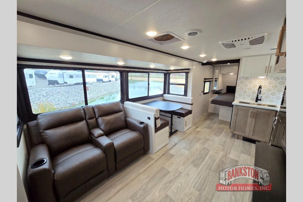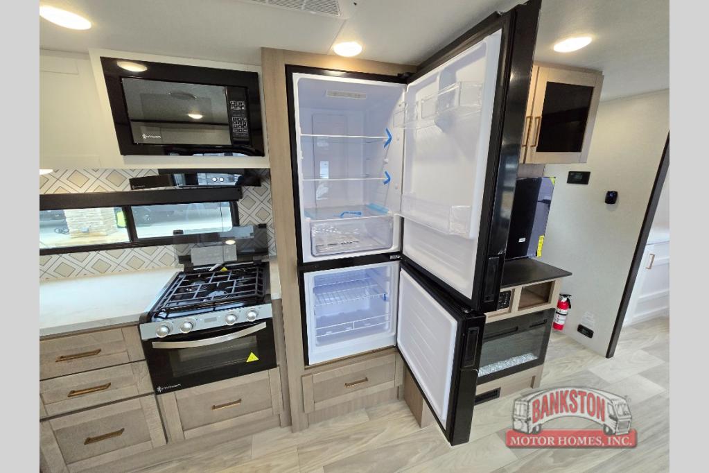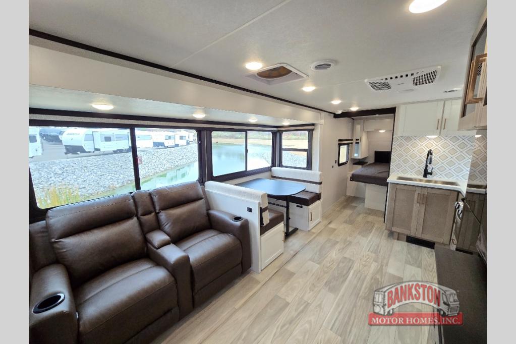 At the front of this travel trailer, you'll find a private bedroom featuring a 60" x 80" queen bed for a restful night’s sleep, in between nightstands on each side for added convenience. Moving into the center of the trailer, the main living area offers a spacious slide-out with a 60" tri-fold sofa perfect for lounging, and a 40" x 70" dinette ideal for meals, game nights, or gathering with friends and family—both of which convert into extra-sleeping space if needed. Across from the slide, the L-shaped kitchen is thoughtfully designed for ease and efficiency, featuring a stainless steel sink on one end, seamless countertop space for prepping meals, a three-burner range, and an 11 cu. ft. refrigerator for all your cooking essentials. Just beside the refrigerator is the entertainment center, with a walk-in pantry tucked behind it to store all your dry goods and snacks. At the rear, the full bathroom provides generous counter space, making it easy and comfortable to get ready each day.