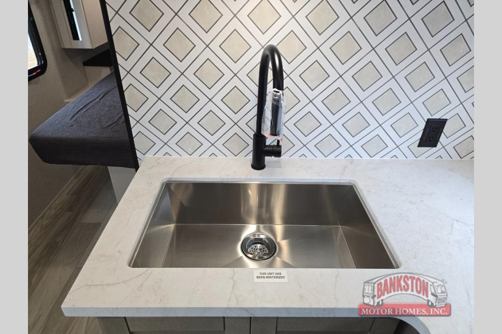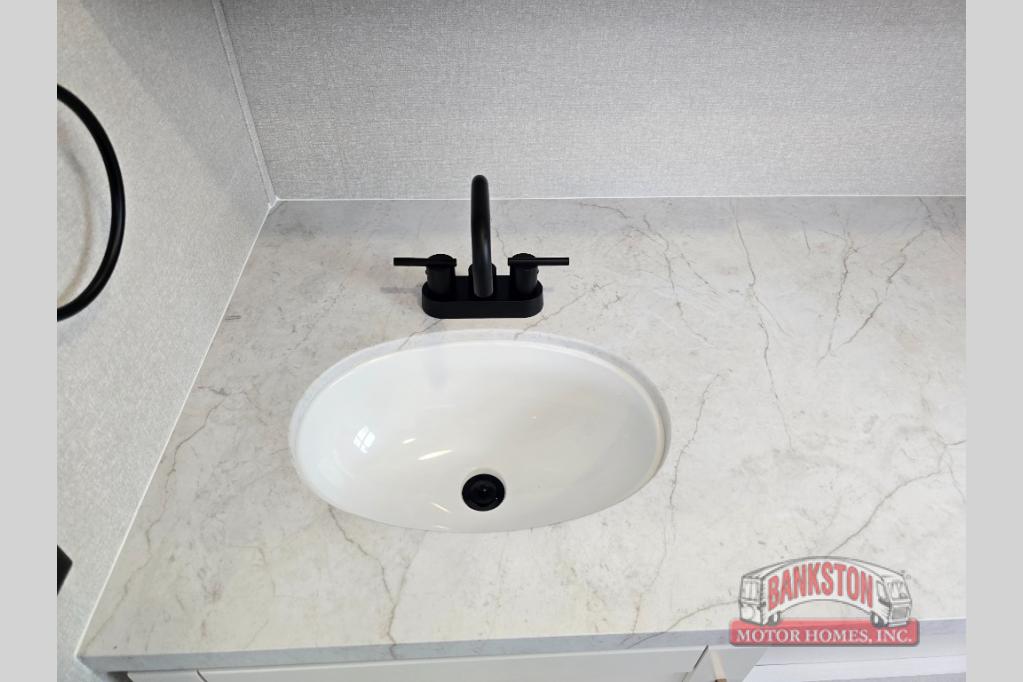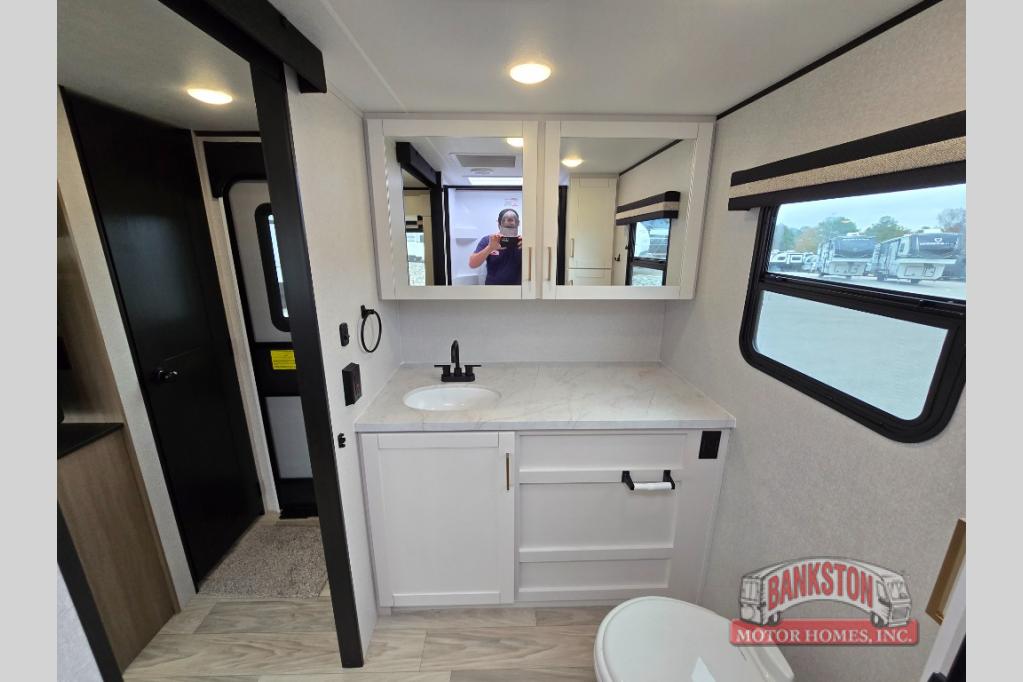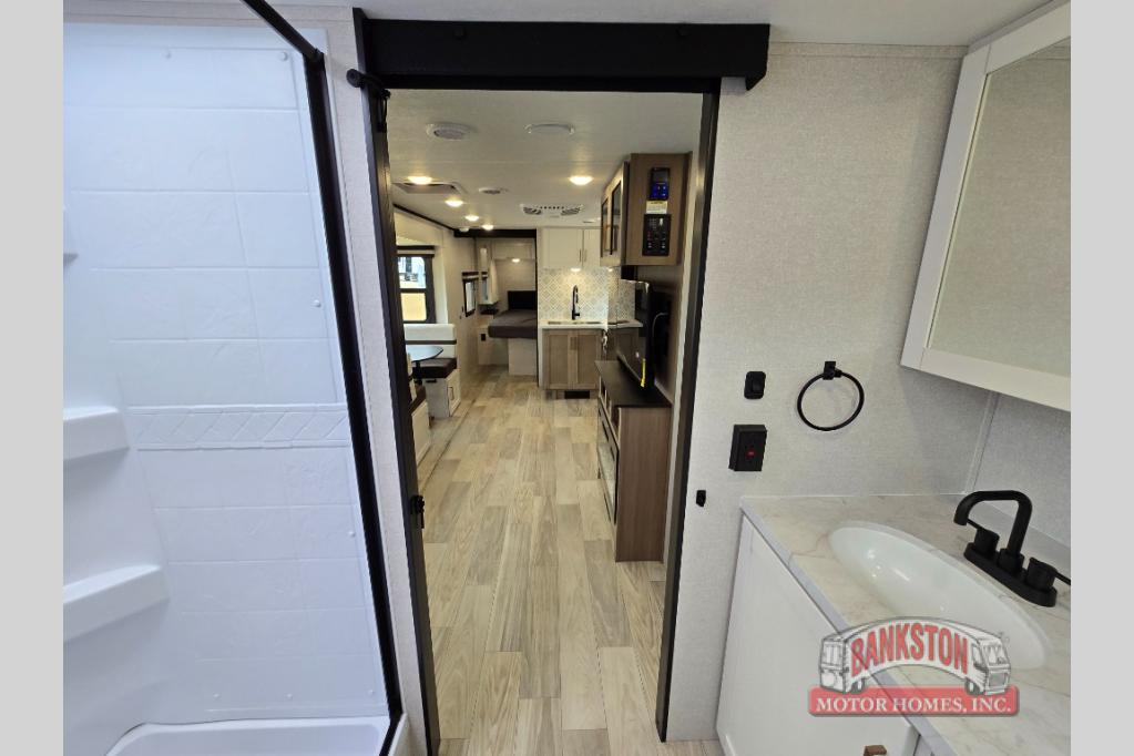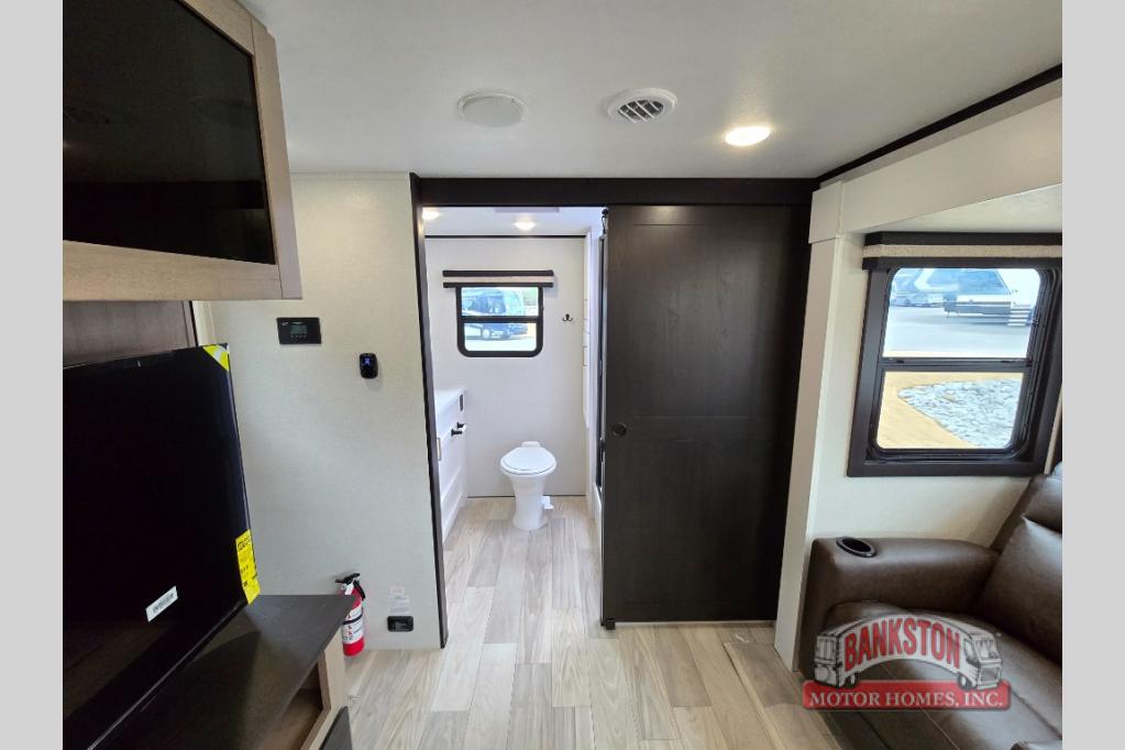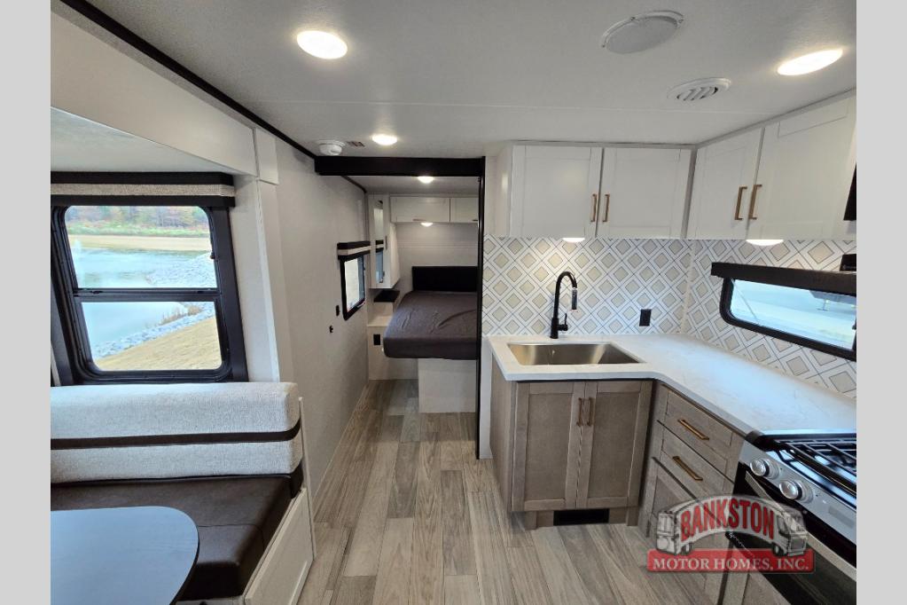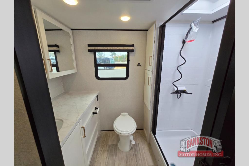 At the front of this travel trailer, you'll find a private bedroom featuring a 60" x 80" queen bed for a restful night’s sleep, in between nightstands on each side for added convenience. Moving into the center of the trailer, the main living area offers a spacious slide-out with a 60" tri-fold sofa perfect for lounging, and a 40" x 70" dinette ideal for meals, game nights, or gathering with friends and family—both of which convert into extra-sleeping space if needed. Across from the slide, the L-shaped kitchen is thoughtfully designed for ease and efficiency, featuring a stainless steel sink on one end, seamless countertop space for prepping meals, a three-burner range, and an 11 cu. ft. refrigerator for all your cooking essentials. Just beside the refrigerator is the entertainment center, with a walk-in pantry tucked behind it to store all your dry goods and snacks. At the rear, the full bathroom provides generous counter space, making it easy and comfortable to get ready each day.