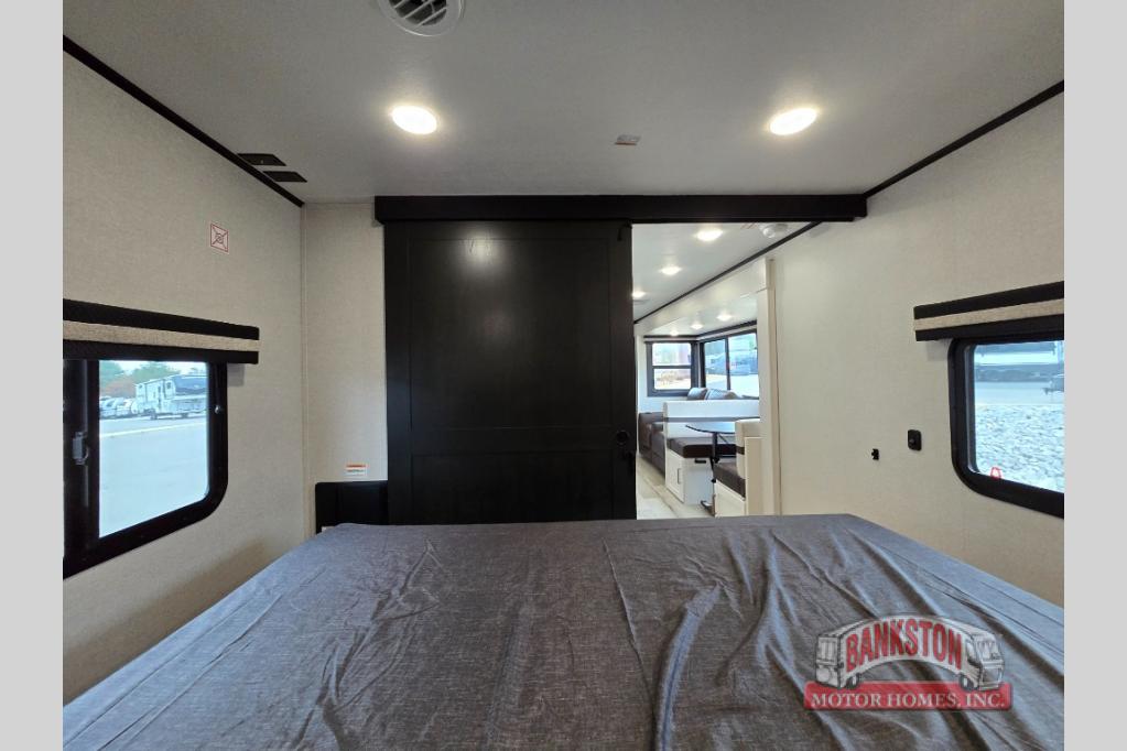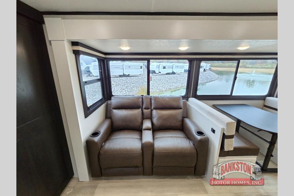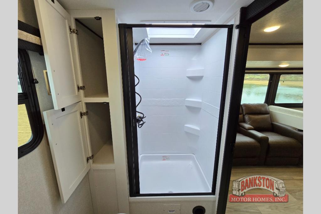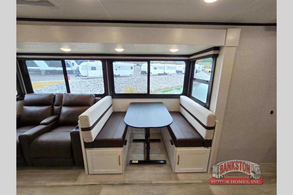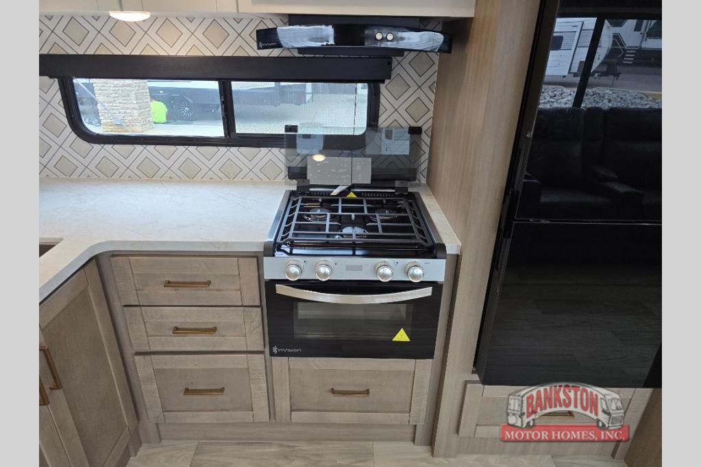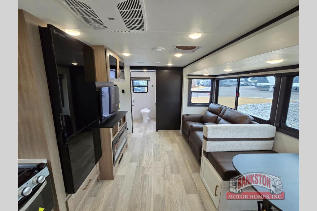 At the front of this travel trailer, you'll find a private bedroom featuring a 60" x 80" queen bed for a restful night’s sleep, in between nightstands on each side for added convenience. Moving into the center of the trailer, the main living area offers a spacious slide-out with a 60" tri-fold sofa perfect for lounging, and a 40" x 70" dinette ideal for meals, game nights, or gathering with friends and family—both of which convert into extra-sleeping space if needed. Across from the slide, the L-shaped kitchen is thoughtfully designed for ease and efficiency, featuring a stainless steel sink on one end, seamless countertop space for prepping meals, a three-burner range, and an 11 cu. ft. refrigerator for all your cooking essentials. Just beside the refrigerator is the entertainment center, with a walk-in pantry tucked behind it to store all your dry goods and snacks. At the rear, the full bathroom provides generous counter space, making it easy and comfortable to get ready each day.