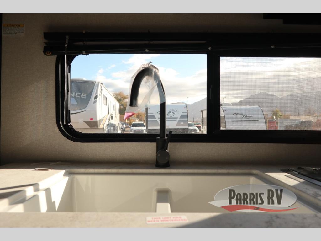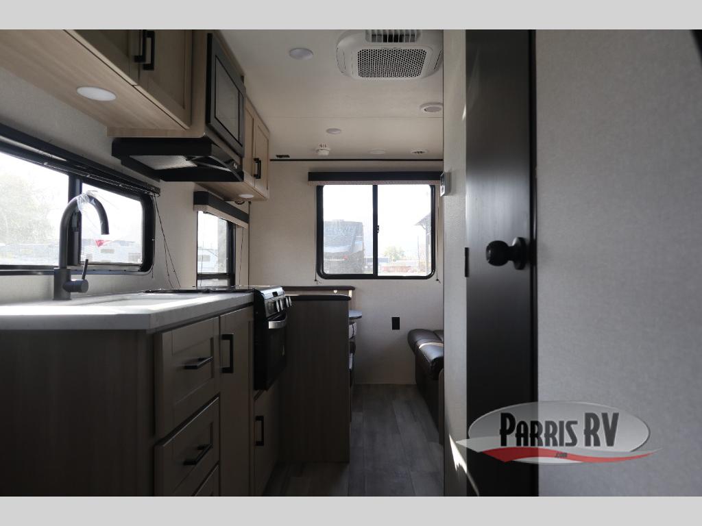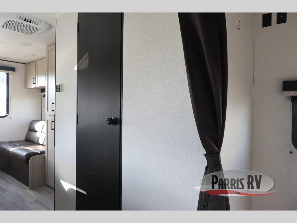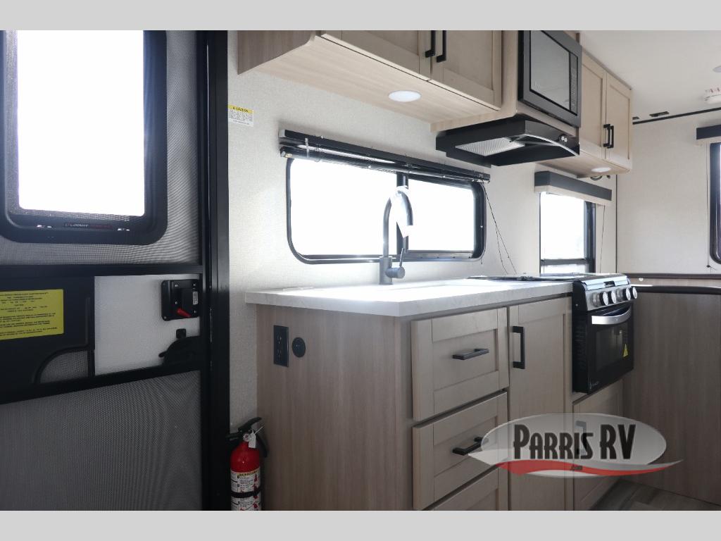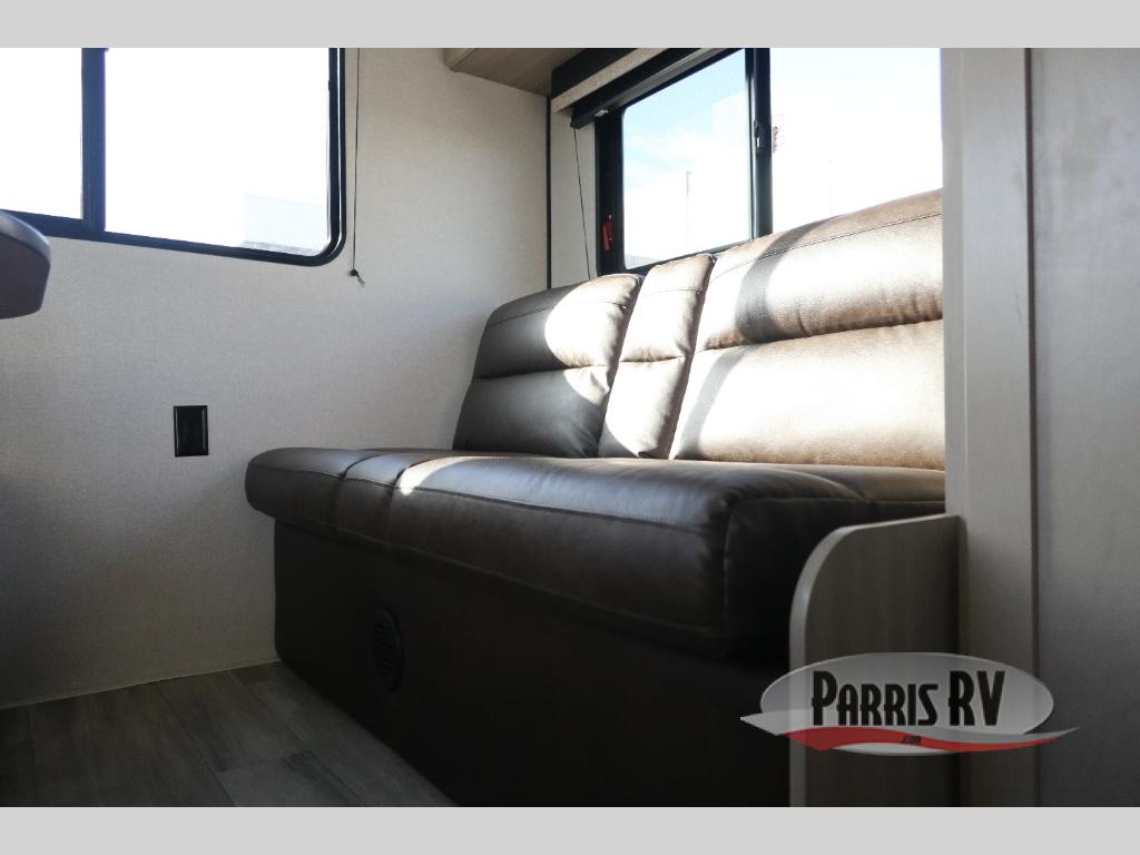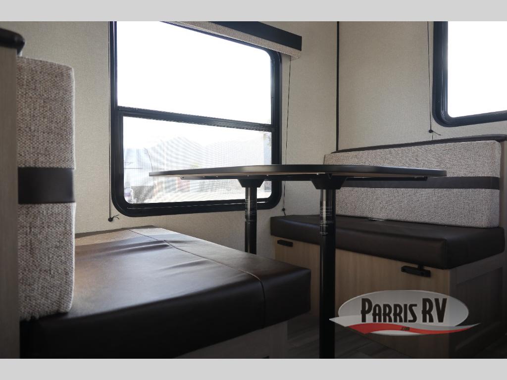 Weekend trips to the campground will be made unforgettable in this travel trailer for five to six. You will enjoy your own space in the front bedroom with a privacy curtain, RV queen bed and dual bedside wardrobes to keep your things tidy. If you have any guests staying over, then can convert the jack knife sofa and booth dinette back into seating spaces for breakfast in the morning. Speaking of breakfast, you'll have a three-burner cooktop and microwave oven to cook eggs and bacon, plus an 8-cu. ft. 12V refrigerator and pantry for food storage.