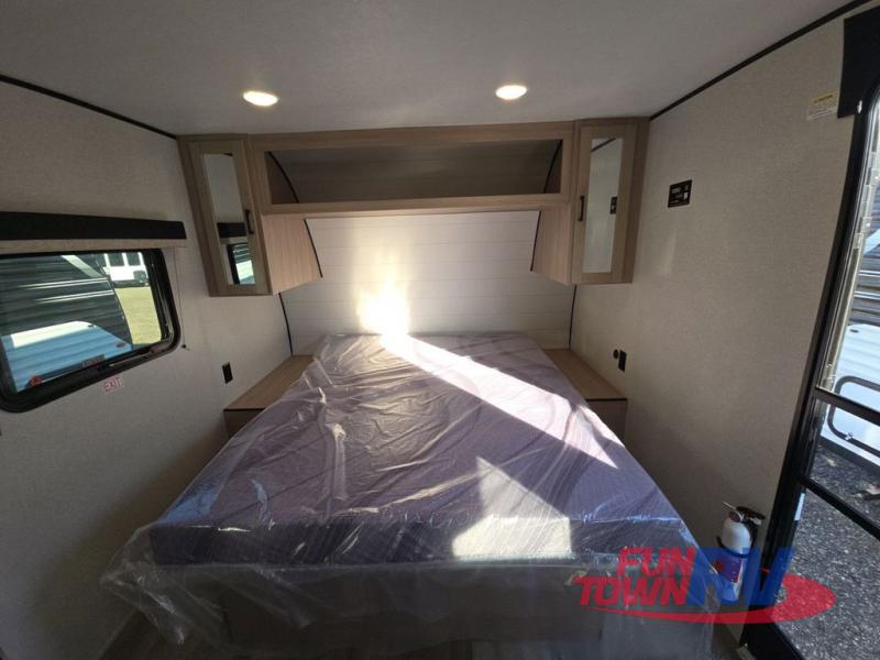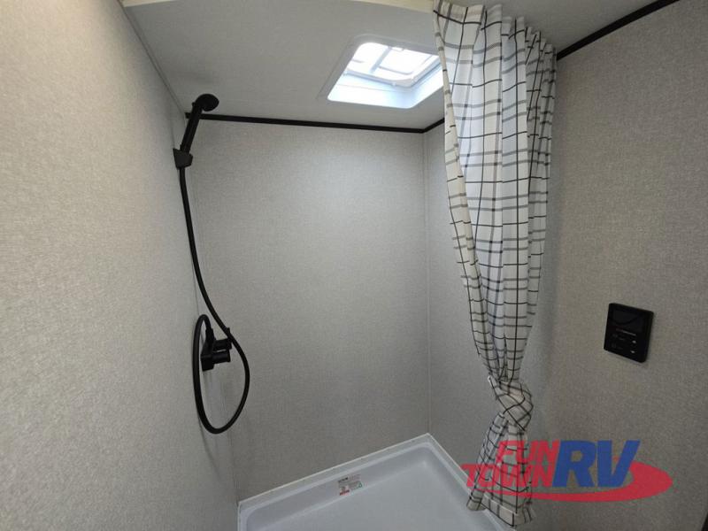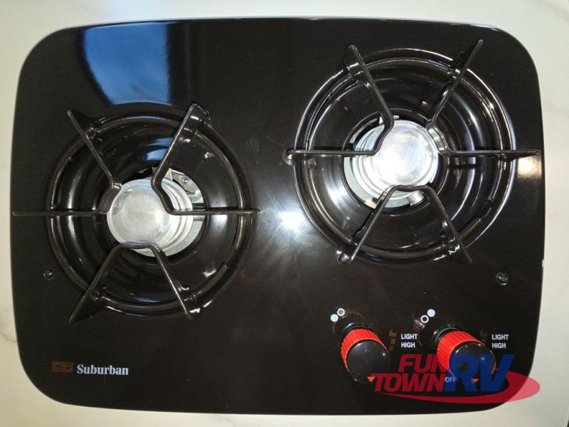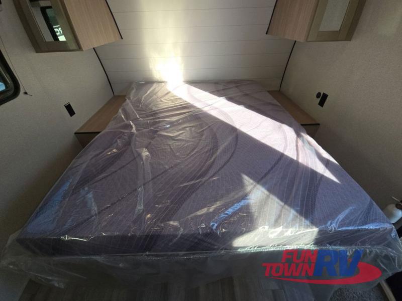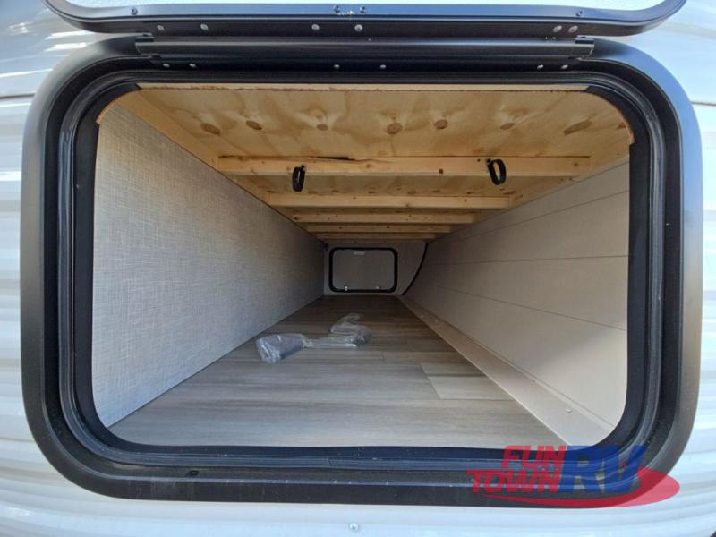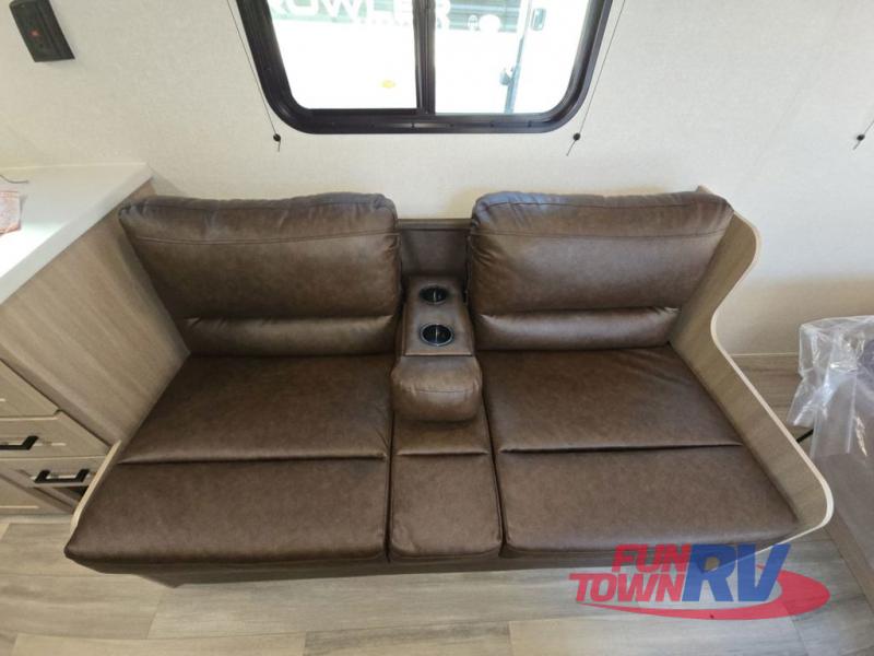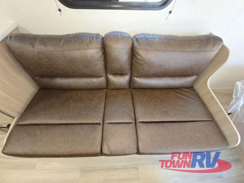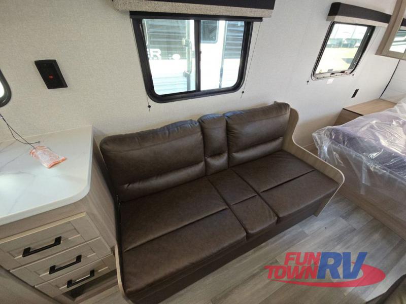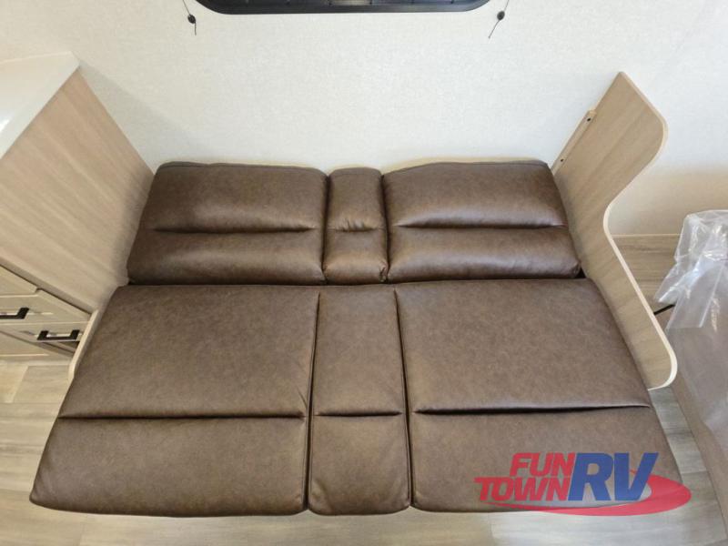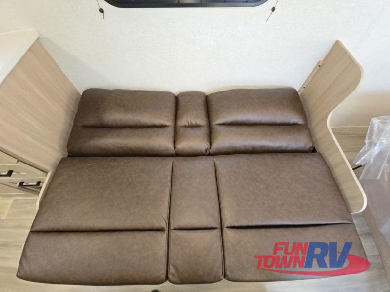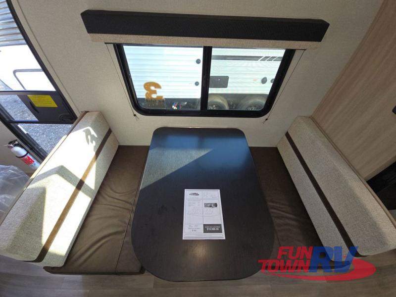 Weekend trips to the campground will be made unforgettable in this travel trailer for five to six. You will enjoy your own space in the front bedroom with a privacy curtain, RV queen bed and dual bedside wardrobes to keep your things tidy. If you have any guests staying over, then can convert the jack knife sofa and booth dinette back into seating spaces for breakfast in the morning. Speaking of breakfast, you'll have a three-burner cooktop and microwave oven to cook eggs and bacon, plus an 8-cu. ft. 12V refrigerator and pantry for food storage.