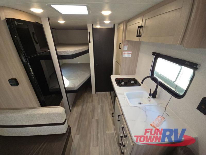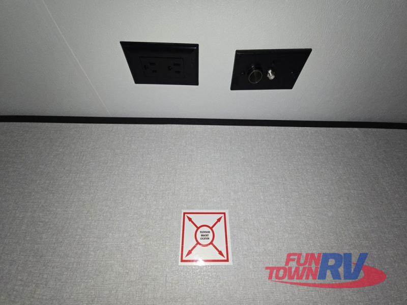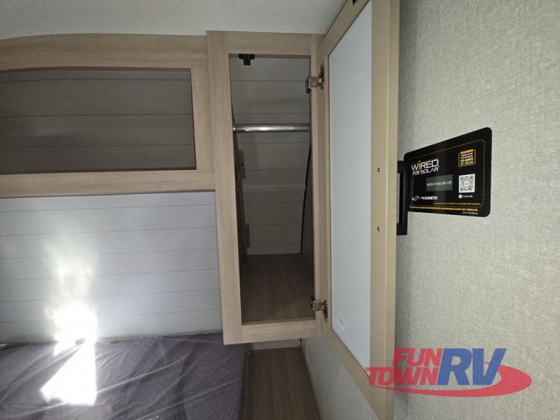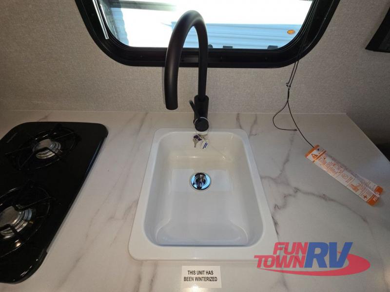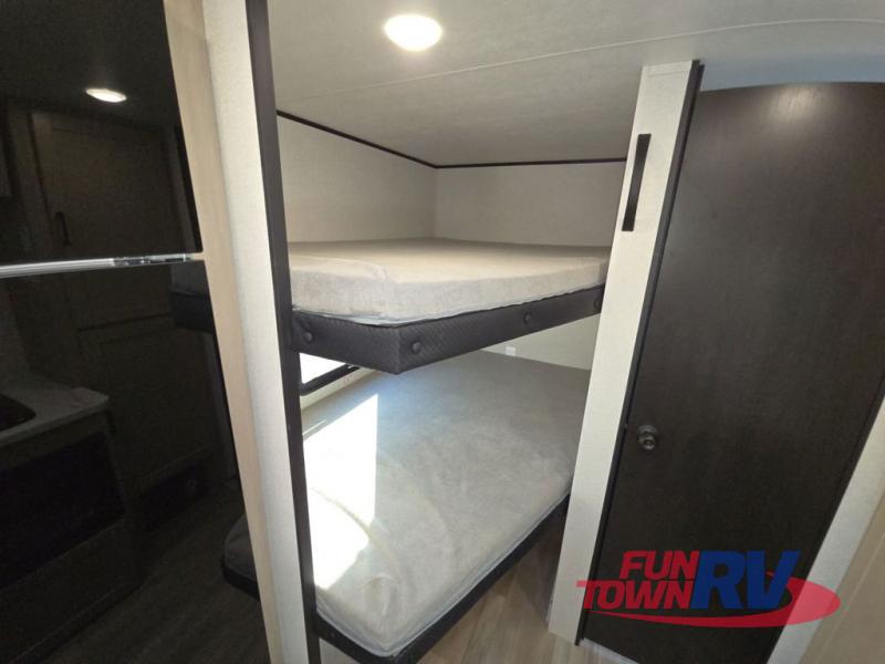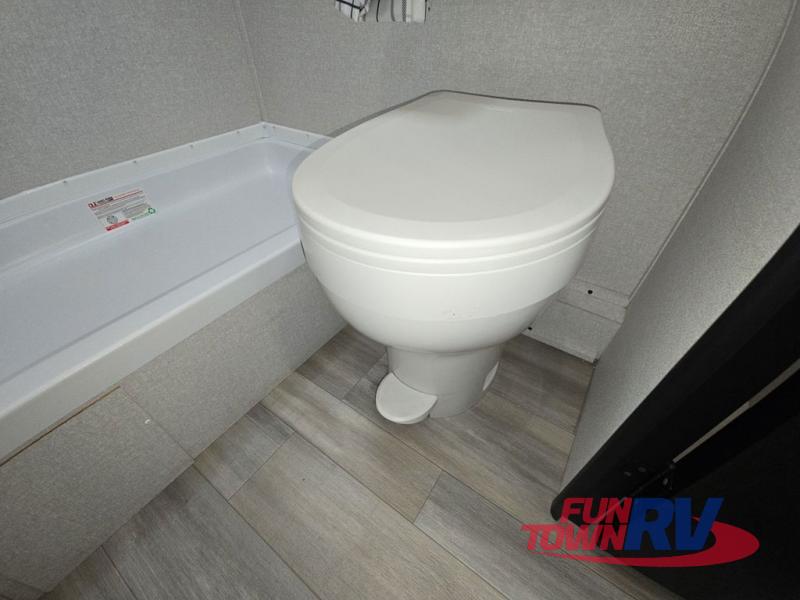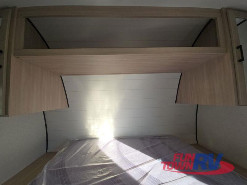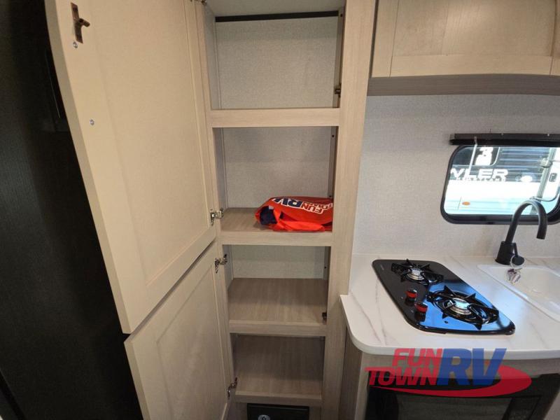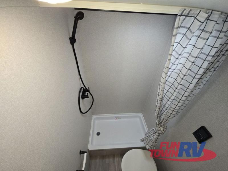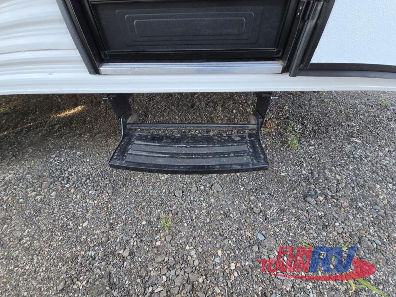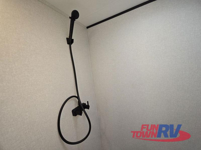 Weekend trips to the campground will be made unforgettable in this travel trailer for five to six. You will enjoy your own space in the front bedroom with a privacy curtain, RV queen bed and dual bedside wardrobes to keep your things tidy. If you have any guests staying over, then can convert the jack knife sofa and booth dinette back into seating spaces for breakfast in the morning. Speaking of breakfast, you'll have a three-burner cooktop and microwave oven to cook eggs and bacon, plus an 8-cu. ft. 12V refrigerator and pantry for food storage.