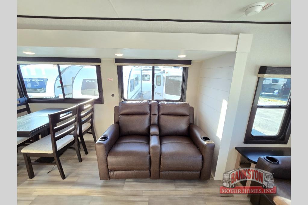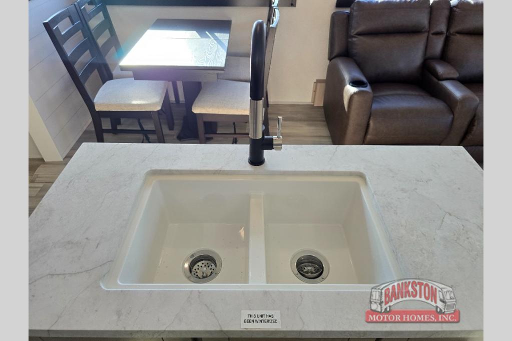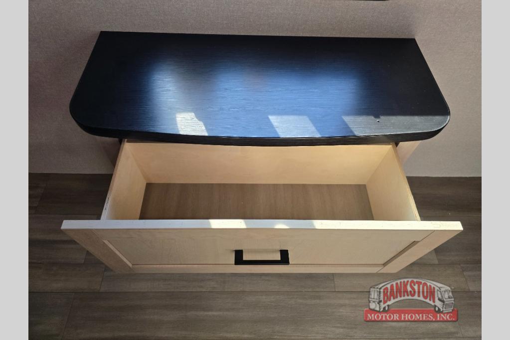 This travel trailer with triple slides will feel more like home with its spacious interior, front master bedroom, and rear living area with a sleeper sofa. The kitchen island will provide more counter space for the chef to prep food and clean up, and there is a booth dinette where you can all dine together. There is also a theater seat with cup holders in direct view of the entertainment center and fireplace. A dual entry bath is found towards the front, and a master bedroom with a queen bed is sure to provide a great night's rest. There is also a spacious bedroom wardrobe, a dresser, plus washer and dryer prep if you choose to add these appliances.