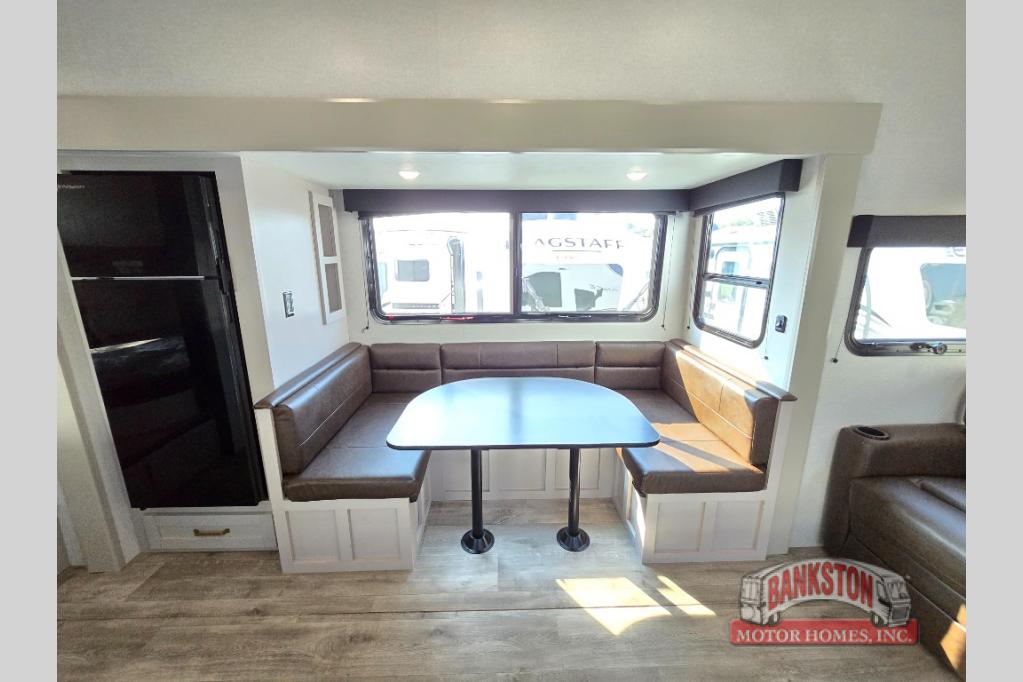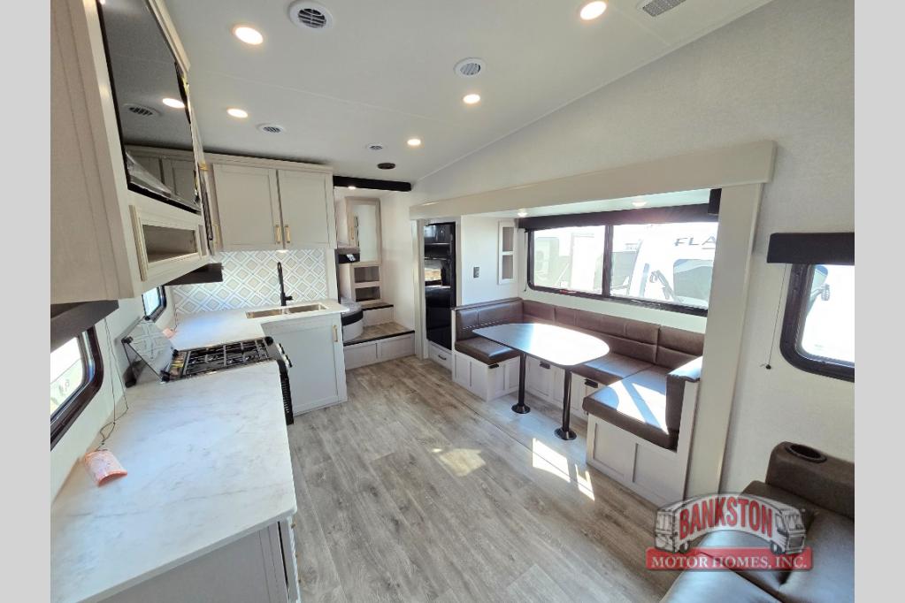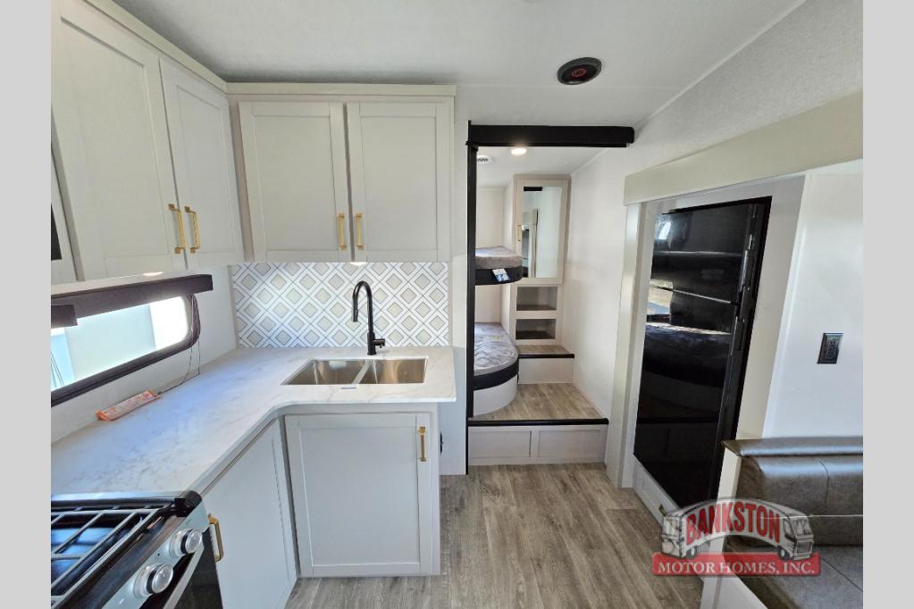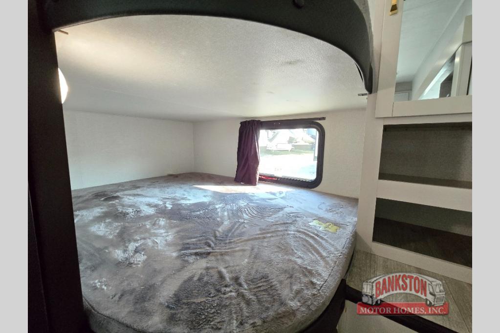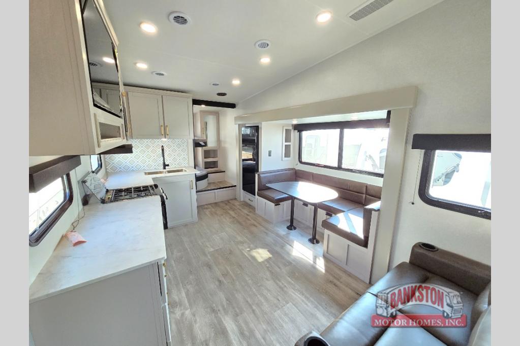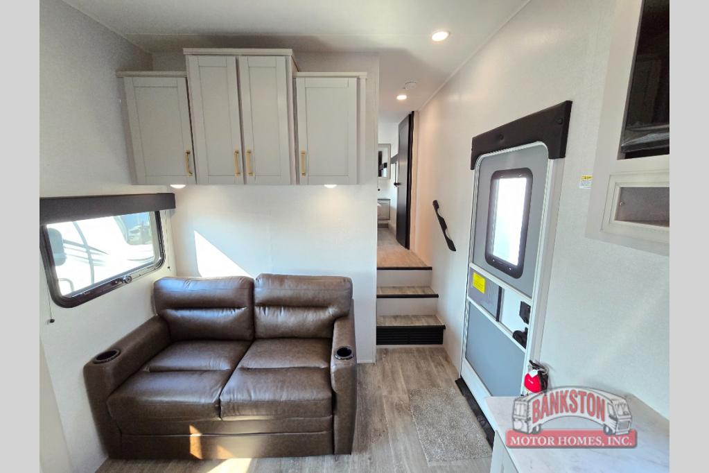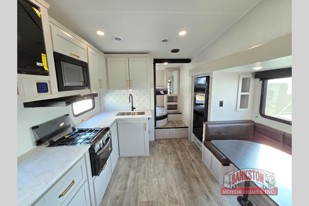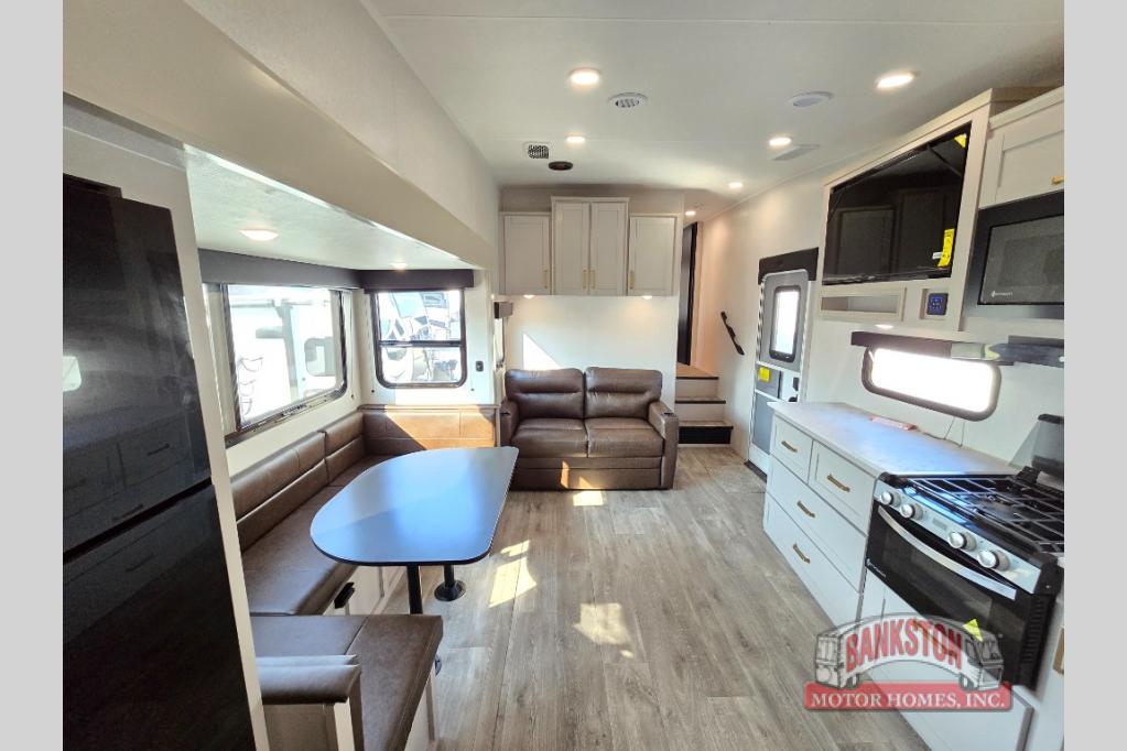 This fifth wheel's spacious interior boasts double-sized bunk beds designed for kids or guests, providing a comfortable sleeping space. A U-shaped dinette that offers ample seating and dining space for meals or even more sleeping space, as well as the 60” tri-fold sofa, which provides additional seating and can be converted into a comfortable sleeping area. In the kitchen area, you will find many amenities to cook delicious meals, such as a microwave, refrigerator, and overhead cabinets that will allow you to keep everything organized. The front bed is spacious, featuring a queen bed ideal for sleeping tight, and the full bath will complete the at-home experience since you will be able to take a refreshing shower on hot days!