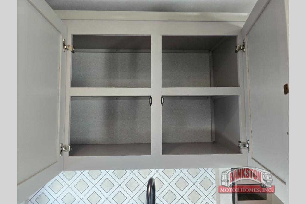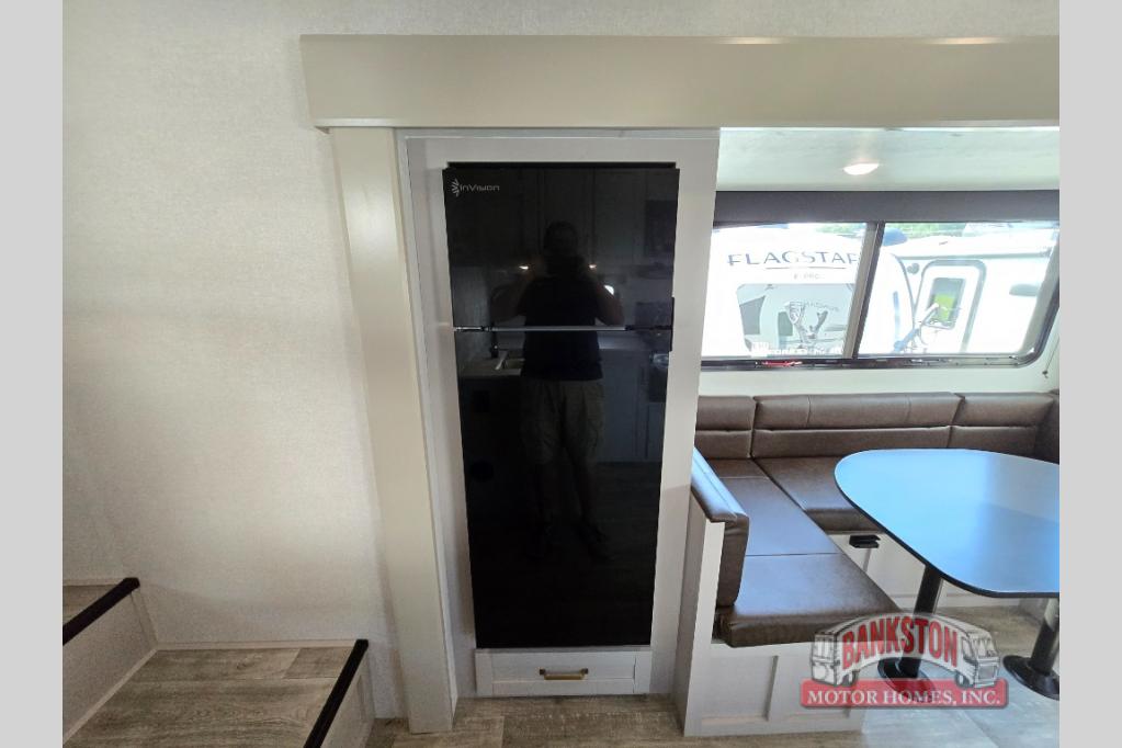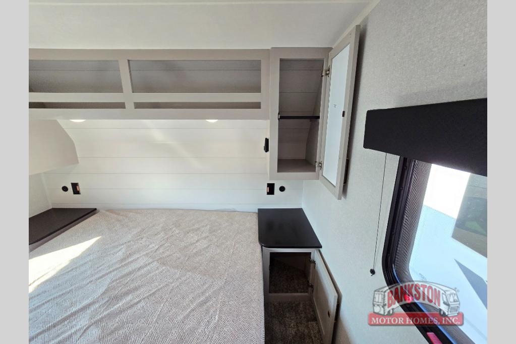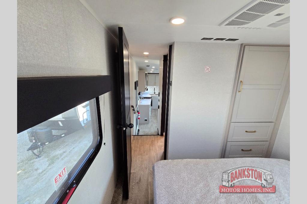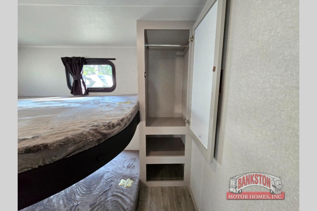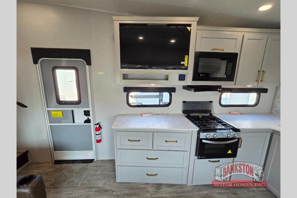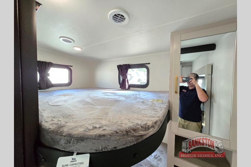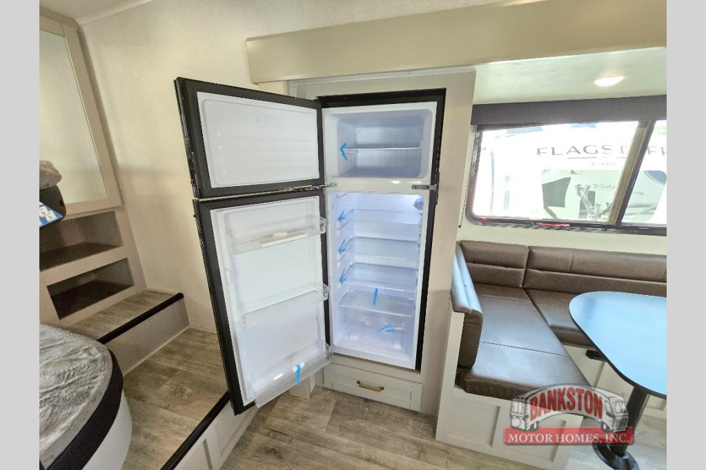 This fifth wheel's spacious interior boasts double-sized bunk beds designed for kids or guests, providing a comfortable sleeping space. A U-shaped dinette that offers ample seating and dining space for meals or even more sleeping space, as well as the 60” tri-fold sofa, which provides additional seating and can be converted into a comfortable sleeping area. In the kitchen area, you will find many amenities to cook delicious meals, such as a microwave, refrigerator, and overhead cabinets that will allow you to keep everything organized. The front bed is spacious, featuring a queen bed ideal for sleeping tight, and the full bath will complete the at-home experience since you will be able to take a refreshing shower on hot days!