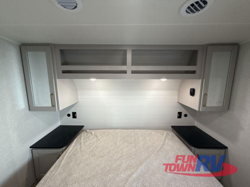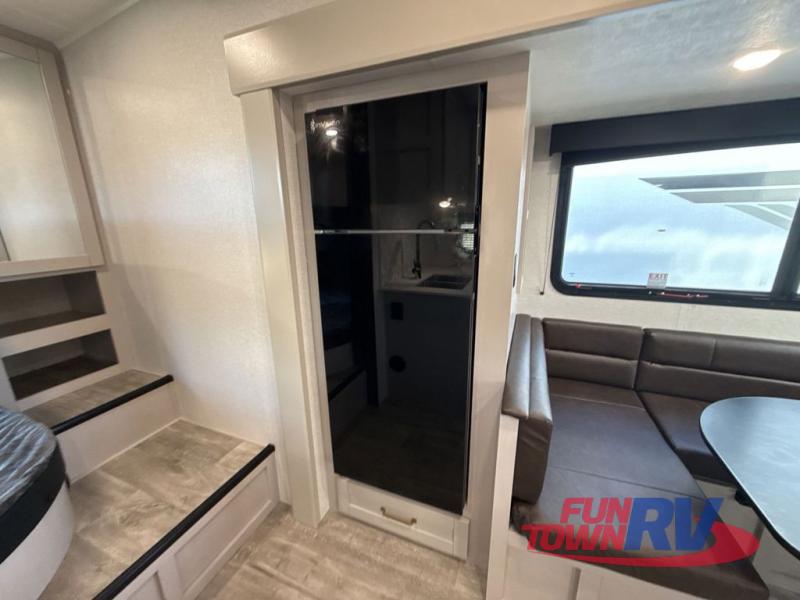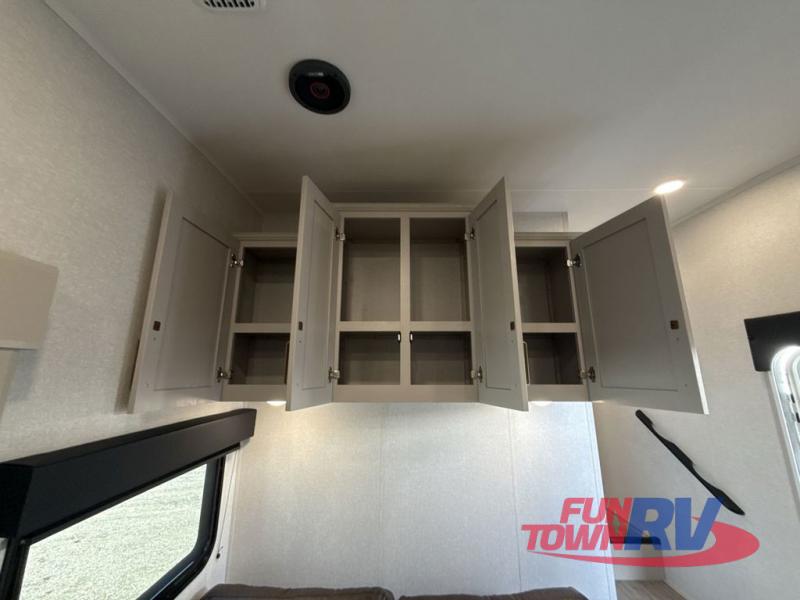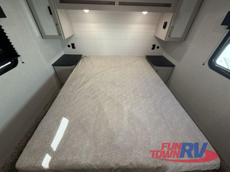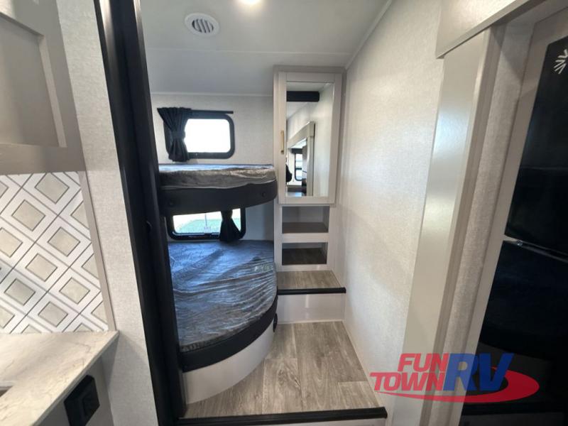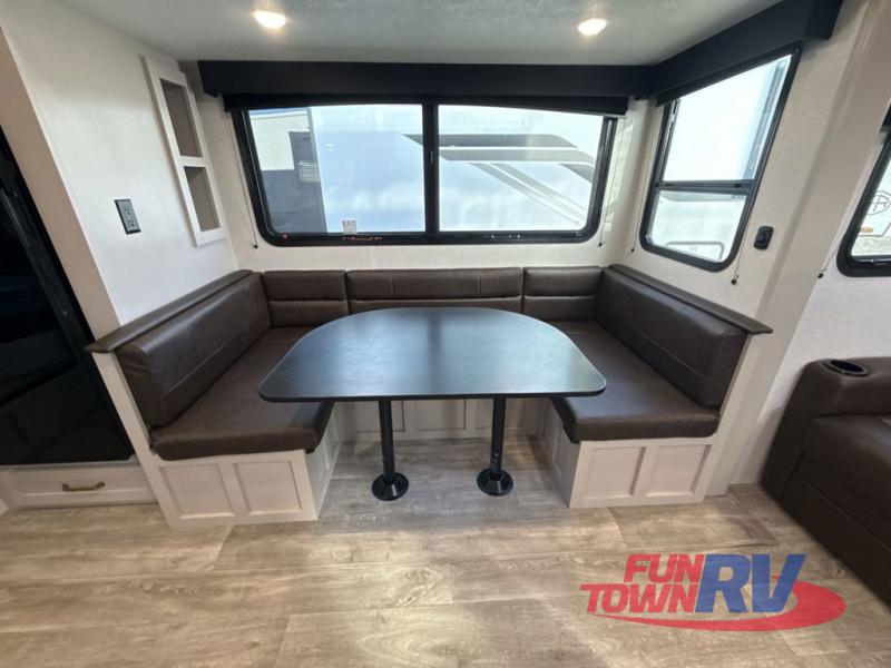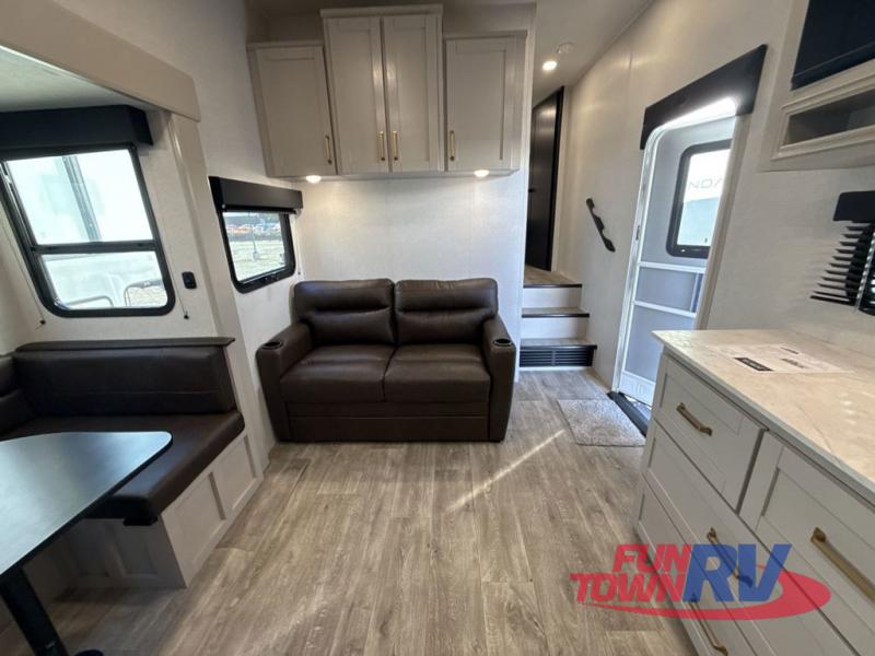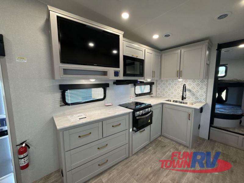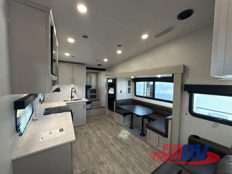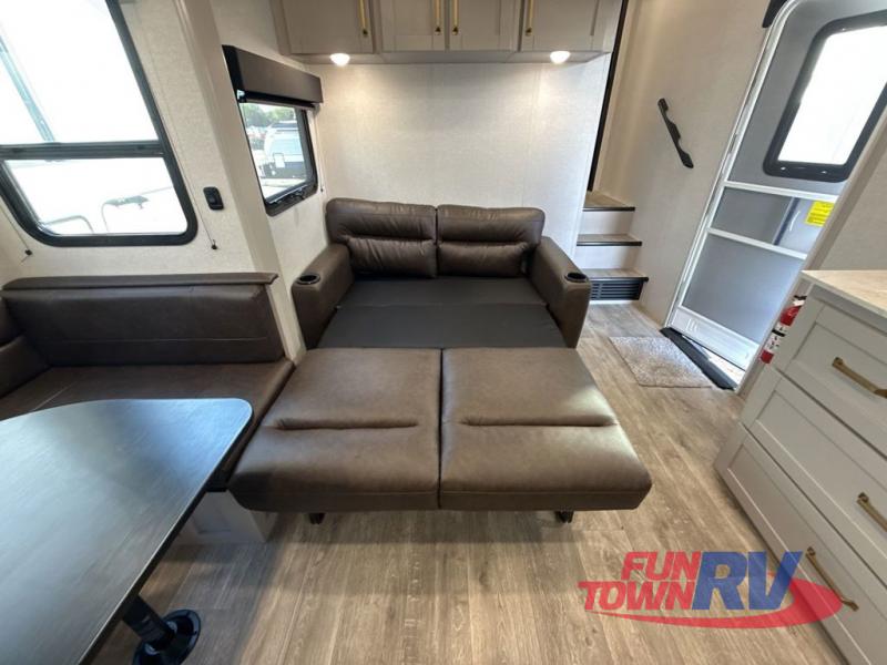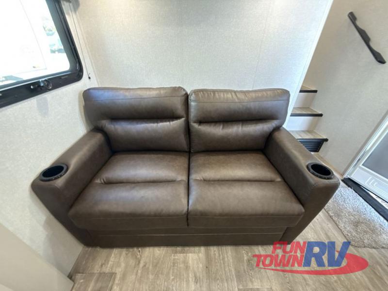 This fifth wheel's spacious interior boasts double-sized bunk beds designed for kids or guests, providing a comfortable sleeping space. A U-shaped dinette that offers ample seating and dining space for meals or even more sleeping space, as well as the 60” tri-fold sofa, which provides additional seating and can be converted into a comfortable sleeping area. In the kitchen area, you will find many amenities to cook delicious meals, such as a microwave, refrigerator, and overhead cabinets that will allow you to keep everything organized. The front bed is spacious, featuring a queen bed ideal for sleeping tight, and the full bath will complete the at-home experience since you will be able to take a refreshing shower on hot days!