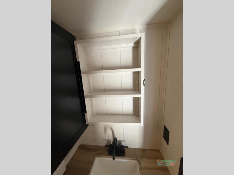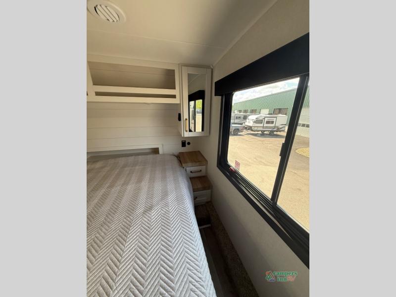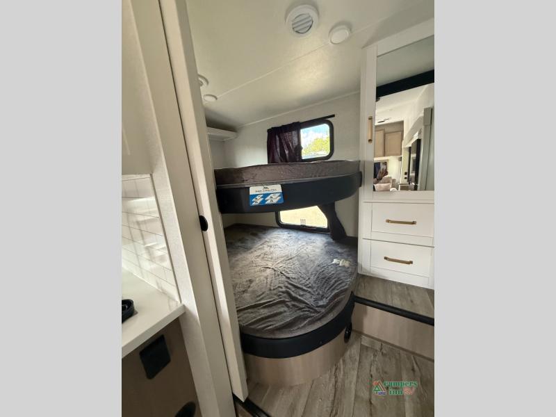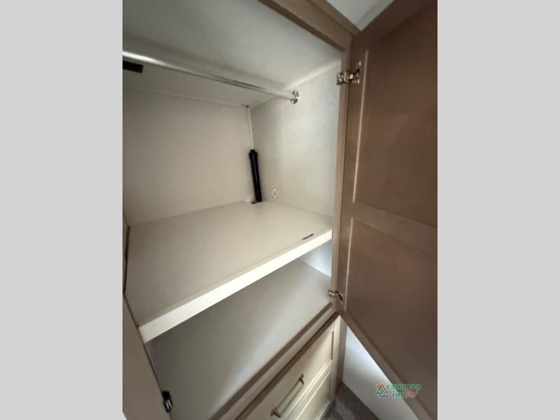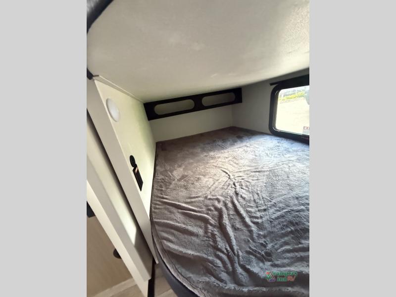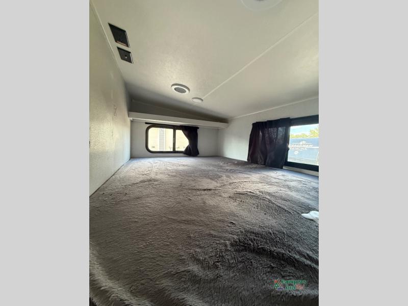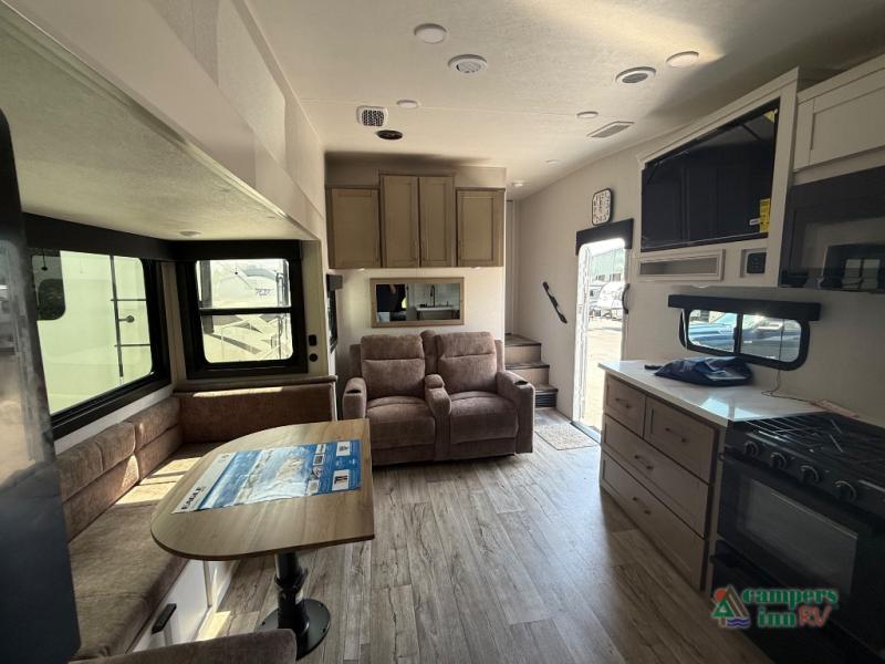 If you're needing a fifth wheel with more sleeping space, this unit will be perfect for you! There are double-size bunks in the back with a wardrobe for your guests' things and TV prep if you want to add a TV here. The front private bedroom up front will have you feeling right at home with its Olympic queen bed and dual wardrobes, and any additional guests you have can sleep on the U-shaped dinette within the slide out. There is also a theater seat here where you can relax with a good book in the evenings.