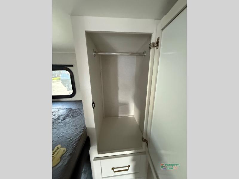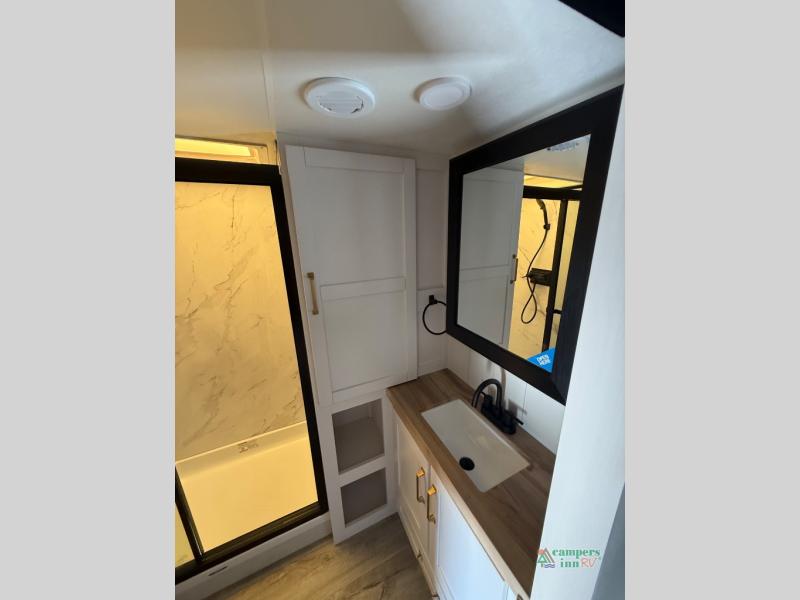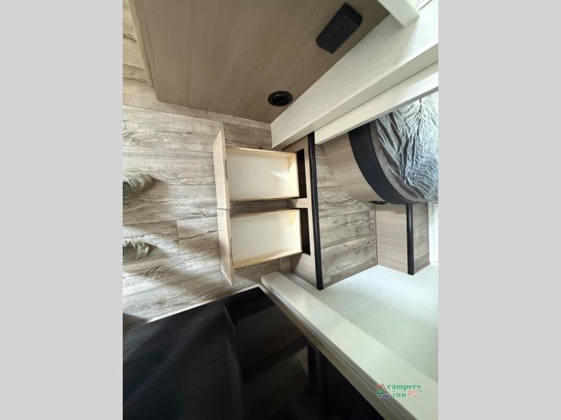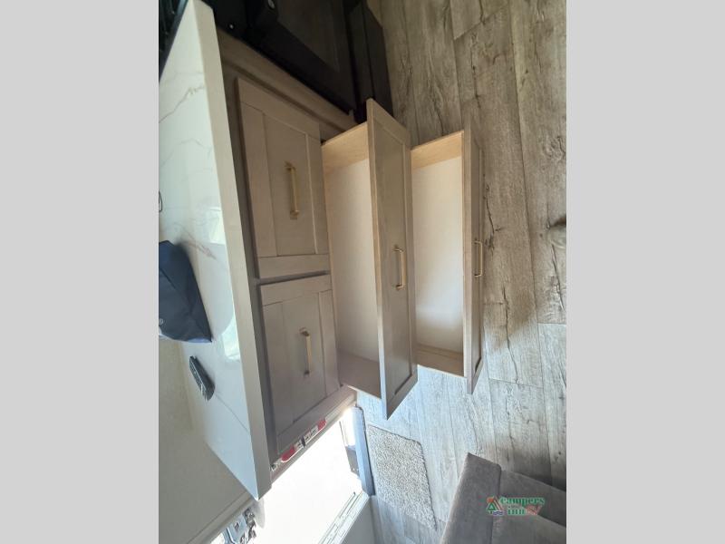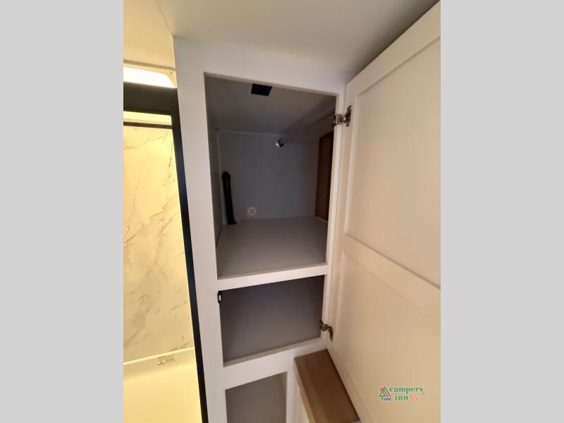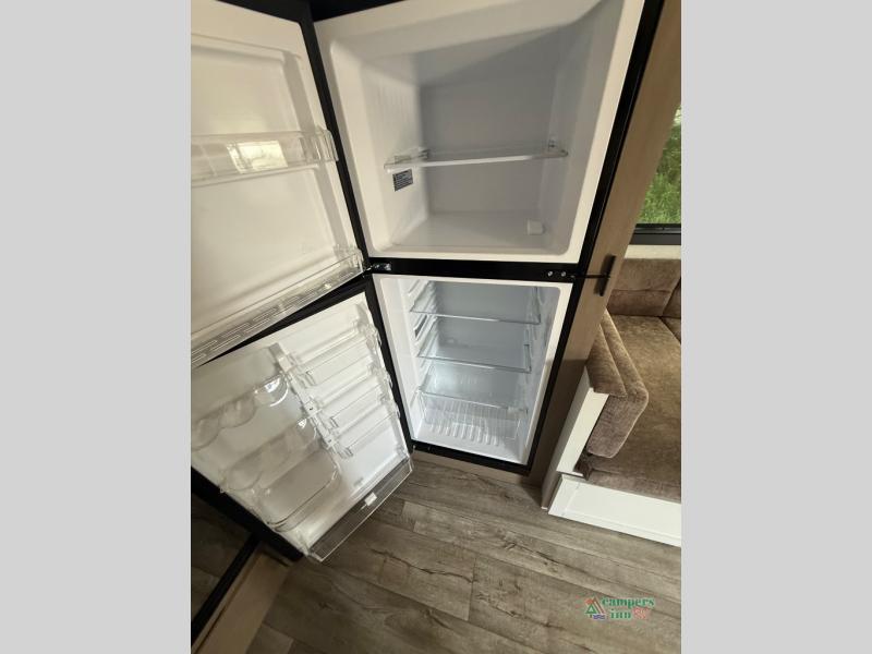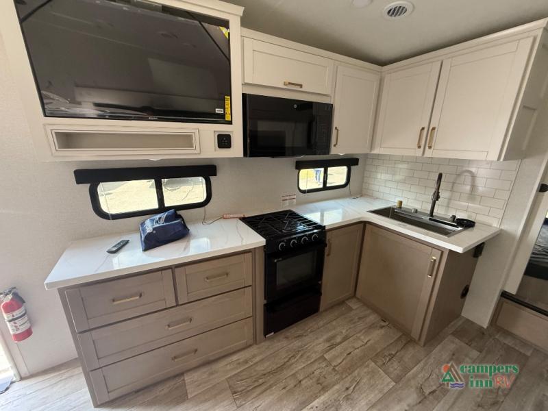 If you're needing a fifth wheel with more sleeping space, this unit will be perfect for you! There are double-size bunks in the back with a wardrobe for your guests' things and TV prep if you want to add a TV here. The front private bedroom up front will have you feeling right at home with its Olympic queen bed and dual wardrobes, and any additional guests you have can sleep on the U-shaped dinette within the slide out. There is also a theater seat here where you can relax with a good book in the evenings.