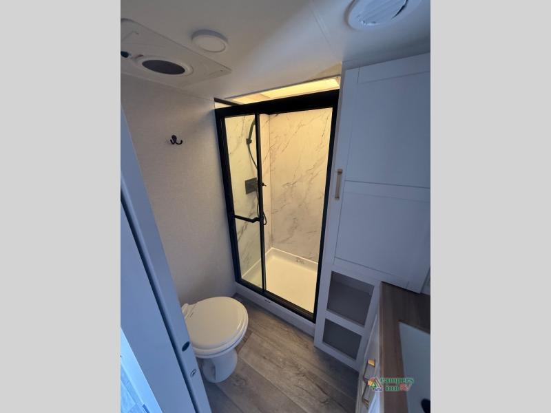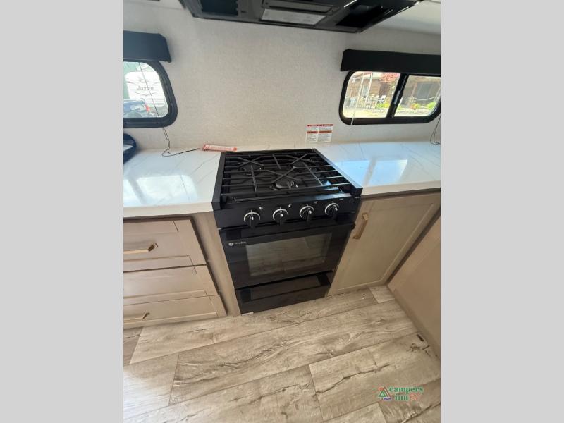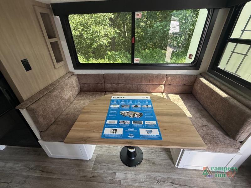 With any Eagle HT fifth wheel or travel trailer by Jayco you will enjoy a smooth drive thanks to the 4 Star Handling Package, Goodyear Endurance tires, and MORryde CRE-3000 rubberized suspension. The Customer Value Package includes amenities that are sure to make camping easier than ever, like the 60K on-demand water heater, Keyed-Alike lock system, 15,000 BTU "Whisper Quiet" A/C, and more. Handcrafted and glazed door/drawer fronts will make your space feel more like home, along with residential vinyl flooring throughout, GE appliances, and blackout roller shades with reflective side throughout to keep the sun out when you want to sleep in. Each model also includes a NuVo H2O water treatment system with filters included, interior and exterior "Blue Sync" audio connect with MB Quart Sound for your TV and phone, and 100% no floor vents for added comfort and convenience!