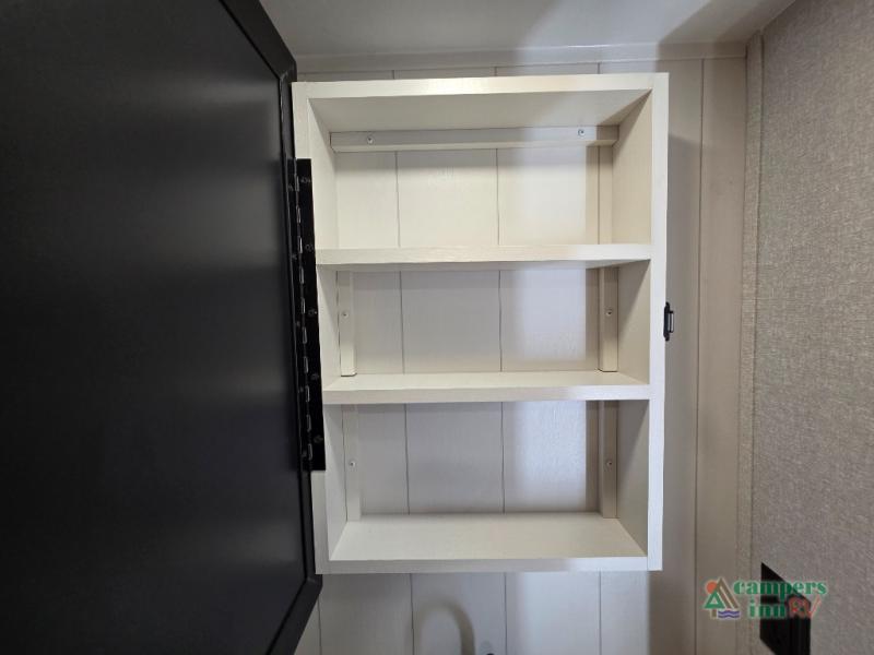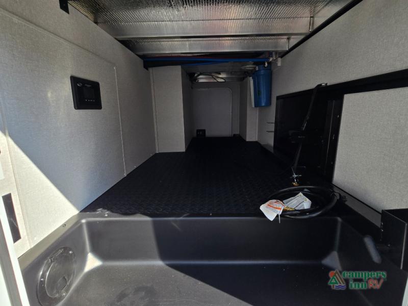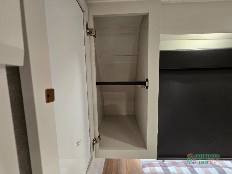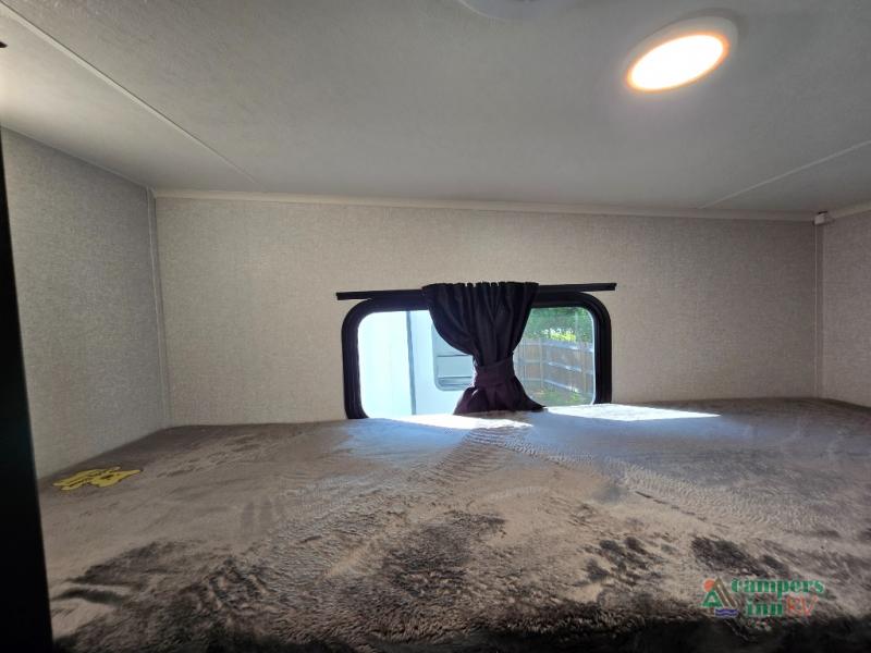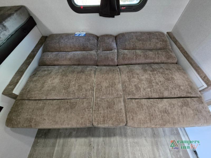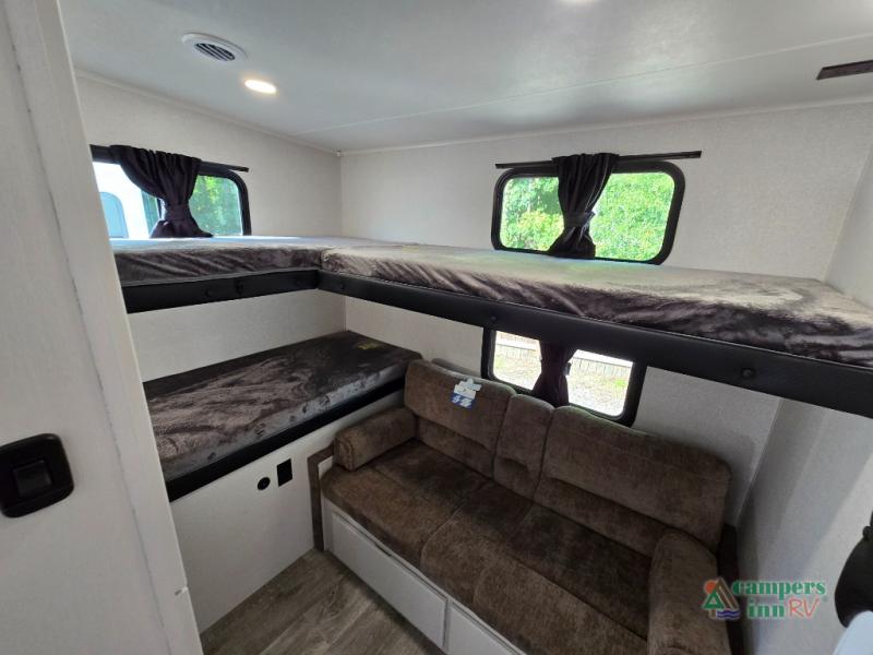 Rear Private Bunkhouse – Bunk beds, a jack-knife sofa with an overhead bunk, plus a bike storage door for gear.