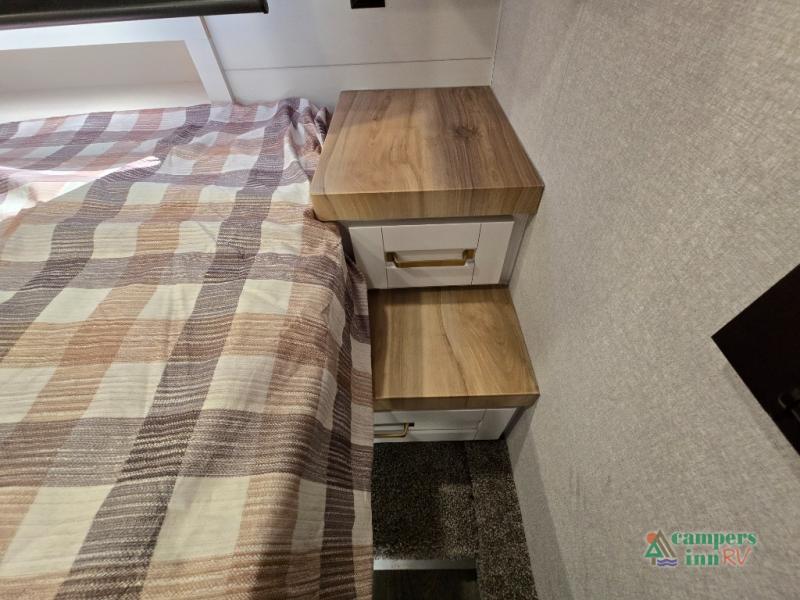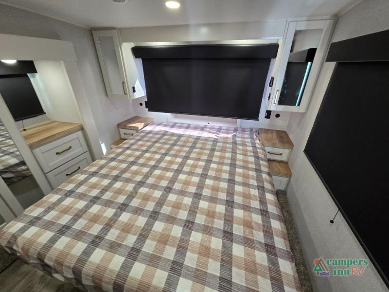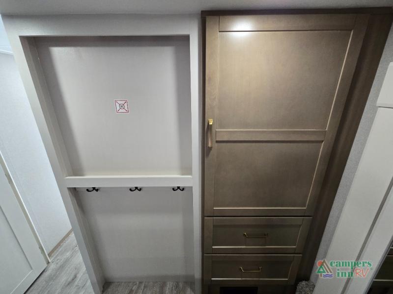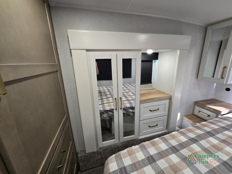 Front Private Bedroom – Olympic queen bed, wardrobe slide, and washer/dryer prep for extended stays.