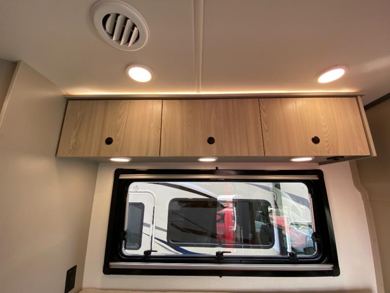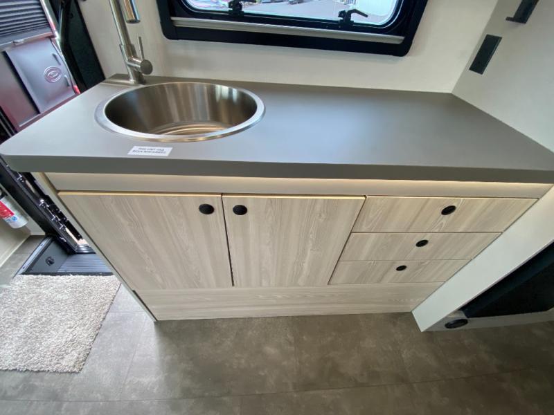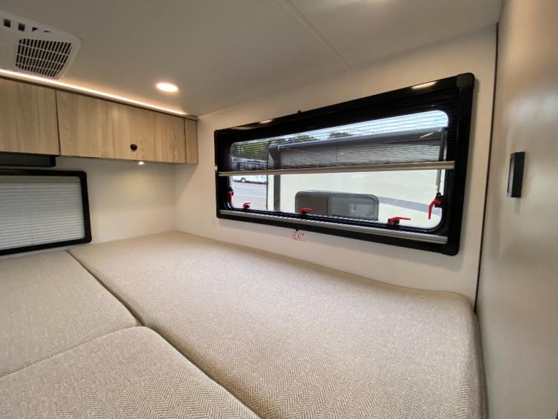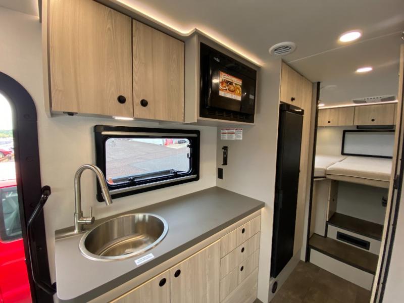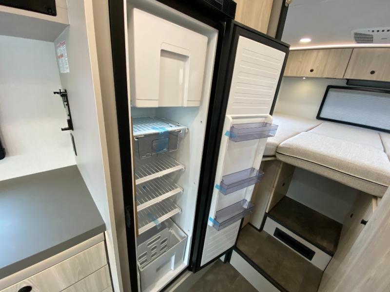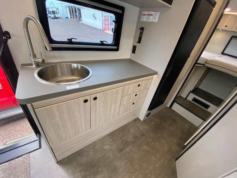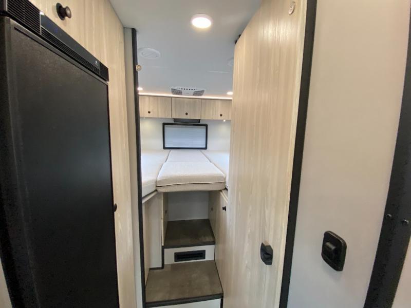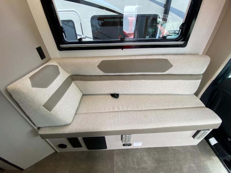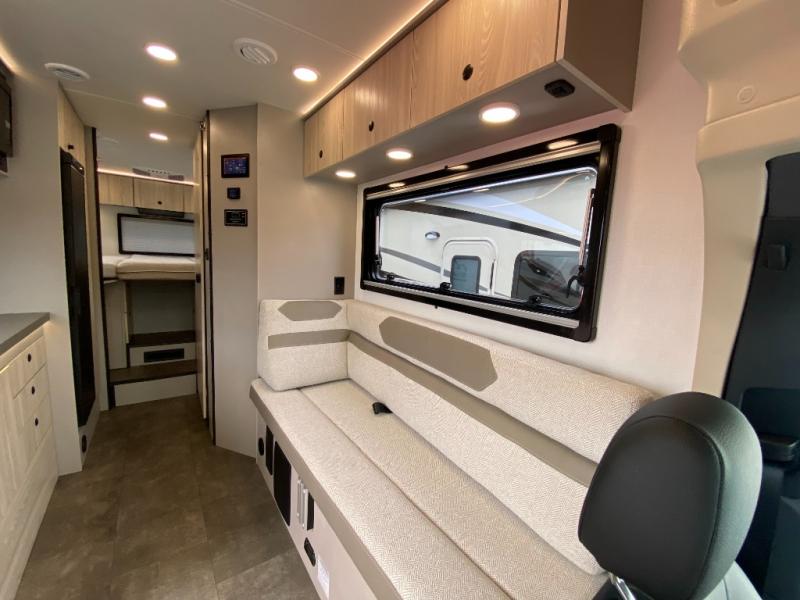 Whether you're roughing it in the mountains or relaxing in the woods, this coach is sure to meet all your needs. The swivel seats can turn around once you're parked to become a part of the living space, and you'll also find a 68" bench with removable tables here where you can enjoy your coffee at each morning. There is an induction cooktop and a convection microwave to prepare dinner, a 5.3 cu. ft. 12V refrigerator to store cold items, and even a pantry for snacks! This van is perfect for couples or friends since there are twin beds with a king bed conversion so you can choose two beds or one big bed, and the optional pop-top can be added if you're needing additional sleeping space!