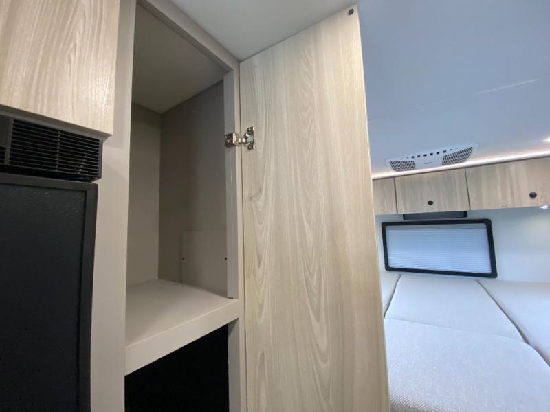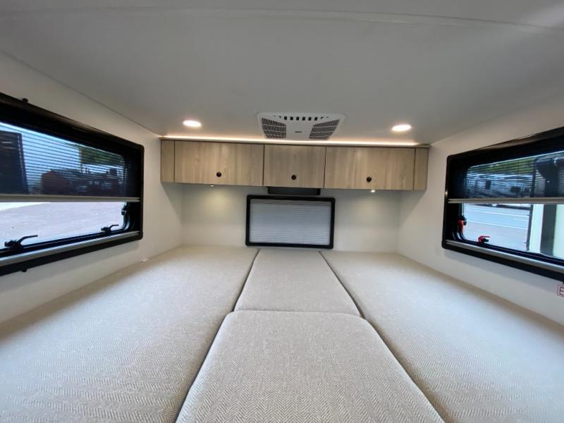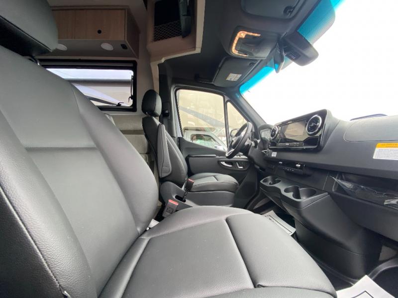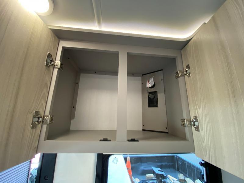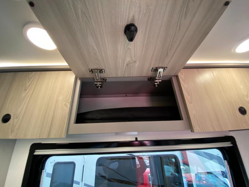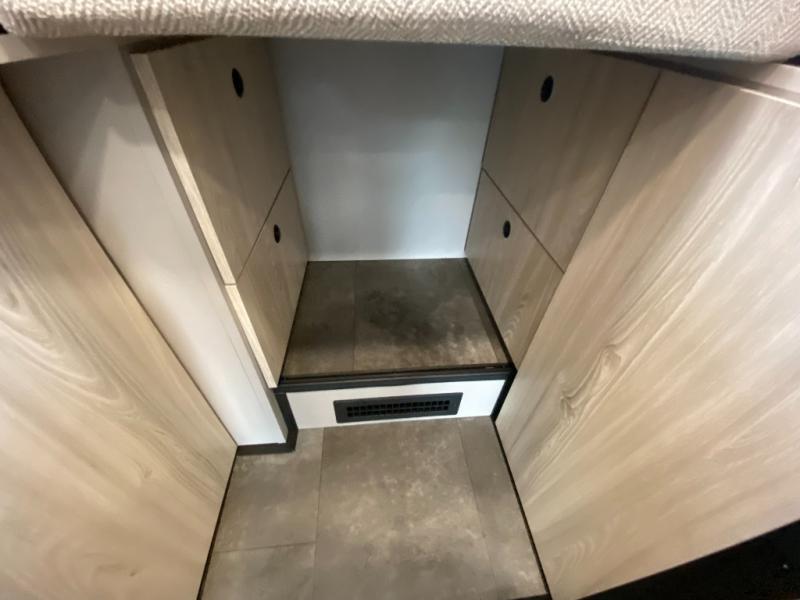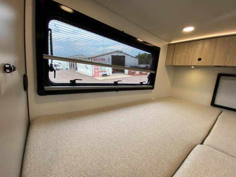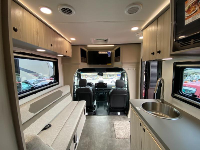 Whether you're roughing it in the mountains or relaxing in the woods, this coach is sure to meet all your needs. The swivel seats can turn around once you're parked to become a part of the living space, and you'll also find a 68" bench with removable tables here where you can enjoy your coffee at each morning. There is an induction cooktop and a convection microwave to prepare dinner, a 5.3 cu. ft. 12V refrigerator to store cold items, and even a pantry for snacks! This van is perfect for couples or friends since there are twin beds with a king bed conversion so you can choose two beds or one big bed, and the optional pop-top can be added if you're needing additional sleeping space!