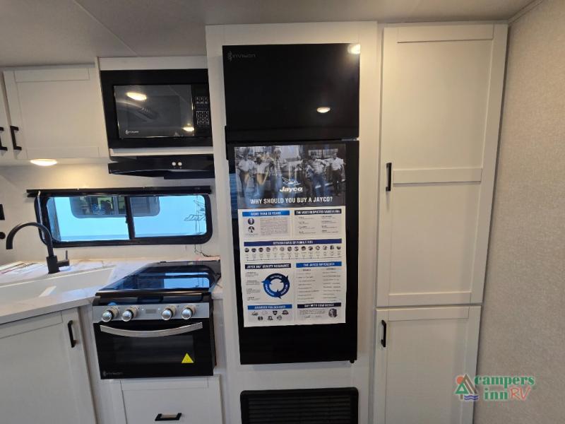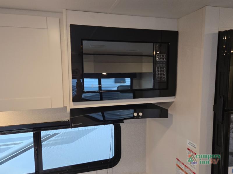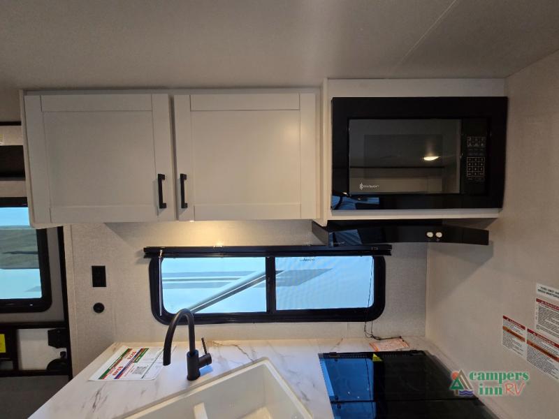 Well-Appointed Kitchen – 3-burner cooktop, microwave, and an 8 cu. ft. 12V refrigerator to feed the whole crew.