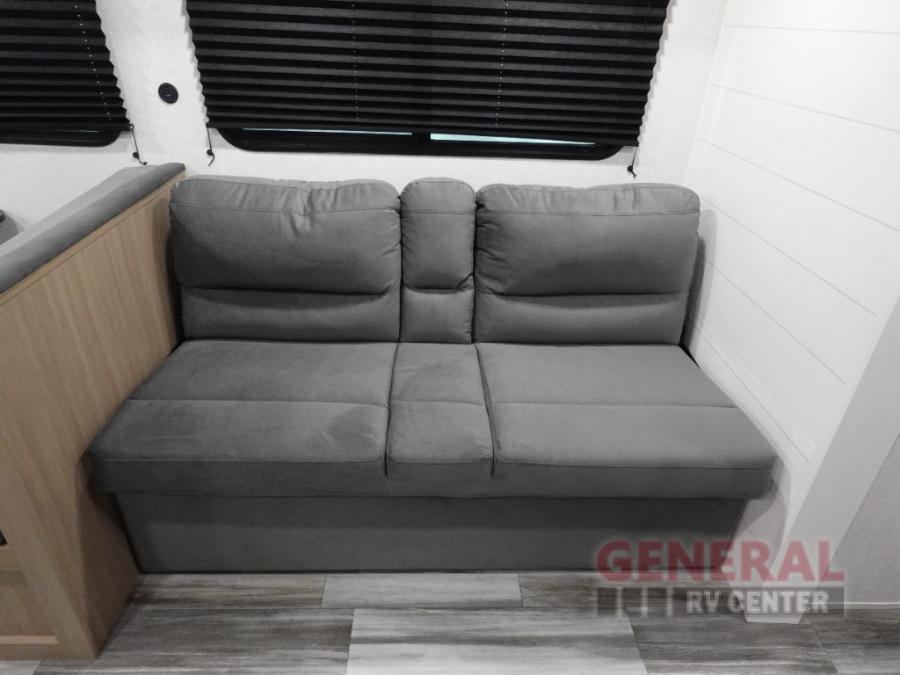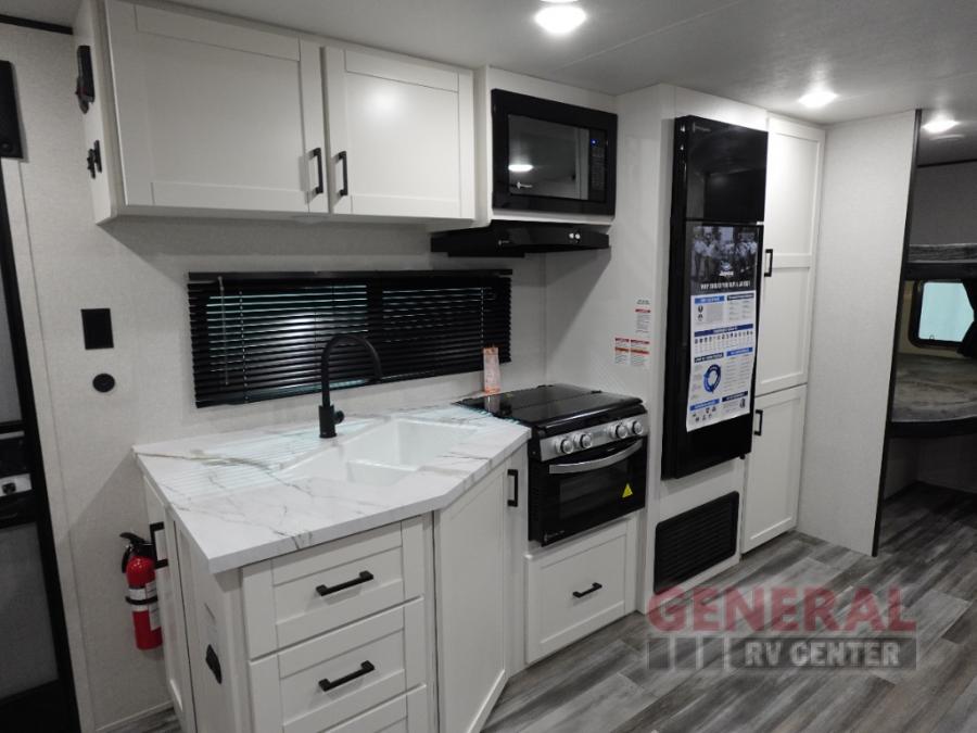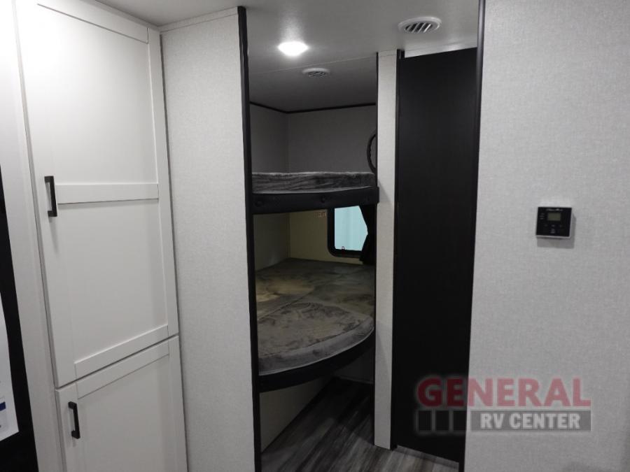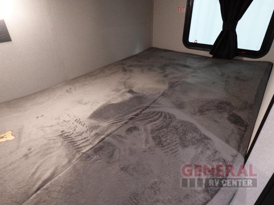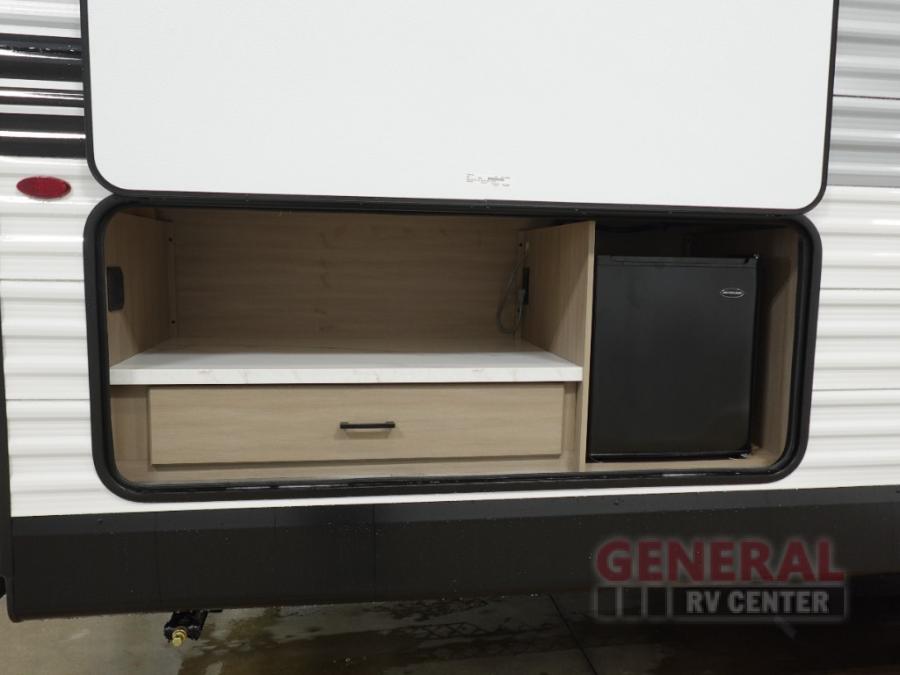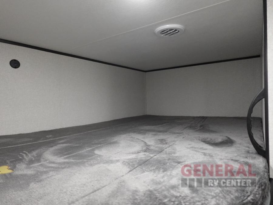You can comfortably sleep up to ten people in this trailer thanks to the double-size bunks in back, the RV queen bed in the front bedroom, plus the booth dinette and jack-knife sofa in the main living area! The chef of your crew will have a three burner cooktop and microwave oven to prepare meals, and everyone can store their favorite drinks in the 8 cu. ft. 12V refrigerator inside, or in the outdoor refrigerator for convenience. The rear corner bathroom includes a tub/shower and a toilet, with the sink just outside of this room so others can brush their teeth if one is taking a shower before bed. The outside storage is accessible on both sides of the unit and will easily allow you bring along camp chairs, yard games and more. A 16' powered awning with LED lights will create a nice place to gather in the evenings with family and friends!