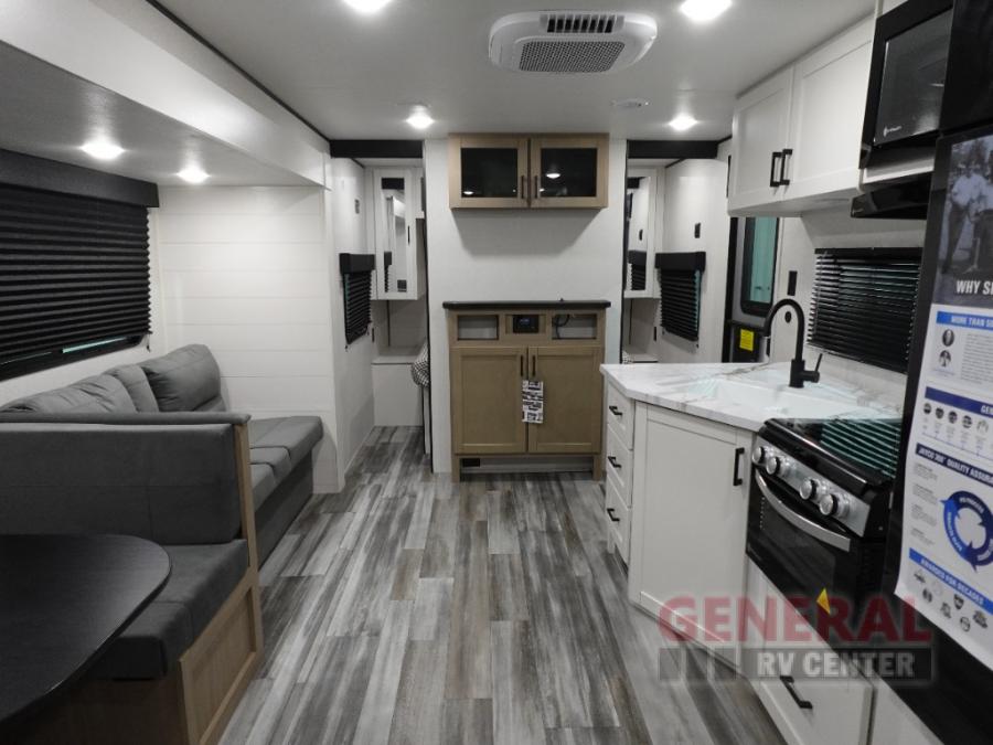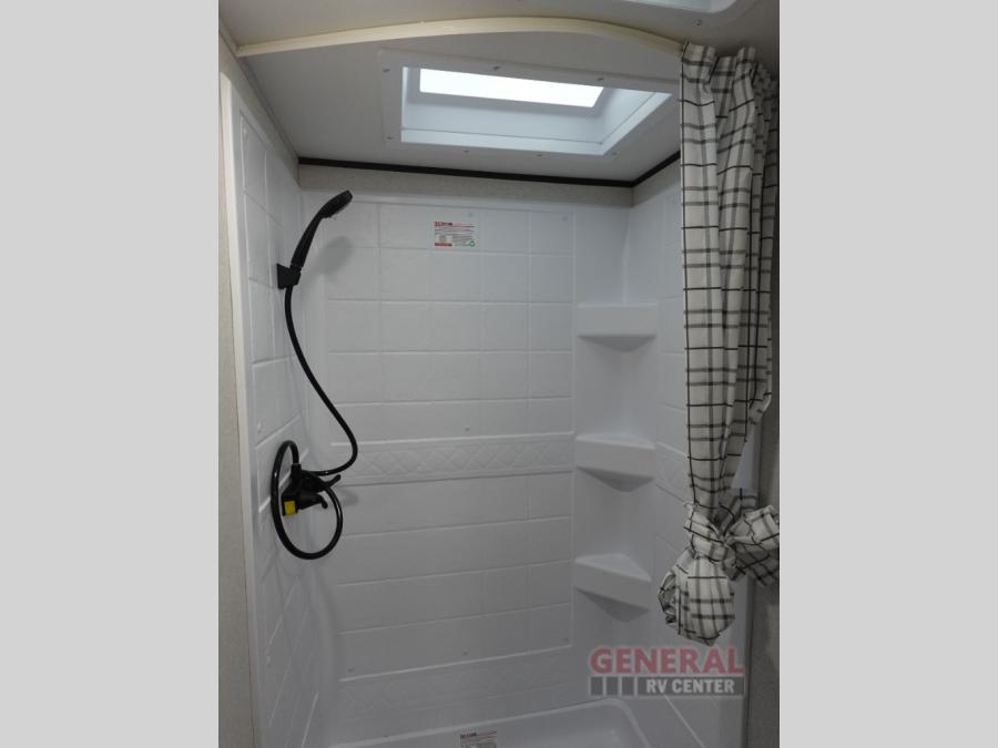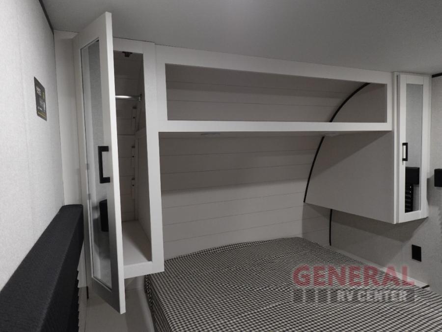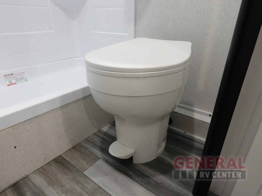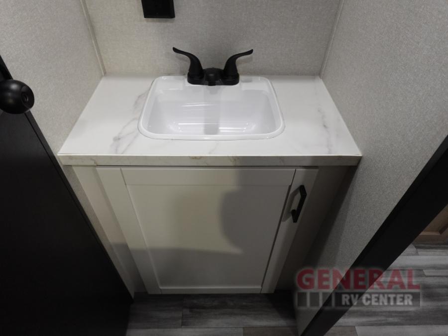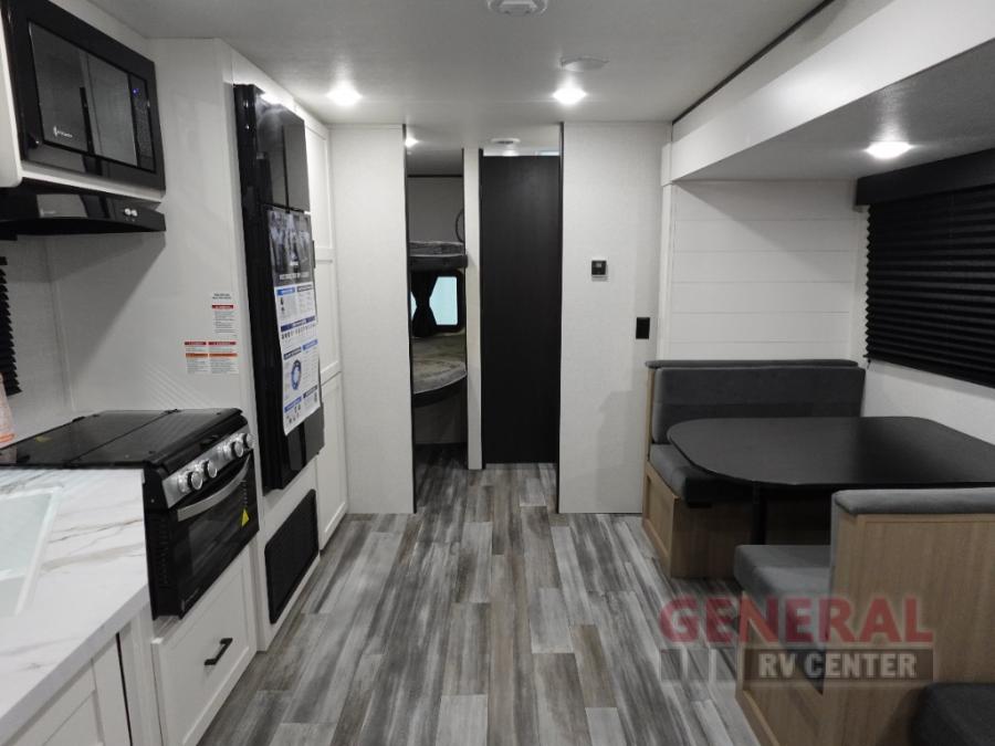 You can comfortably sleep up to ten people in this trailer thanks to the double-size bunks in back, the RV queen bed in the front bedroom, plus the booth dinette and jack-knife sofa in the main living area! The chef of your crew will have a three burner cooktop and microwave oven to prepare meals, and everyone can store their favorite drinks in the 8 cu. ft. 12V refrigerator inside, or in the outdoor refrigerator for convenience. The rear corner bathroom includes a tub/shower and a toilet, with the sink just outside of this room so others can brush their teeth if one is taking a shower before bed. The outside storage is accessible on both sides of the unit and will easily allow you bring along camp chairs, yard games and more. A 16' powered awning with LED lights will create a nice place to gather in the evenings with family and friends!