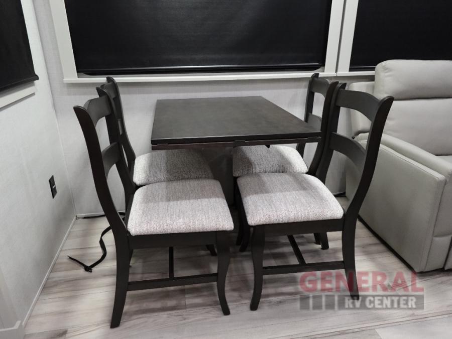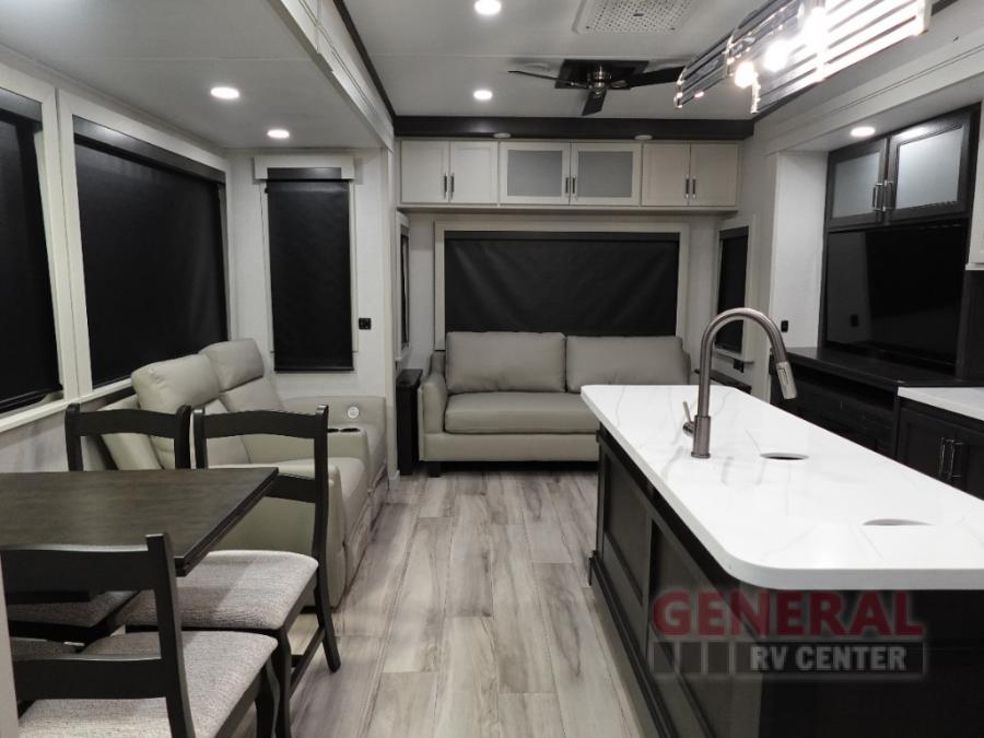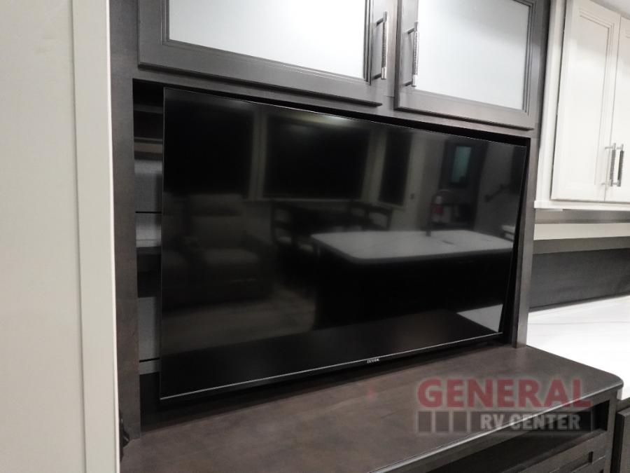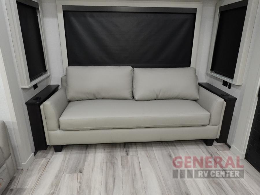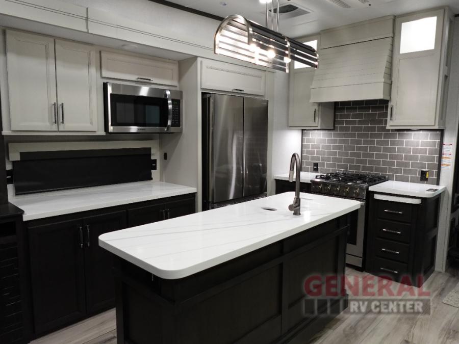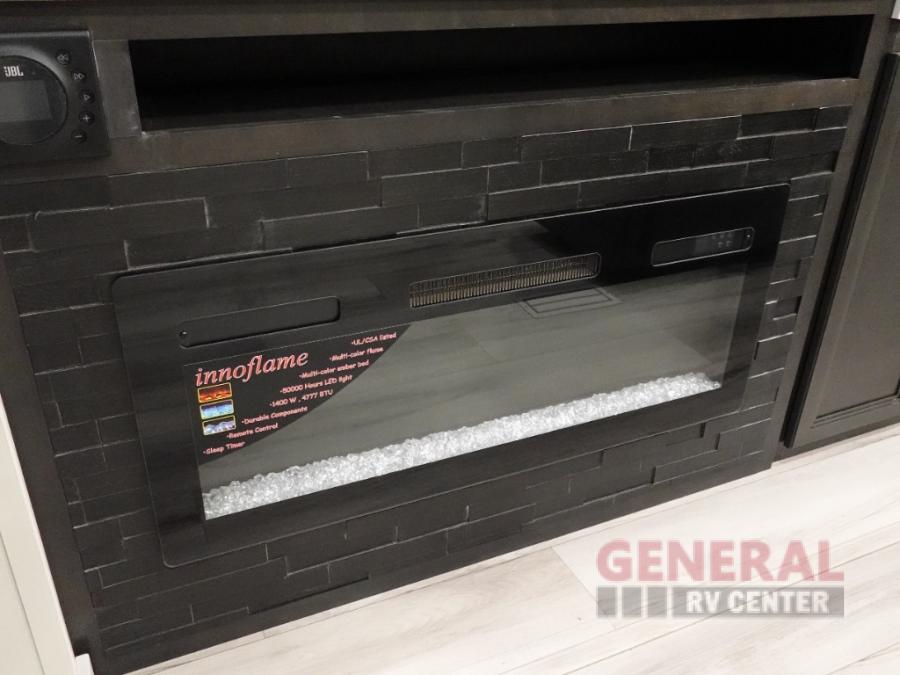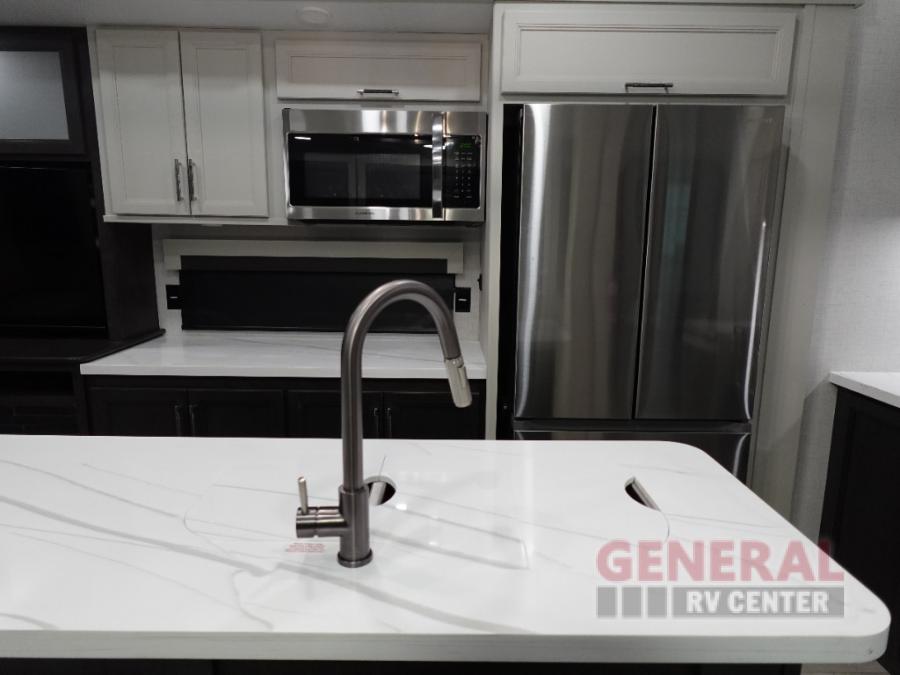You will feel right at home camping in this fifth wheel! The chef will have lots of countertop space to prepare their best meals along with a kitchen island, two pull-out pantries to store your dishes, and an 18 cu. ft. residential refrigerator to store any leftovers. The free standing dinette offers a comfortable place to enjoy your meals, and the theater seating across from the fireplace and entertainment center will be perfect for movie nights. There is also a rear hide-a-bed sofa sleeper for any guests you may have. You will love the full bath that includes a shower with a seat, a linen closet, plus two bath sinks for convenience. And don't overlook the front bedroom with a sliding door, king bed slide out, and master closet for all your things. You'll also find stackable washer and dryer prep, two drawers, and a Smart HDTV for movies in bed.