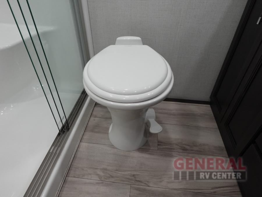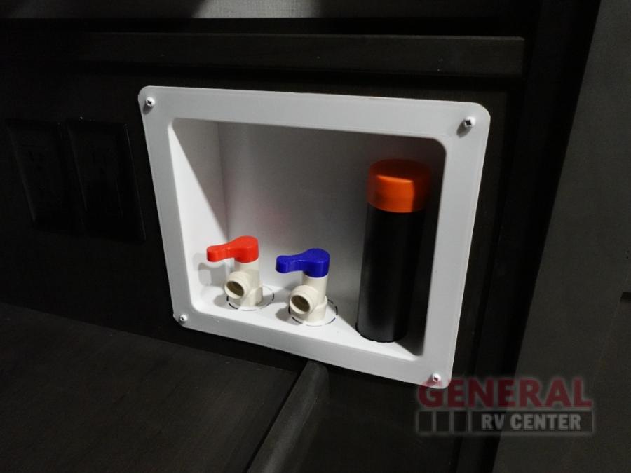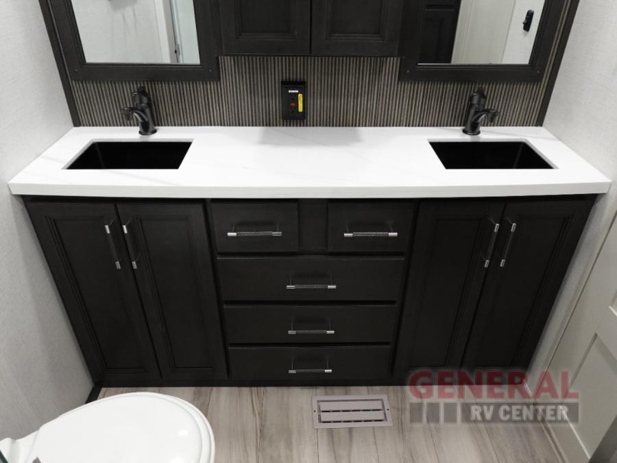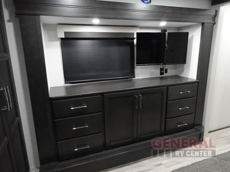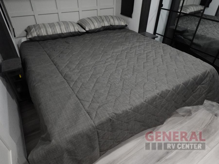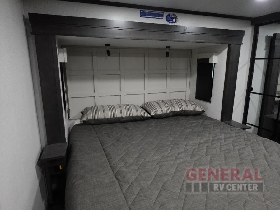 You will feel right at home camping in this fifth wheel! The chef will have lots of countertop space to prepare their best meals along with a kitchen island, two pull-out pantries to store your dishes, and an 18 cu. ft. residential refrigerator to store any leftovers. The free standing dinette offers a comfortable place to enjoy your meals, and the theater seating across from the fireplace and entertainment center will be perfect for movie nights. There is also a rear hide-a-bed sofa sleeper for any guests you may have. You will love the full bath that includes a shower with a seat, a linen closet, plus two bath sinks for convenience. And don't overlook the front bedroom with a sliding door, king bed slide out, and master closet for all your things. You'll also find stackable washer and dryer prep, two drawers, and a Smart HDTV for movies in bed.