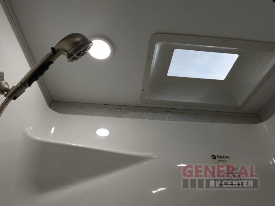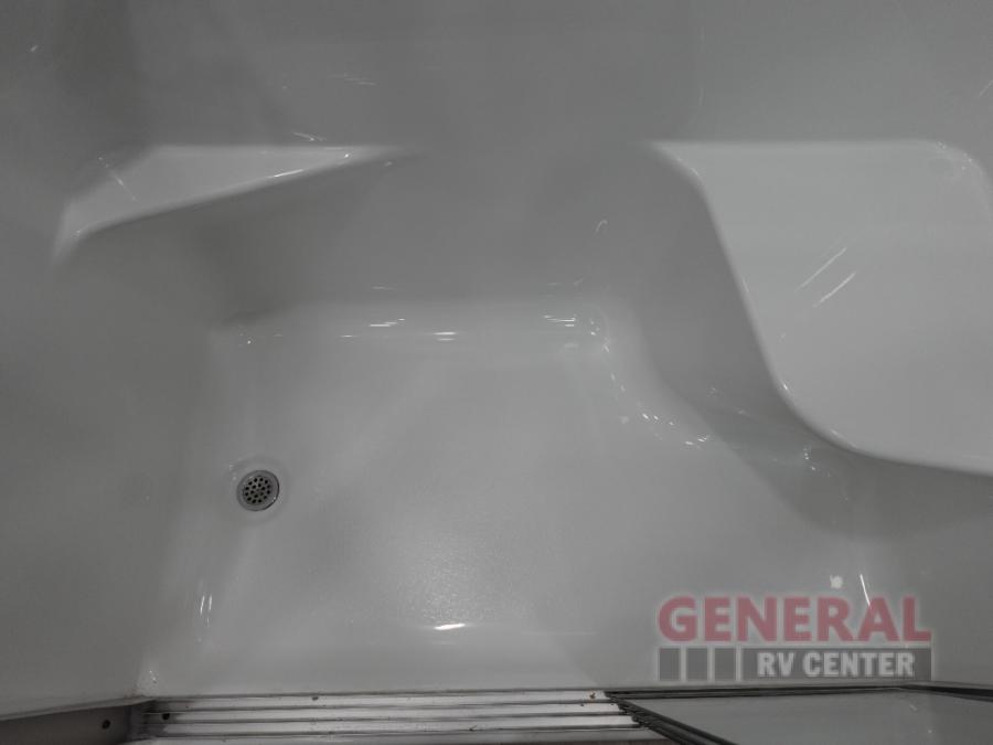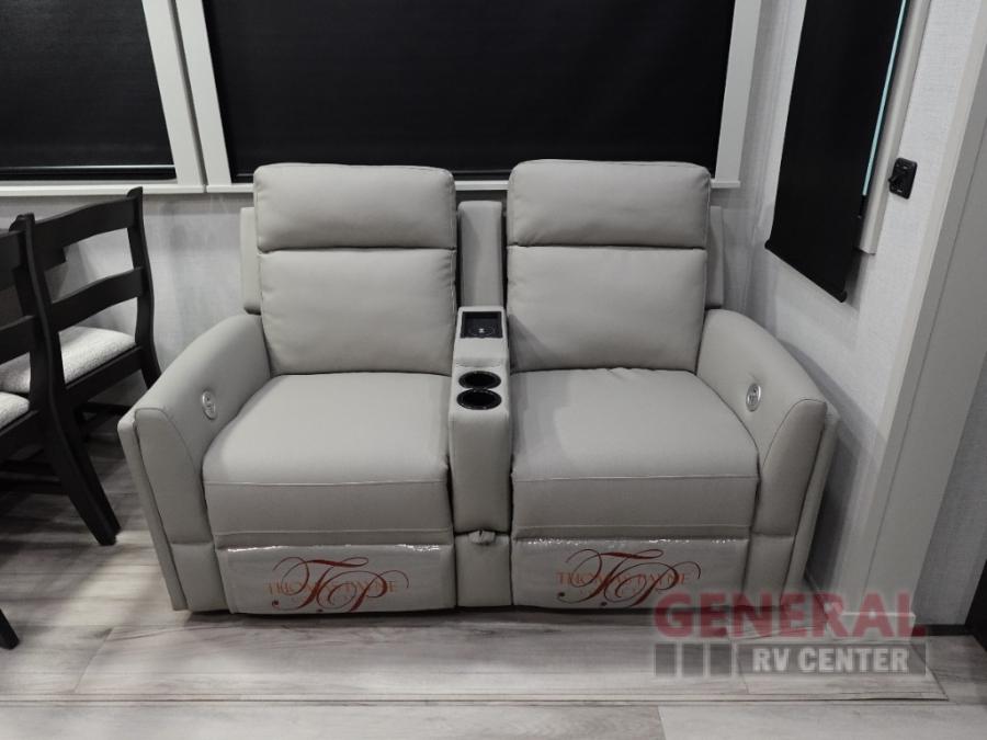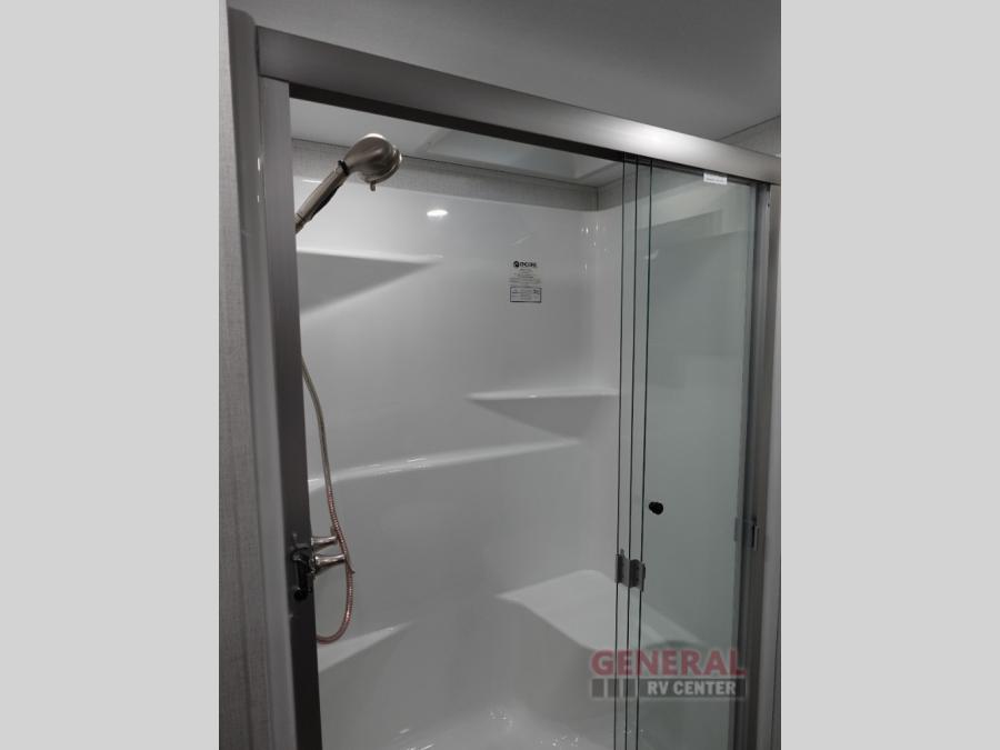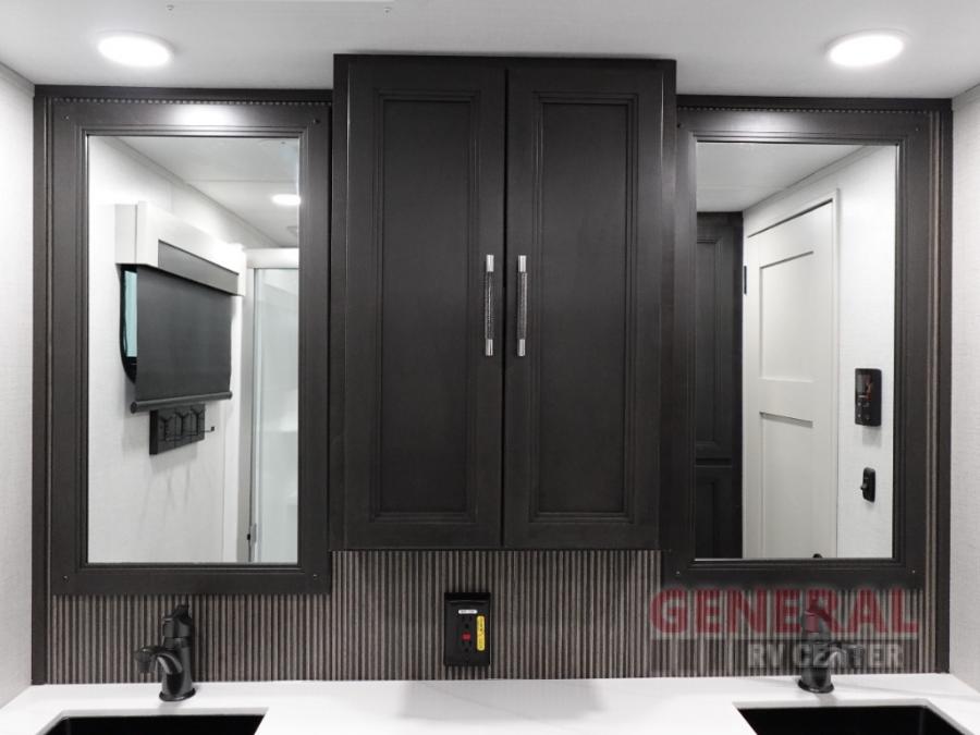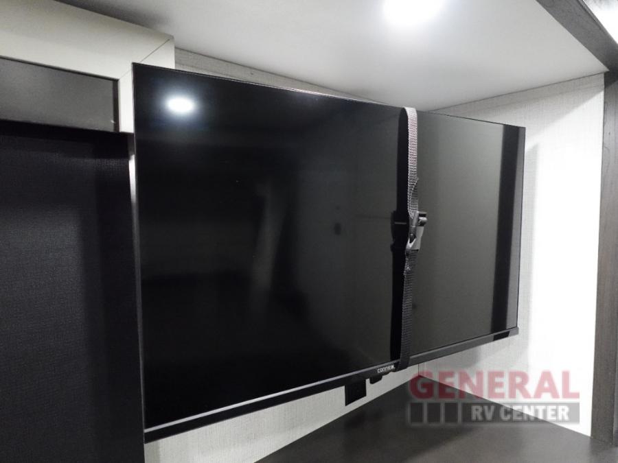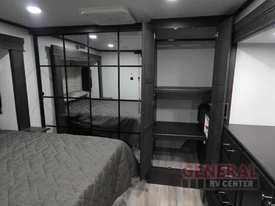 You will feel right at home camping in this fifth wheel! The chef will have lots of countertop space to prepare their best meals along with a kitchen island, two pull-out pantries to store your dishes, and an 18 cu. ft. residential refrigerator to store any leftovers. The free standing dinette offers a comfortable place to enjoy your meals, and the theater seating across from the fireplace and entertainment center will be perfect for movie nights. There is also a rear hide-a-bed sofa sleeper for any guests you may have. You will love the full bath that includes a shower with a seat, a linen closet, plus two bath sinks for convenience. And don't overlook the front bedroom with a sliding door, king bed slide out, and master closet for all your things. You'll also find stackable washer and dryer prep, two drawers, and a Smart HDTV for movies in bed.