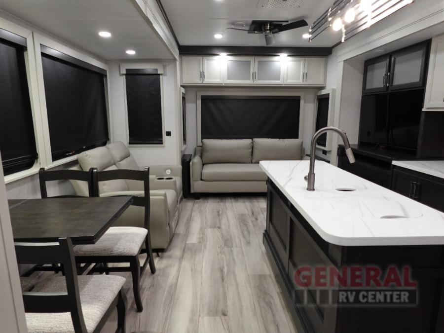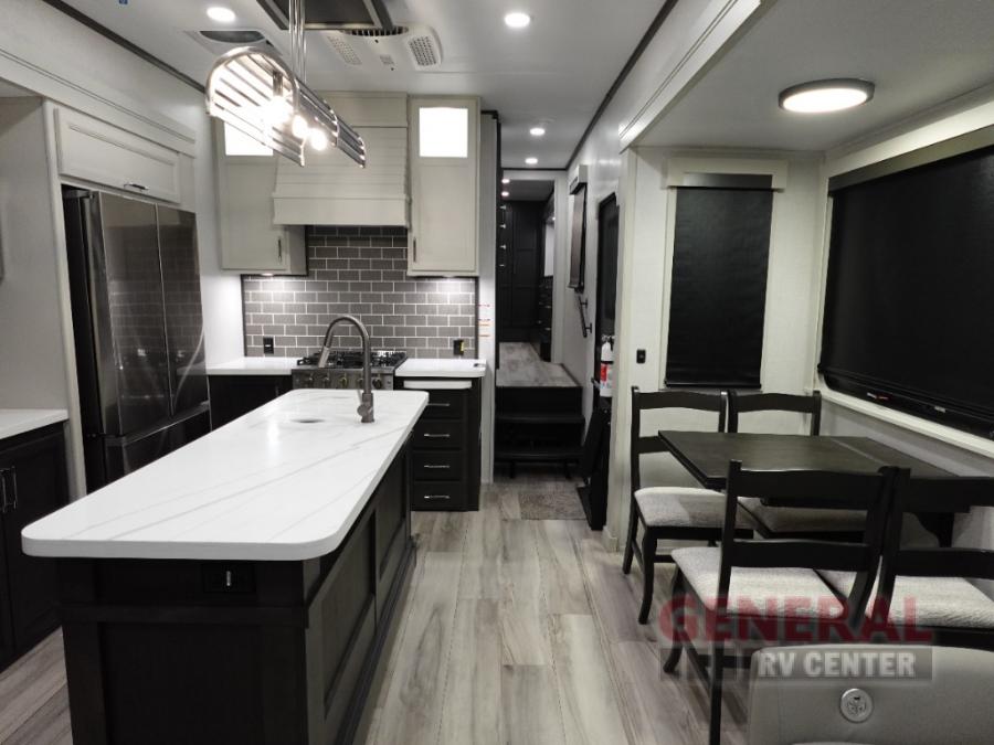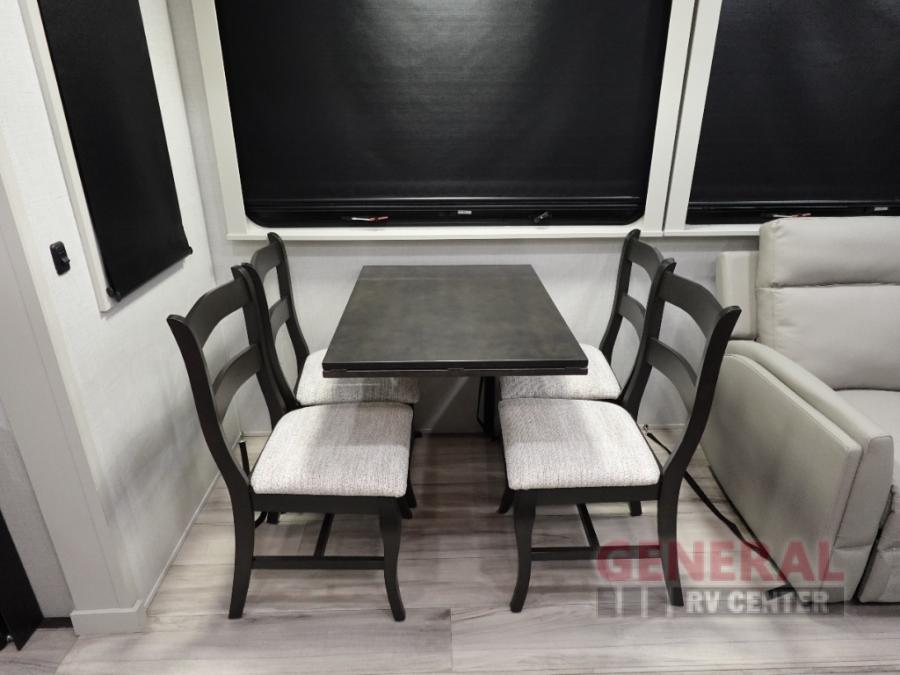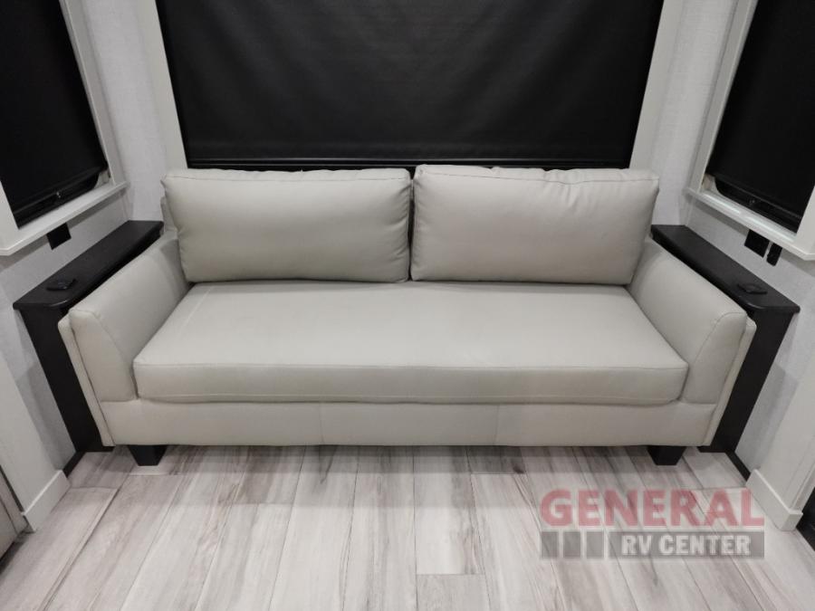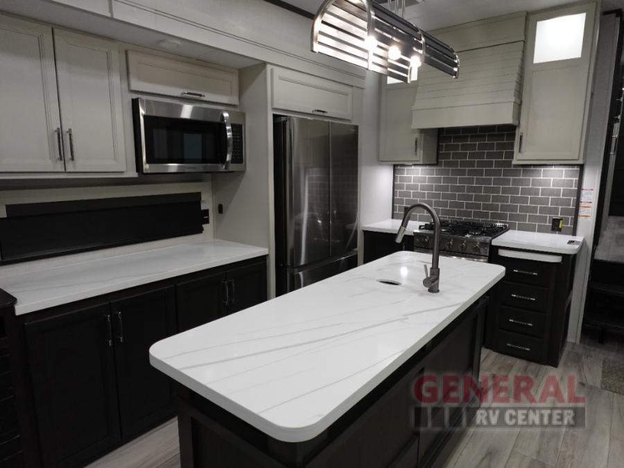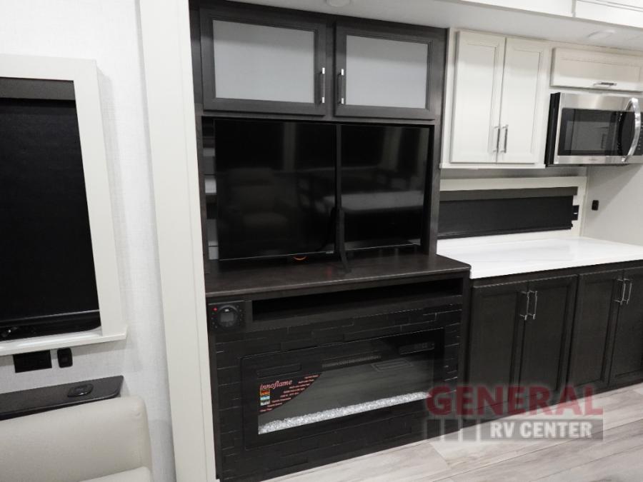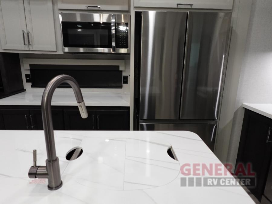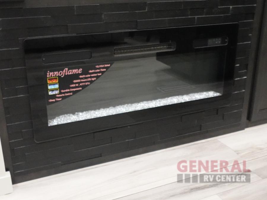 You will feel right at home camping in this fifth wheel! The chef will have lots of countertop space to prepare their best meals along with a kitchen island, two pull-out pantries to store your dishes, and an 18 cu. ft. residential refrigerator to store any leftovers. The free standing dinette offers a comfortable place to enjoy your meals, and the theater seating across from the fireplace and entertainment center will be perfect for movie nights. There is also a rear hide-a-bed sofa sleeper for any guests you may have. You will love the full bath that includes a shower with a seat, a linen closet, plus two bath sinks for convenience. And don't overlook the front bedroom with a sliding door, king bed slide out, and master closet for all your things. You'll also find stackable washer and dryer prep, two drawers, and a Smart HDTV for movies in bed.