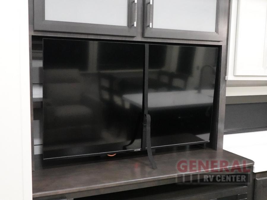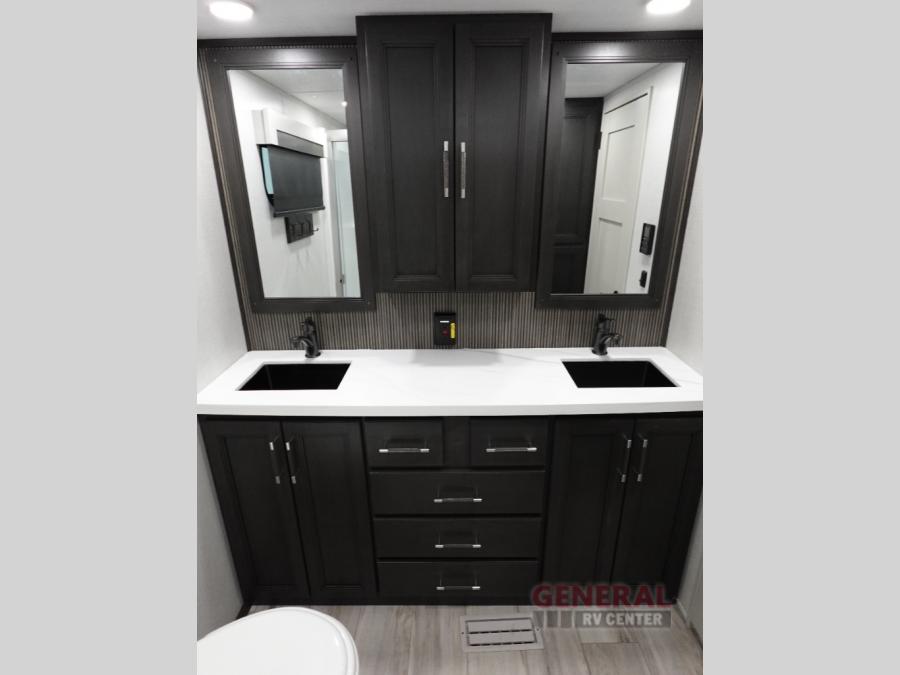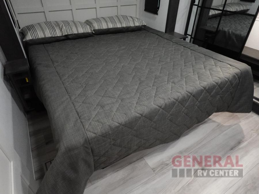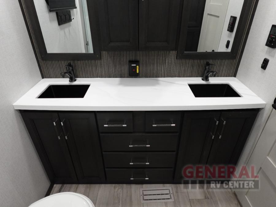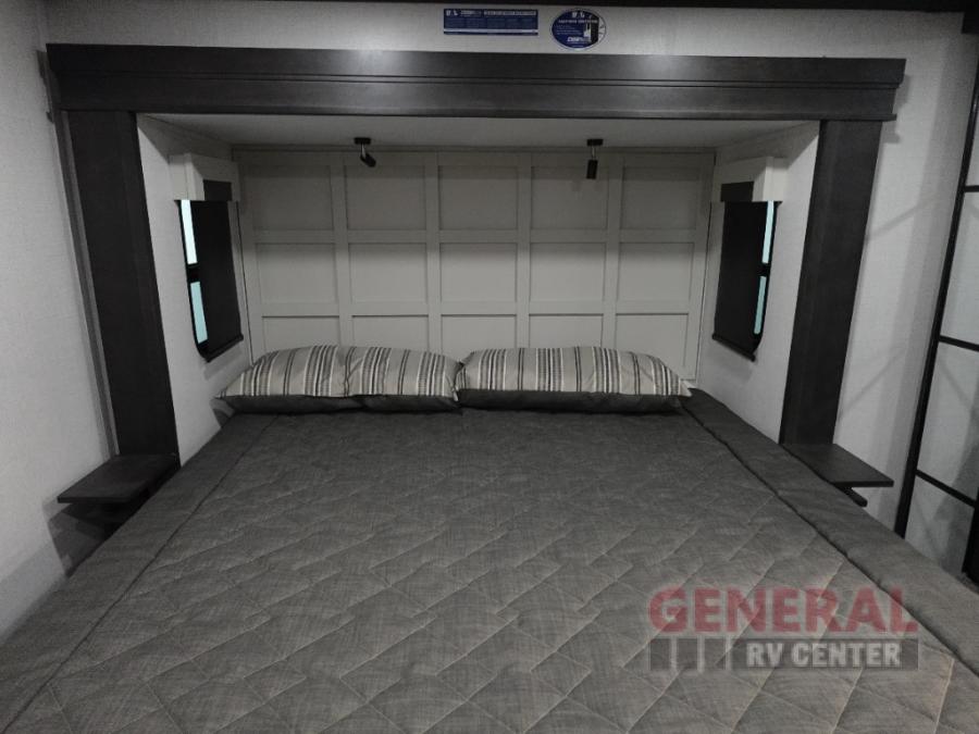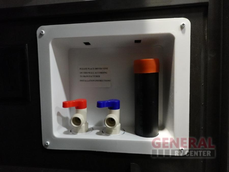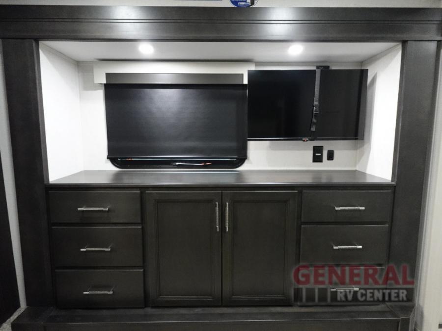 You will feel right at home camping in this fifth wheel! The chef will have lots of countertop space to prepare their best meals along with a kitchen island, two pull-out pantries to store your dishes, and an 18 cu. ft. residential refrigerator to store any leftovers. The free standing dinette offers a comfortable place to enjoy your meals, and the theater seating across from the fireplace and entertainment center will be perfect for movie nights. There is also a rear hide-a-bed sofa sleeper for any guests you may have. You will love the full bath that includes a shower with a seat, a linen closet, plus two bath sinks for convenience. And don't overlook the front bedroom with a sliding door, king bed slide out, and master closet for all your things. You'll also find stackable washer and dryer prep, two drawers, and a Smart HDTV for movies in bed.