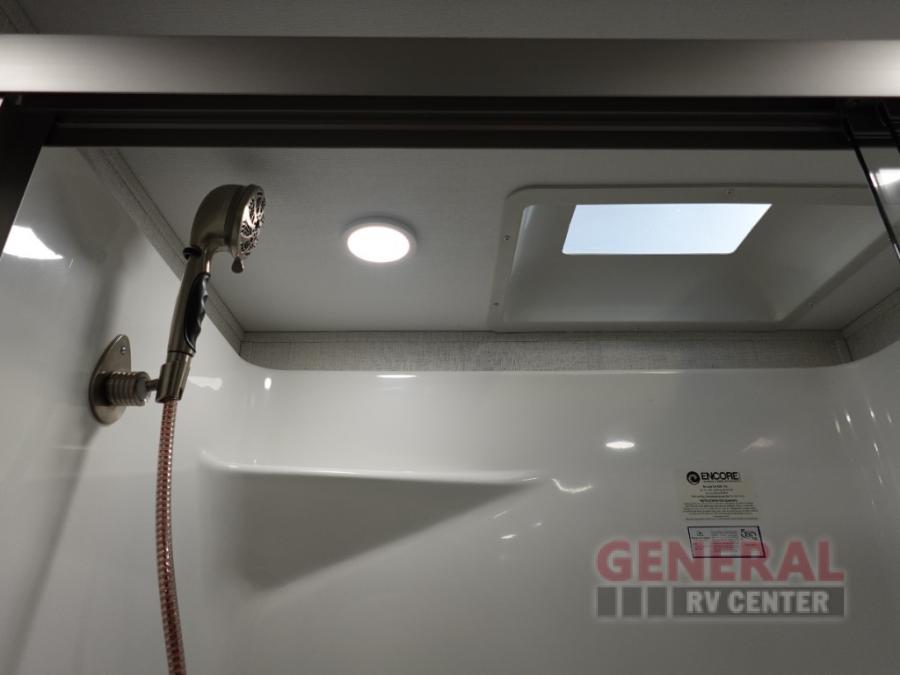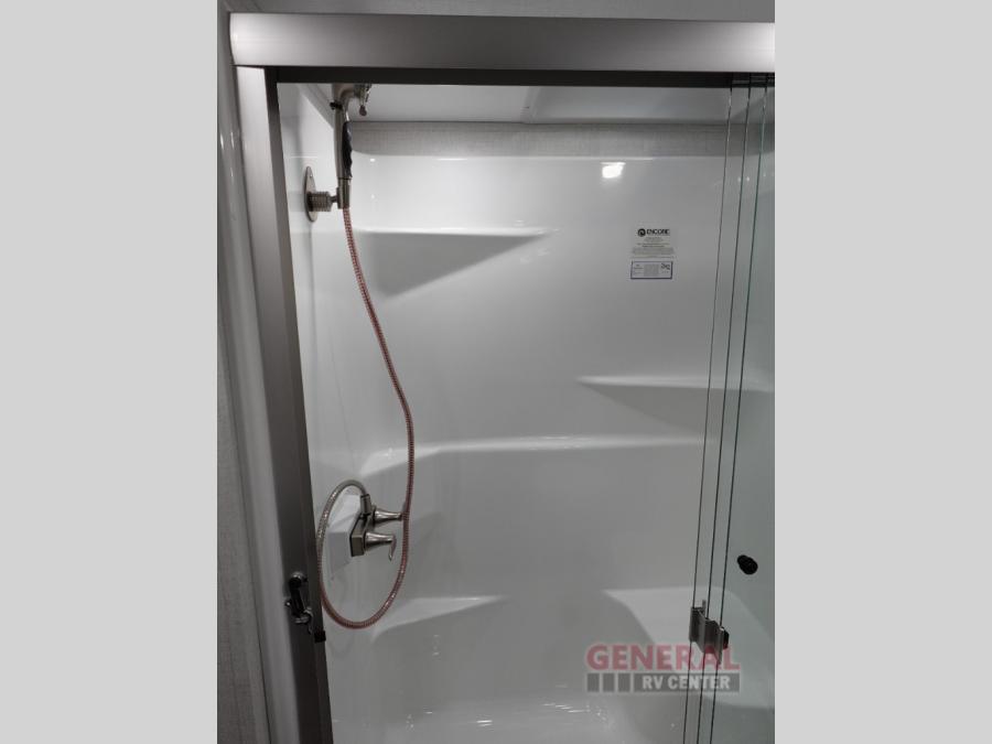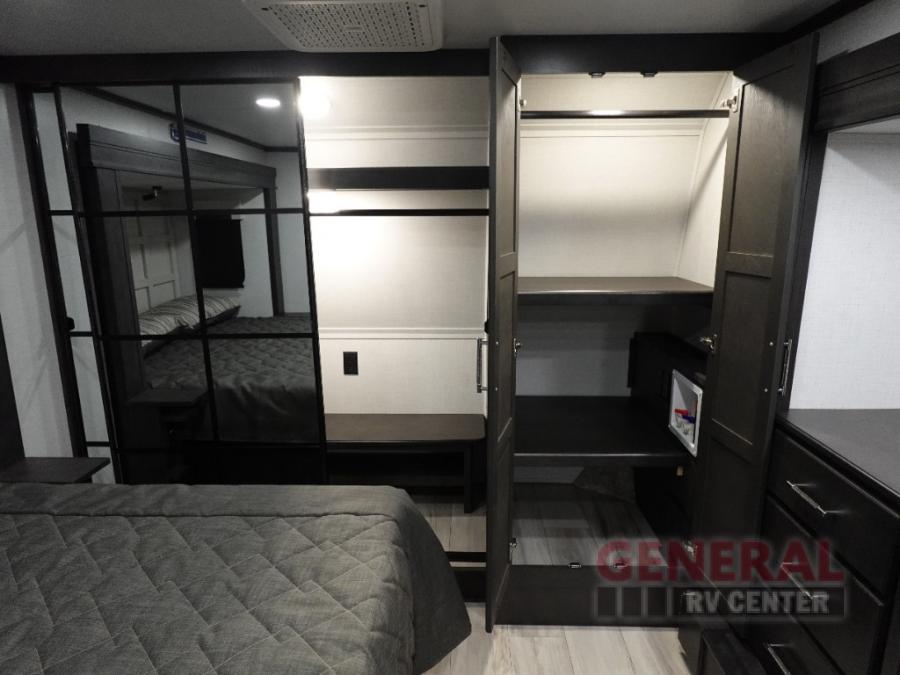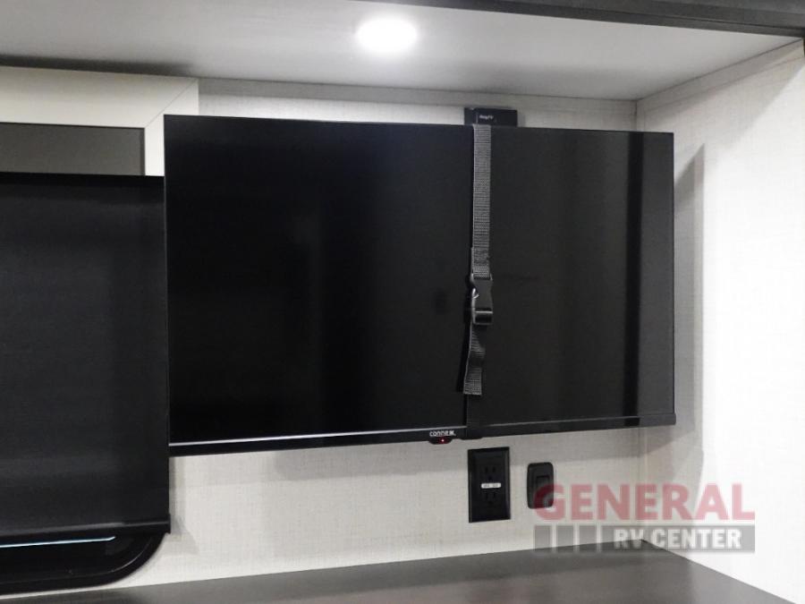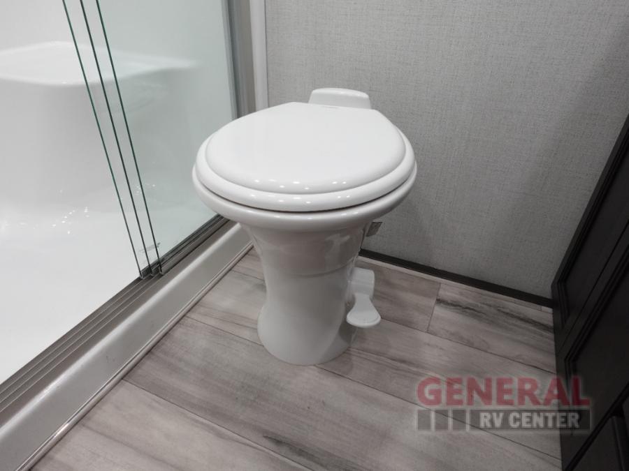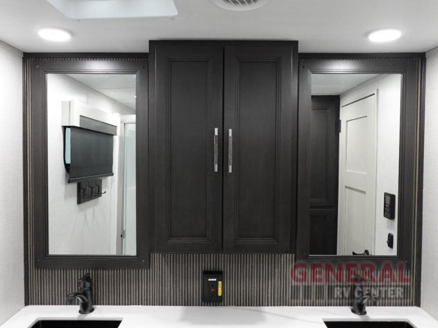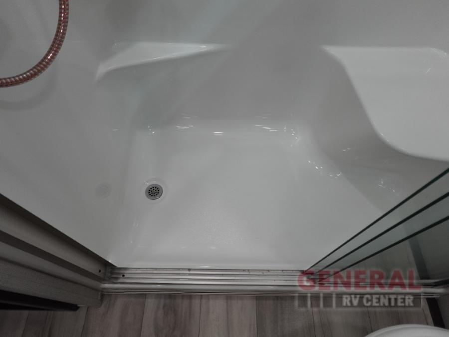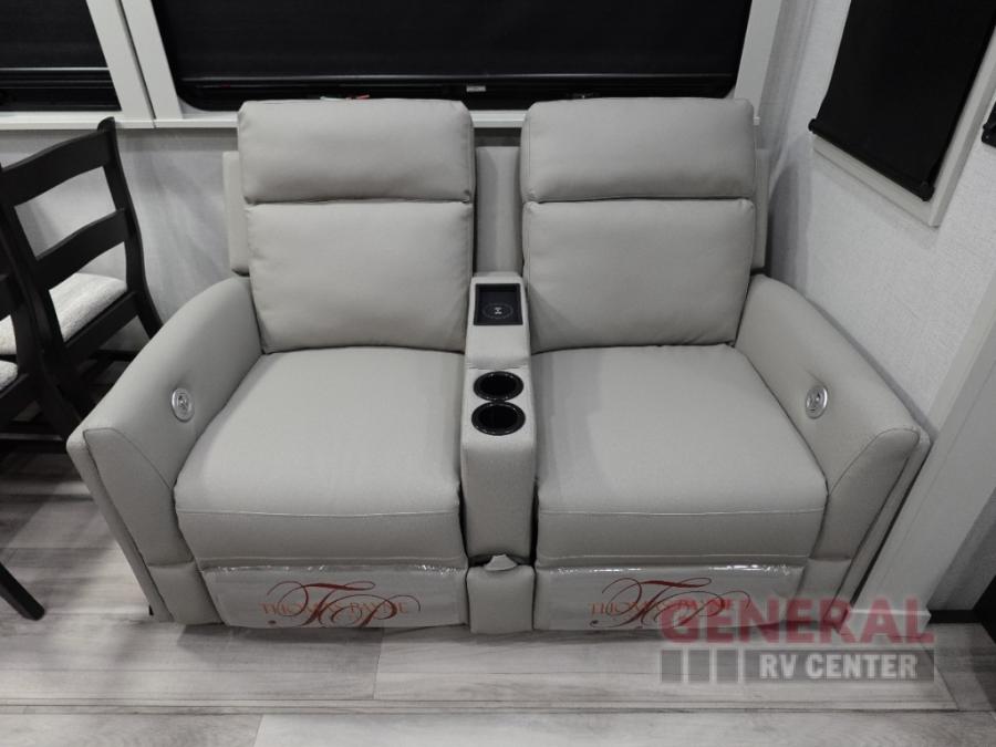 You will feel right at home camping in this fifth wheel! The chef will have lots of countertop space to prepare their best meals along with a kitchen island, two pull-out pantries to store your dishes, and an 18 cu. ft. residential refrigerator to store any leftovers. The free standing dinette offers a comfortable place to enjoy your meals, and the theater seating across from the fireplace and entertainment center will be perfect for movie nights. There is also a rear hide-a-bed sofa sleeper for any guests you may have. You will love the full bath that includes a shower with a seat, a linen closet, plus two bath sinks for convenience. And don't overlook the front bedroom with a sliding door, king bed slide out, and master closet for all your things. You'll also find stackable washer and dryer prep, two drawers, and a Smart HDTV for movies in bed.