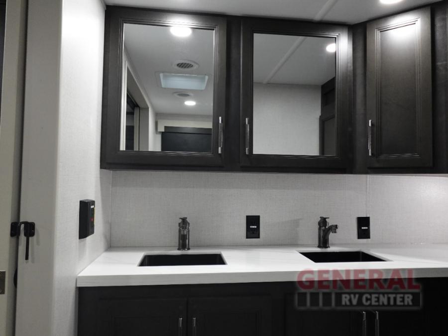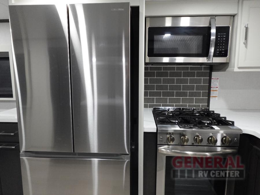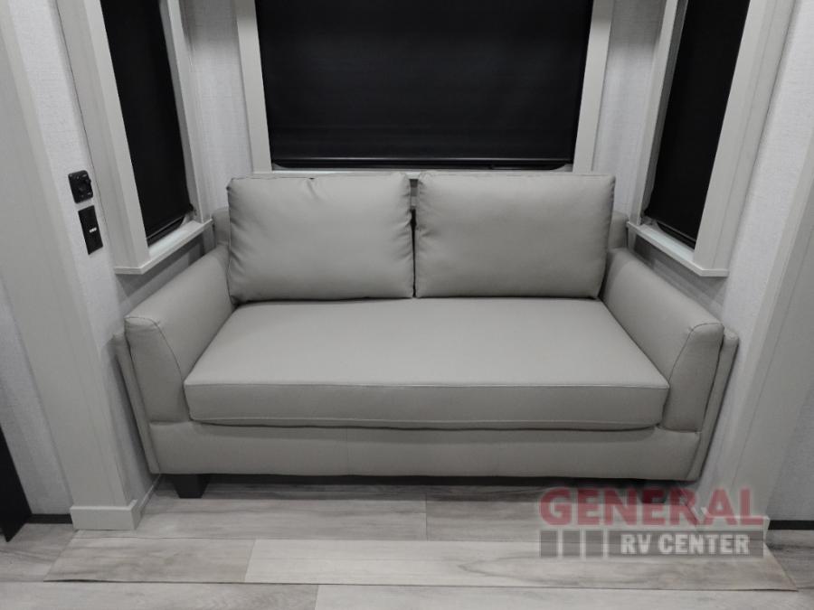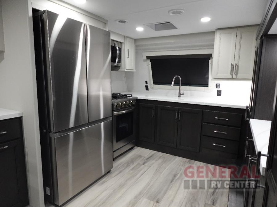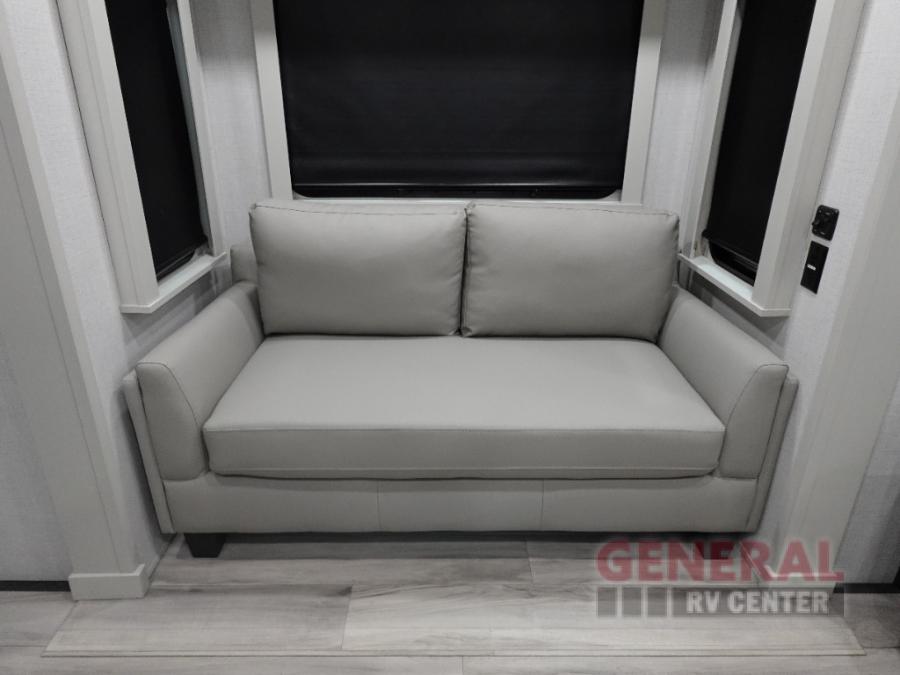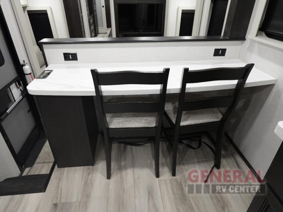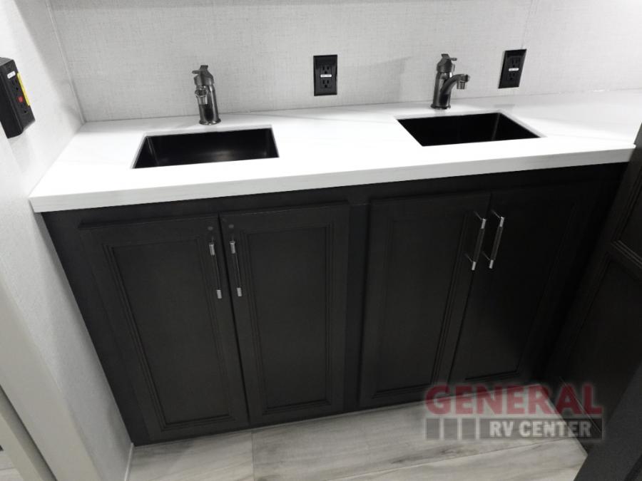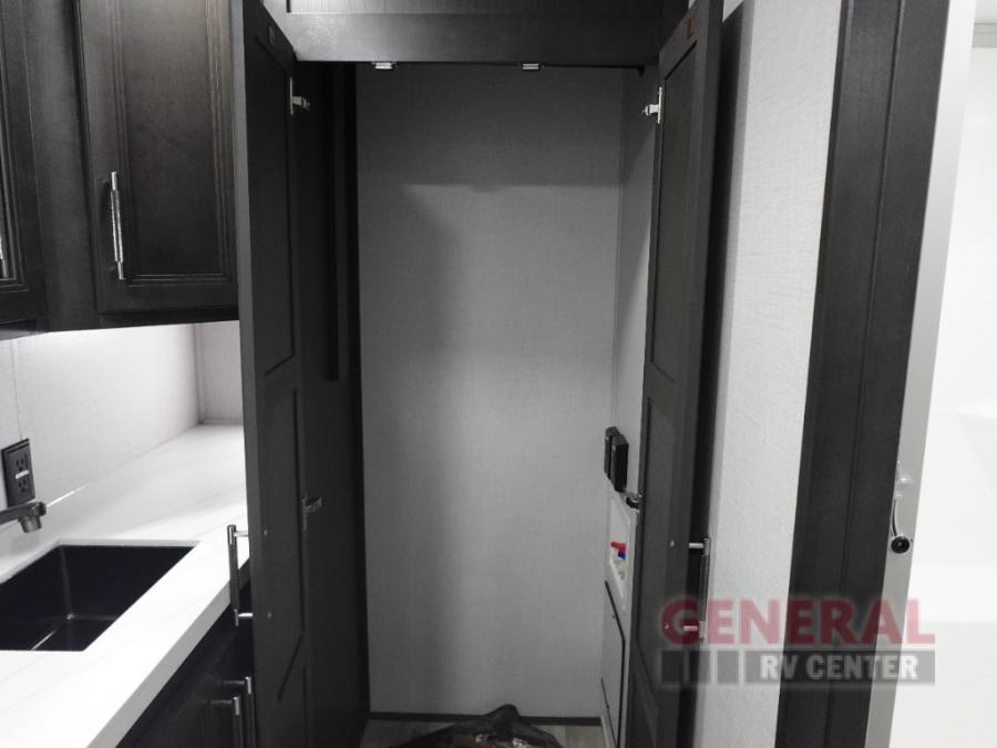 This fifth wheel is decked out in luxuries! The full rear bathroom has a walk-in shower to freshen up in each morning, a dual sink vanity for two to get ready at once, plus washer and dryer prep. You will enjoy a good night's rest on the king bed slide inside the private bedroom and others can sleep on the opposing tri-fold sofa sleeper slides in the living room. There is also a theater seating here, along with a fireplace and 50" LED TV for movie nights. The front kitchen is where it's really at in this fifth wheel; ample counter space, a bar top with stools, pull-out drawers, plus a pantry and closet for even more storage!