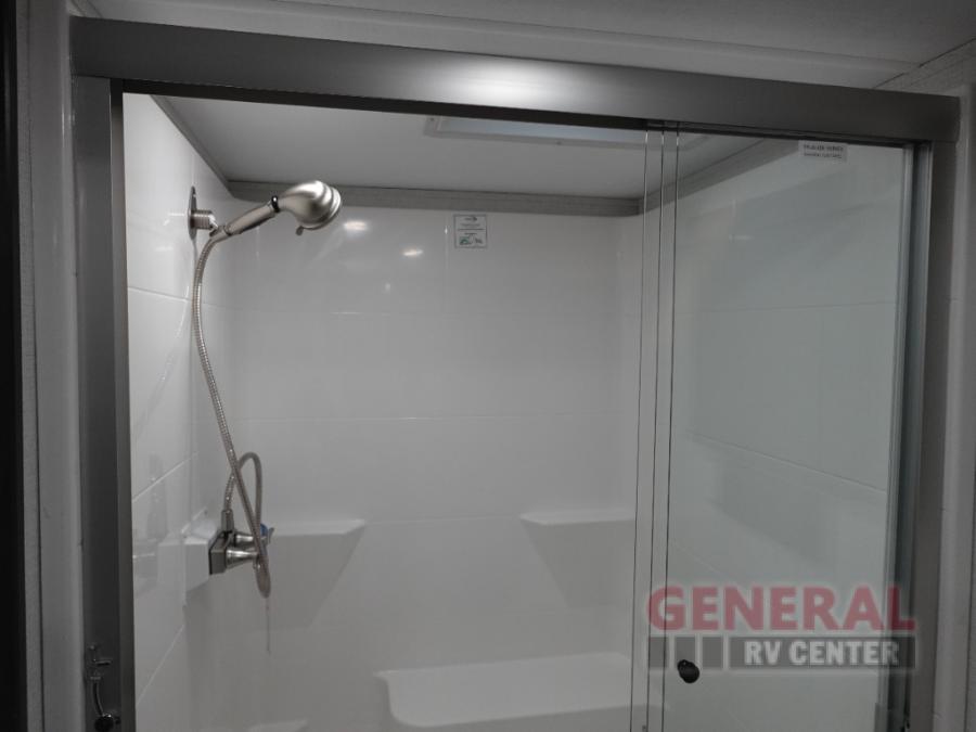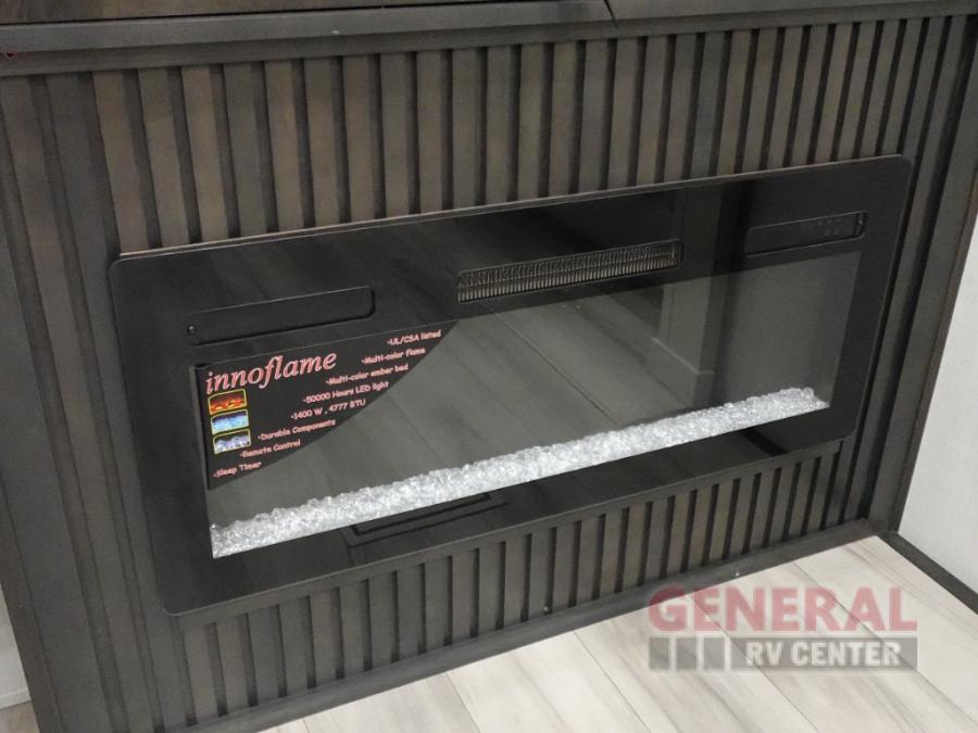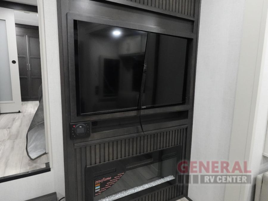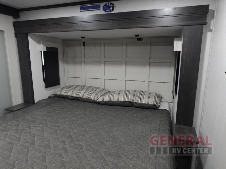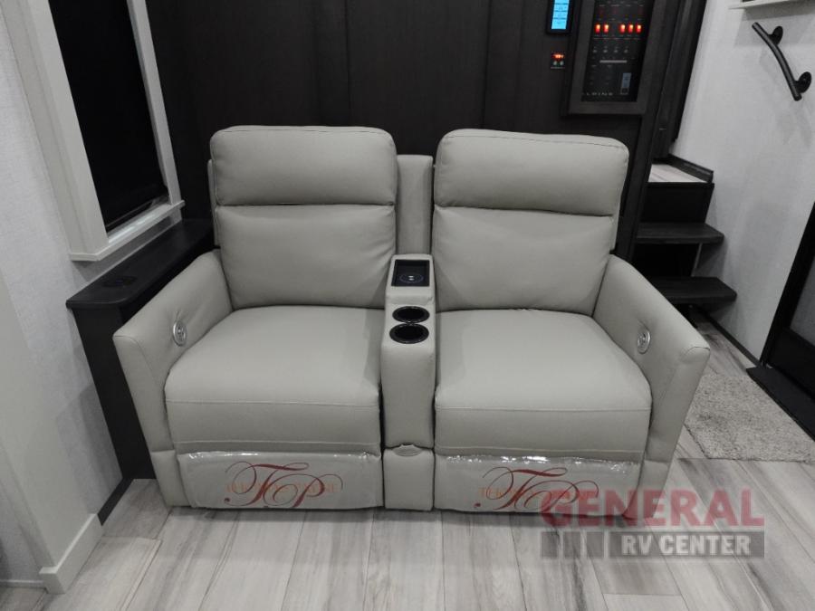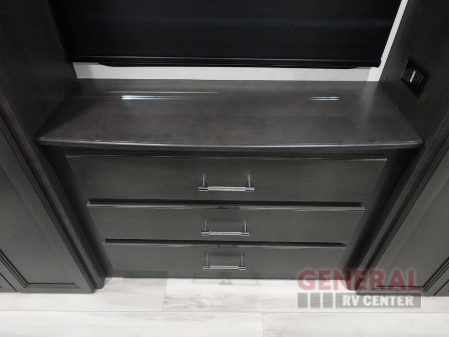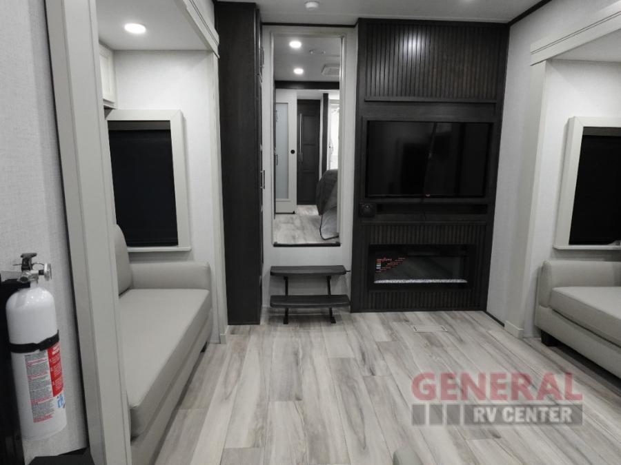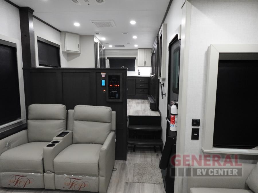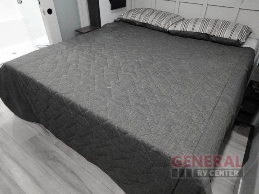 This fifth wheel is decked out in luxuries! The full rear bathroom has a walk-in shower to freshen up in each morning, a dual sink vanity for two to get ready at once, plus washer and dryer prep. You will enjoy a good night's rest on the king bed slide inside the private bedroom and others can sleep on the opposing tri-fold sofa sleeper slides in the living room. There is also a theater seating here, along with a fireplace and 50" LED TV for movie nights. The front kitchen is where it's really at in this fifth wheel; ample counter space, a bar top with stools, pull-out drawers, plus a pantry and closet for even more storage!