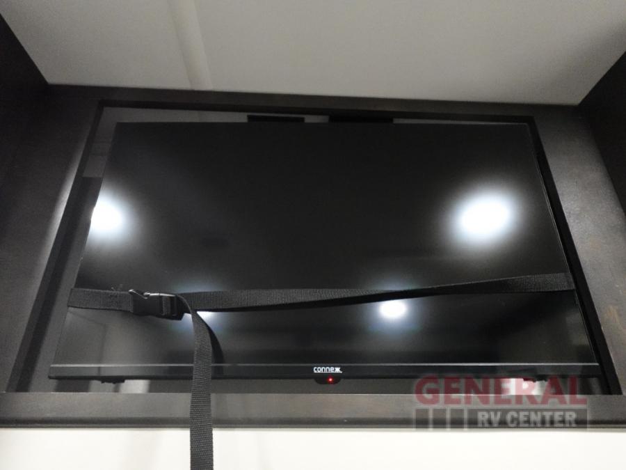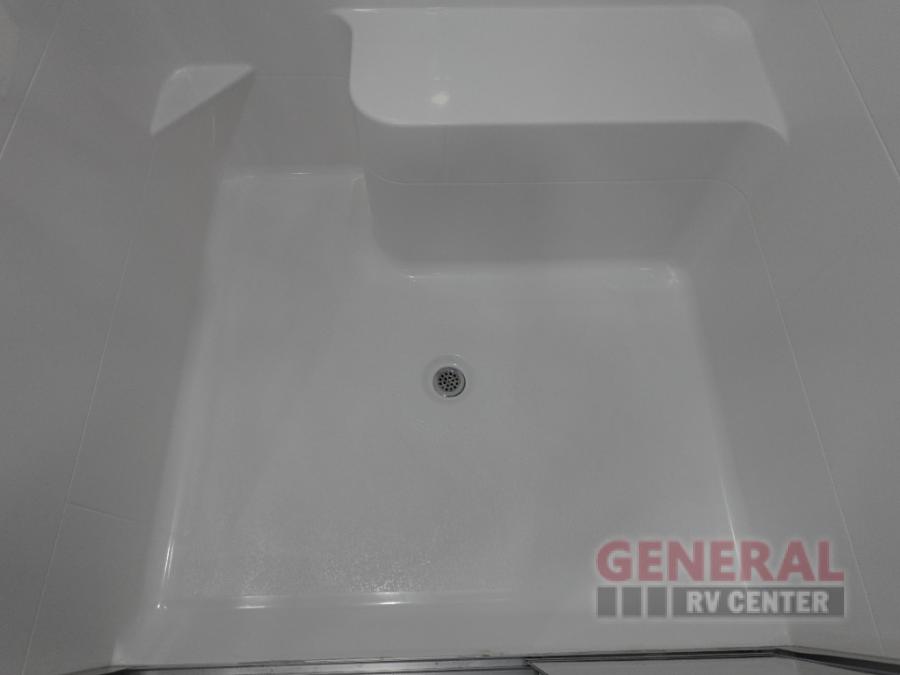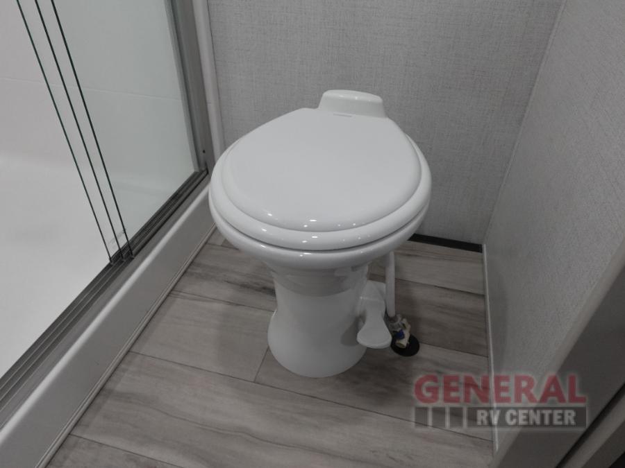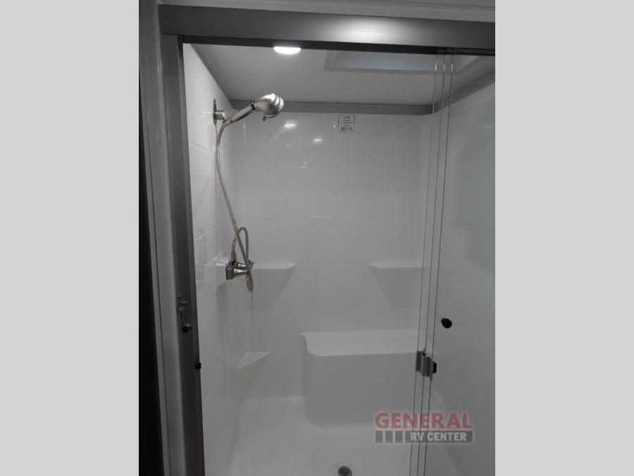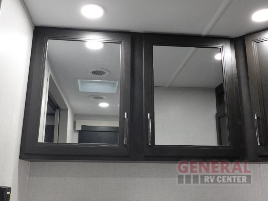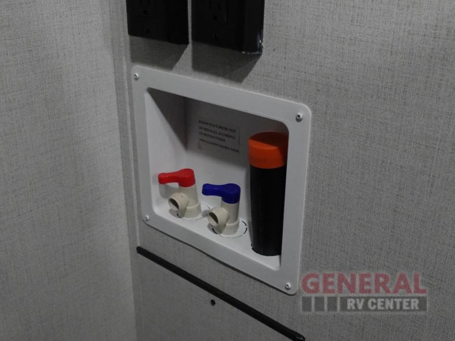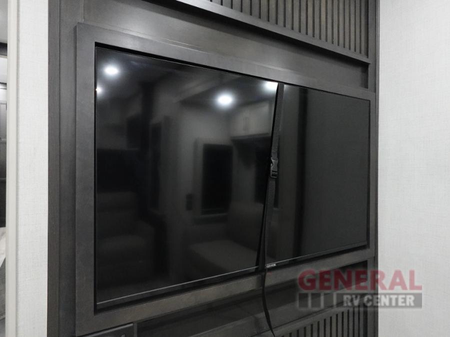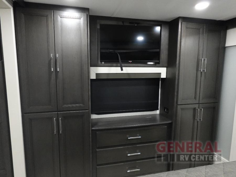 This fifth wheel is decked out in luxuries! The full rear bathroom has a walk-in shower to freshen up in each morning, a dual sink vanity for two to get ready at once, plus washer and dryer prep. You will enjoy a good night's rest on the king bed slide inside the private bedroom and others can sleep on the opposing tri-fold sofa sleeper slides in the living room. There is also a theater seating here, along with a fireplace and 50" LED TV for movie nights. The front kitchen is where it's really at in this fifth wheel; ample counter space, a bar top with stools, pull-out drawers, plus a pantry and closet for even more storage!
