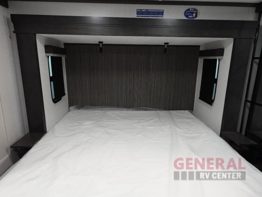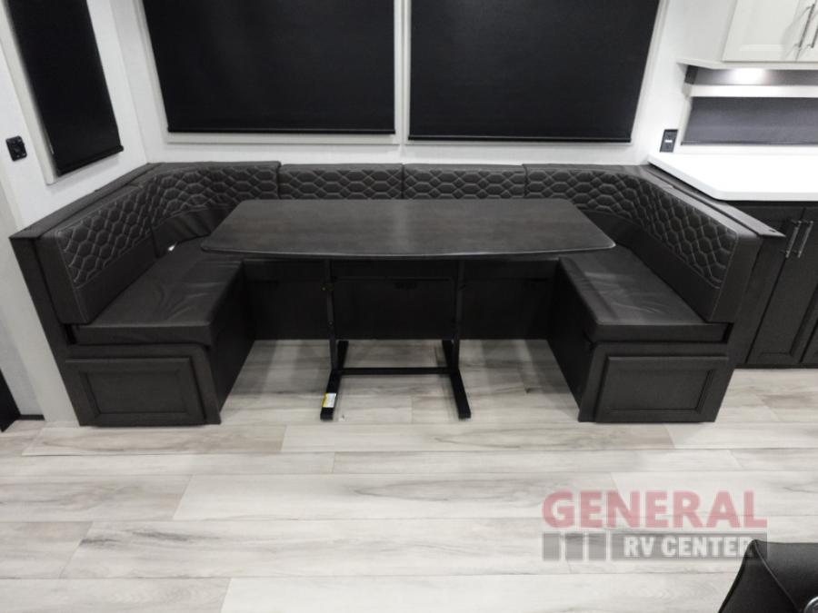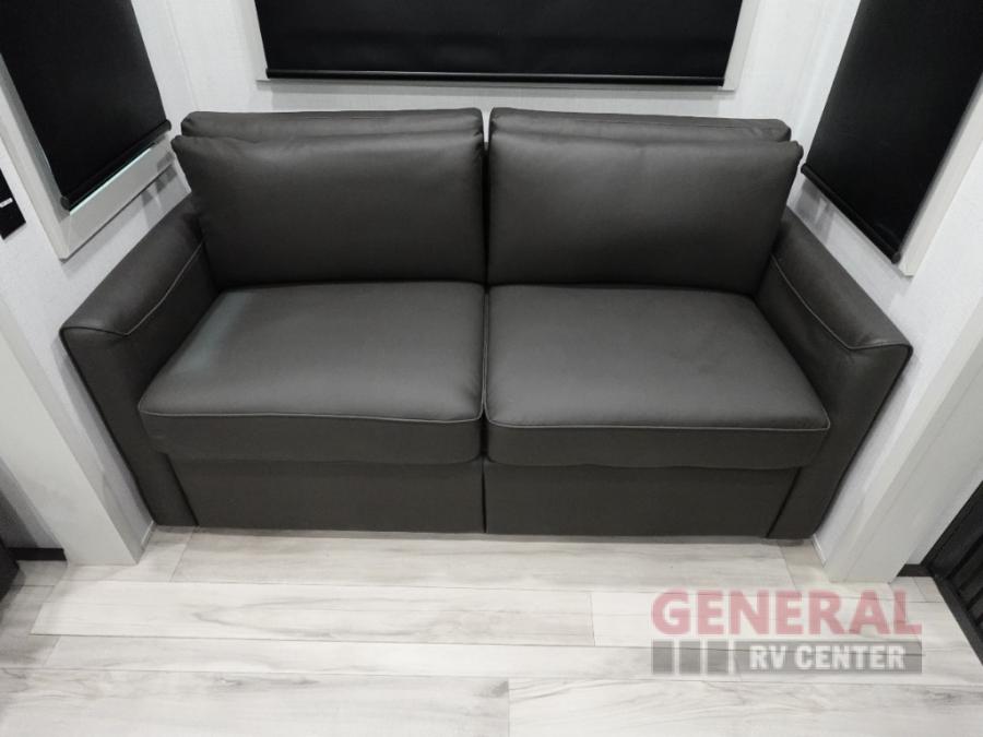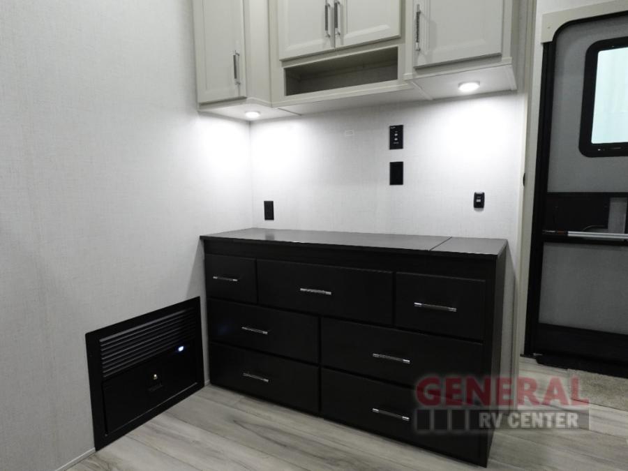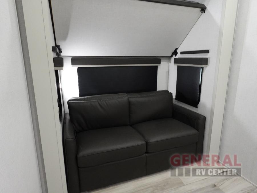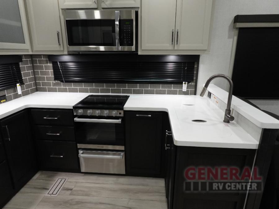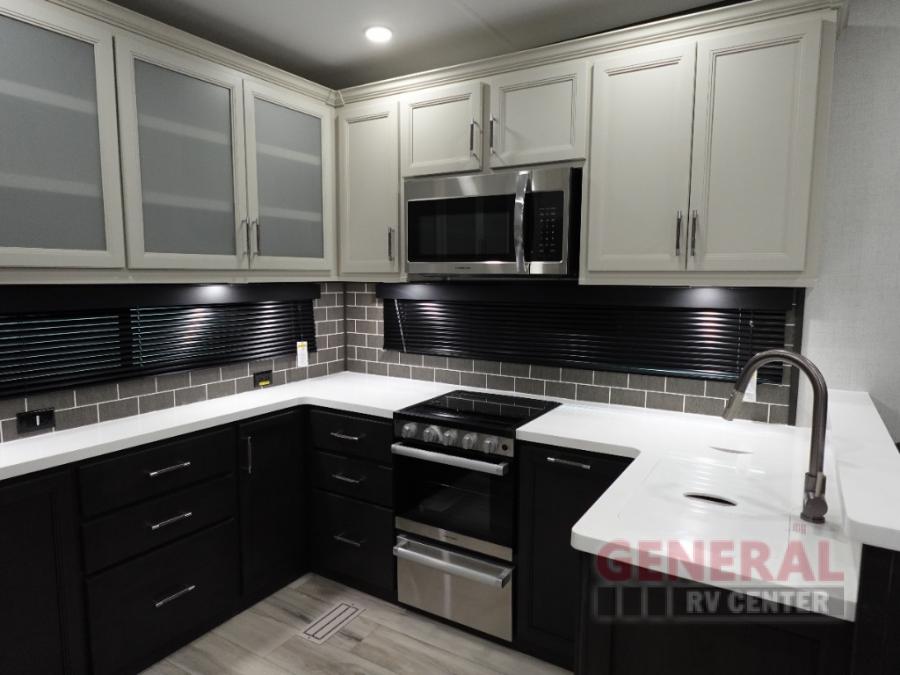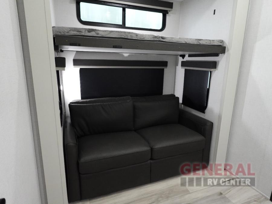 The whole gang will love camping in this fifth wheel since there is space for everyone! A front master bedroom includes a king bed slide out, master closet, and stackable washer and dryer prep if you choose to go full-time. Your guests or little ones will love the middle bunkhouse with a flip bunk above a hide-a-bed sofa, along with a pull-out table and storage space. Everyone can meet in the living area which features dual opposing slides for more space, theater seating, a sleeper sofa, and a U-shaped dinette, providing even more sleeping space. And check out the rear kitchen with its wrap-around counter space, Furrion appliances, and large pantry to keep snacks stocked!