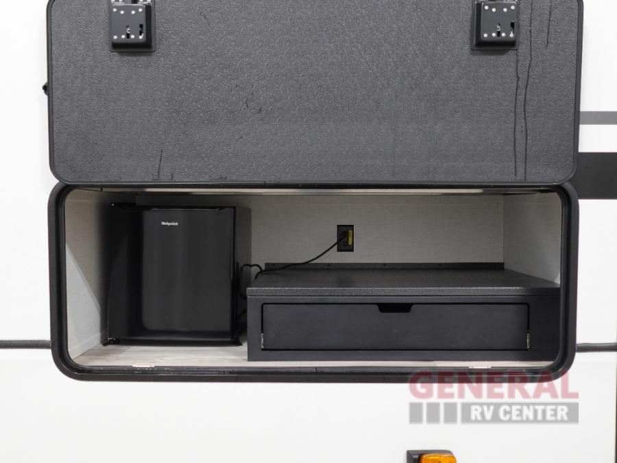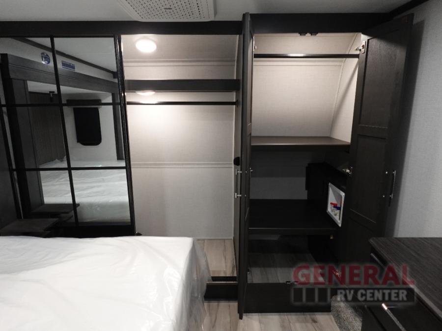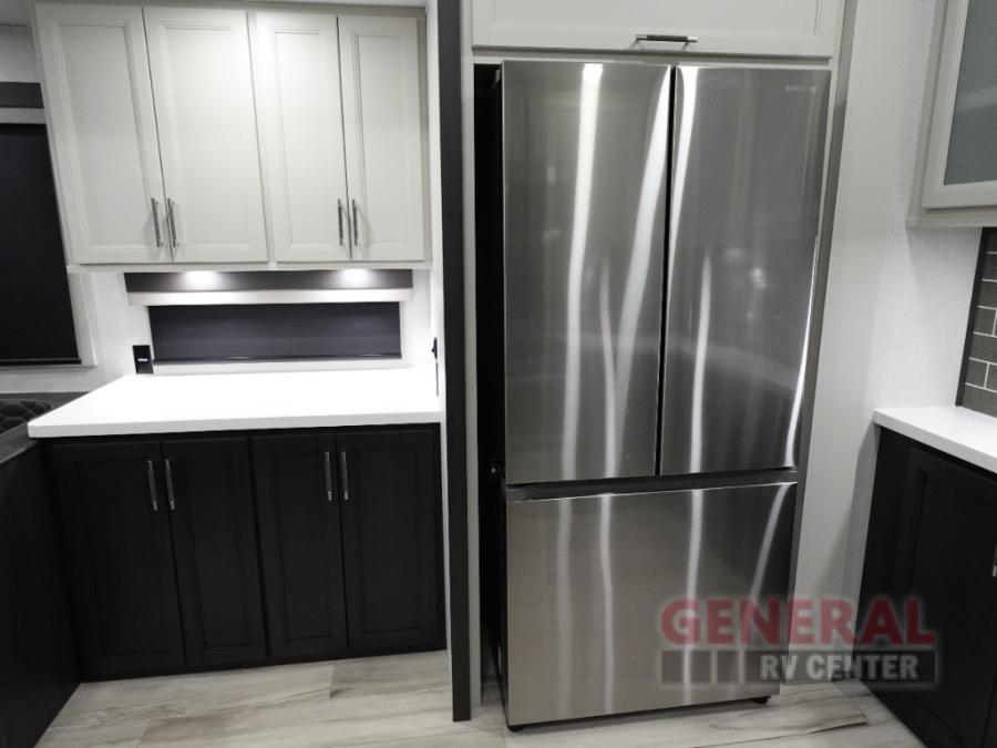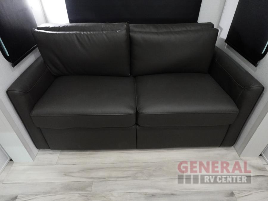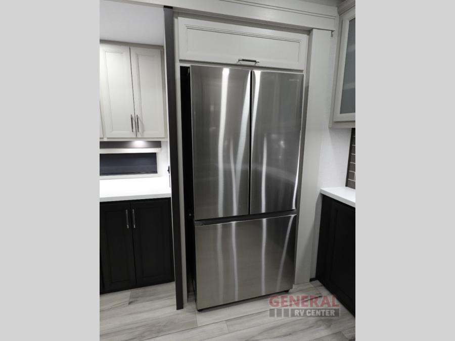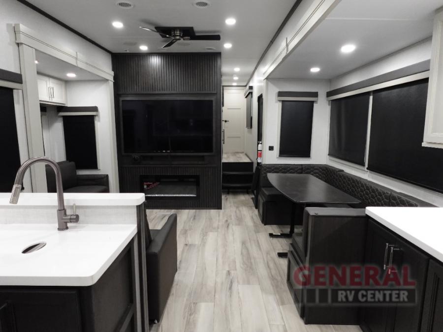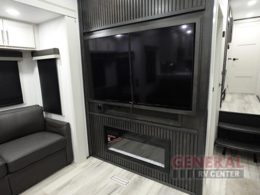 The whole gang will love camping in this fifth wheel since there is space for everyone! A front master bedroom includes a king bed slide out, master closet, and stackable washer and dryer prep if you choose to go full-time. Your guests or little ones will love the middle bunkhouse with a flip bunk above a hide-a-bed sofa, along with a pull-out table and storage space. Everyone can meet in the living area which features dual opposing slides for more space, theater seating, a sleeper sofa, and a U-shaped dinette, providing even more sleeping space. And check out the rear kitchen with its wrap-around counter space, Furrion appliances, and large pantry to keep snacks stocked!
