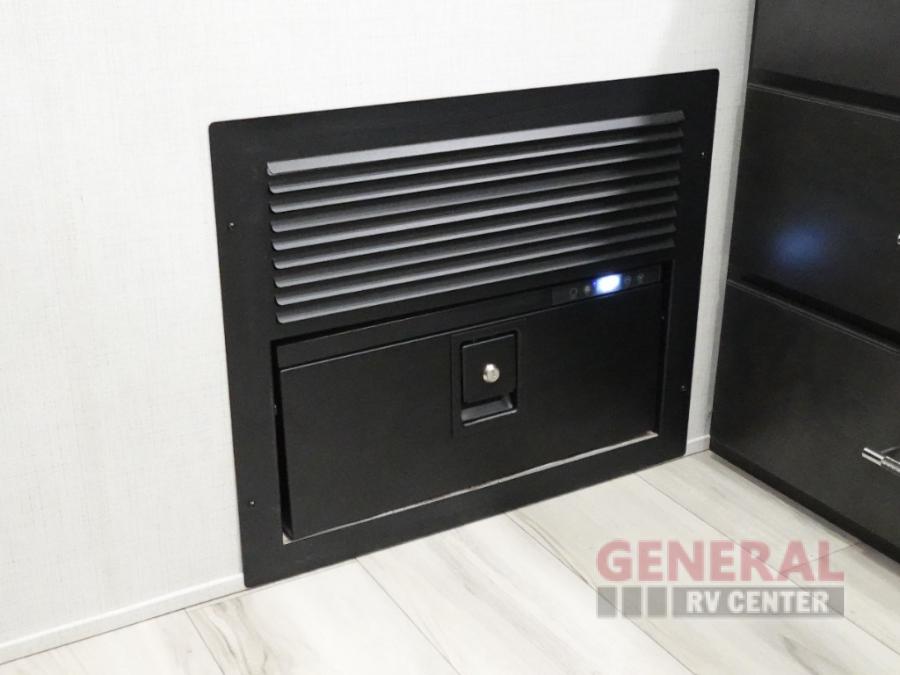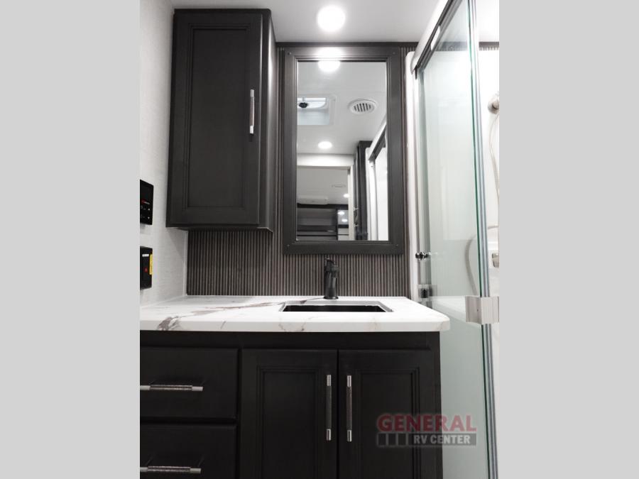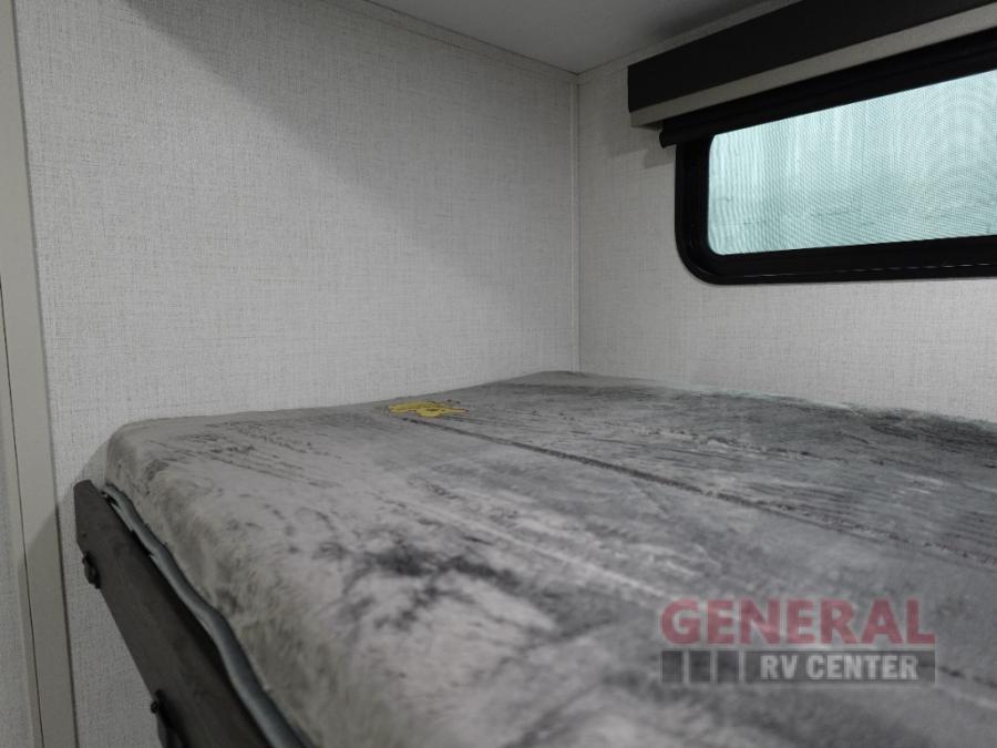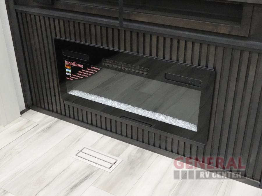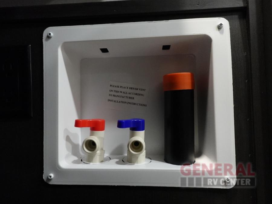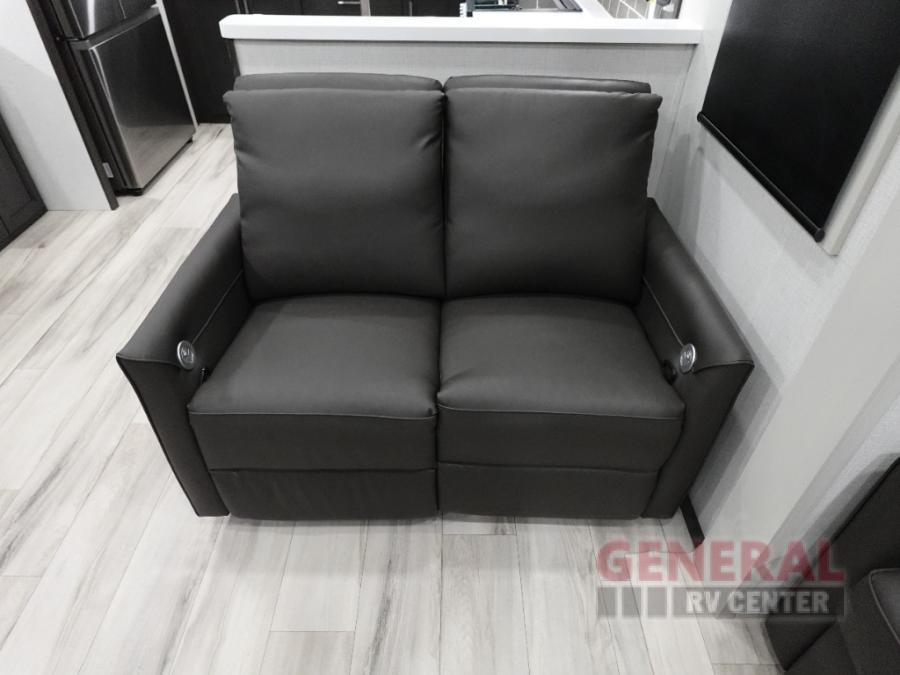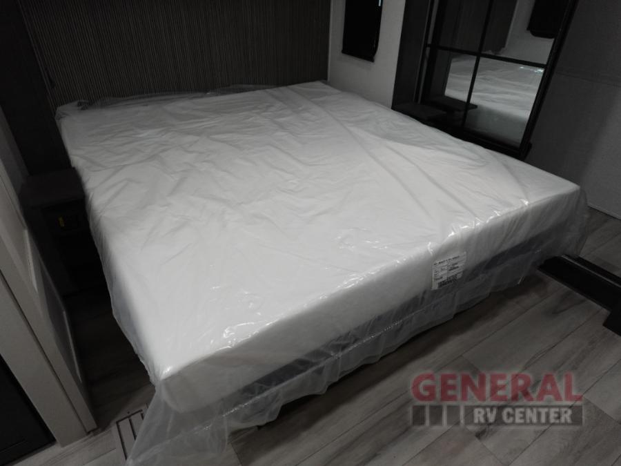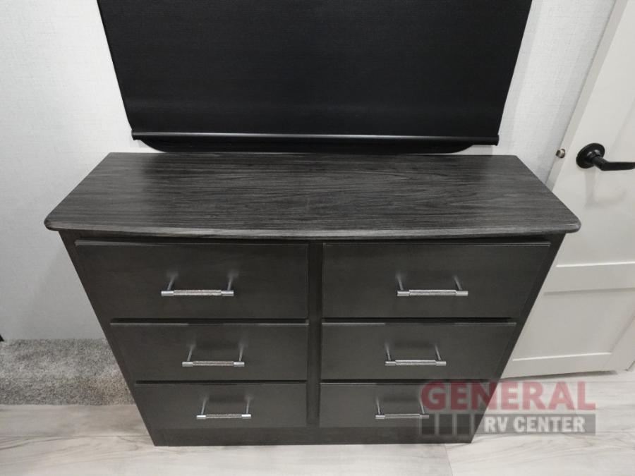 The whole gang will love camping in this fifth wheel since there is space for everyone! A front master bedroom includes a king bed slide out, master closet, and stackable washer and dryer prep if you choose to go full-time. Your guests or little ones will love the middle bunkhouse with a flip bunk above a hide-a-bed sofa, along with a pull-out table and storage space. Everyone can meet in the living area which features dual opposing slides for more space, theater seating, a sleeper sofa, and a U-shaped dinette, providing even more sleeping space. And check out the rear kitchen with its wrap-around counter space, Furrion appliances, and large pantry to keep snacks stocked!