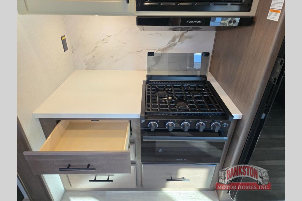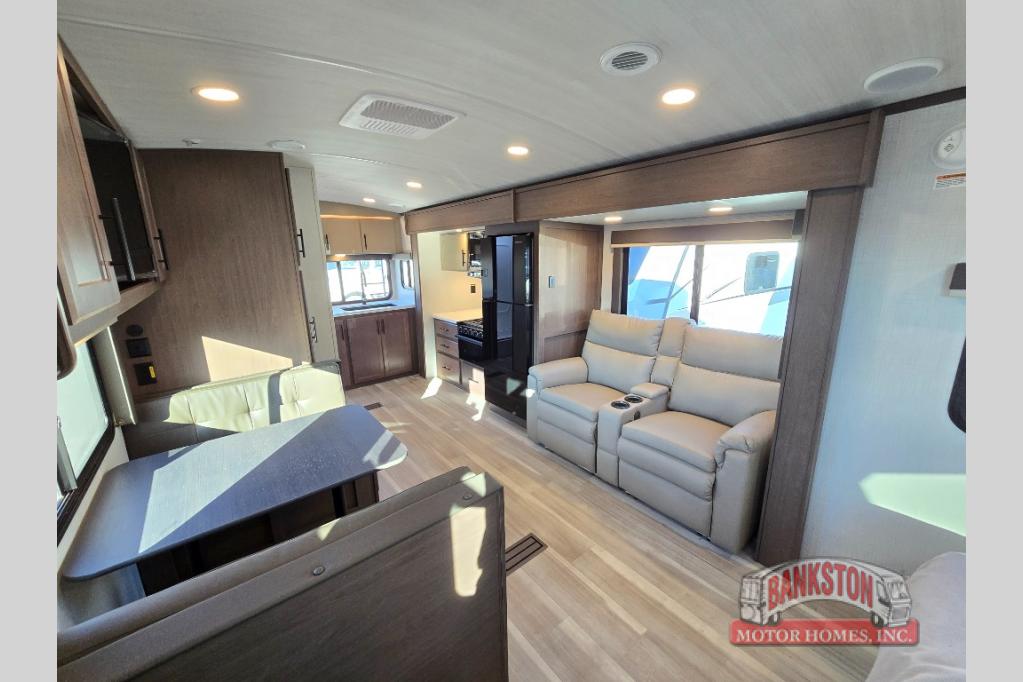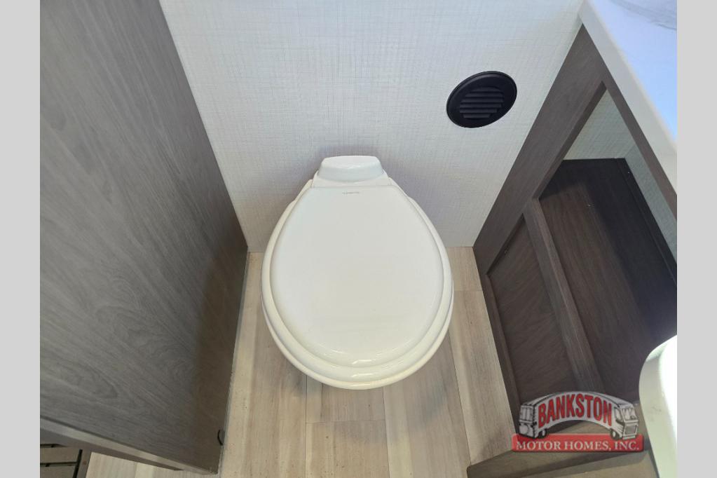 With a king-size bed, this Cougar Half-Ton travel trailer shows that you can still be comfortable even while you're away from home! The bed has drawers and nightstands on either side to keep your belongings tidy. There is a convenient shoe cubby right as you enter the unit to keep this space picked up as well. Right next to the booth dinette is the pantry, and next to the pantry is the full bathroom which is certainly one of the most valuable features to any trailer.
