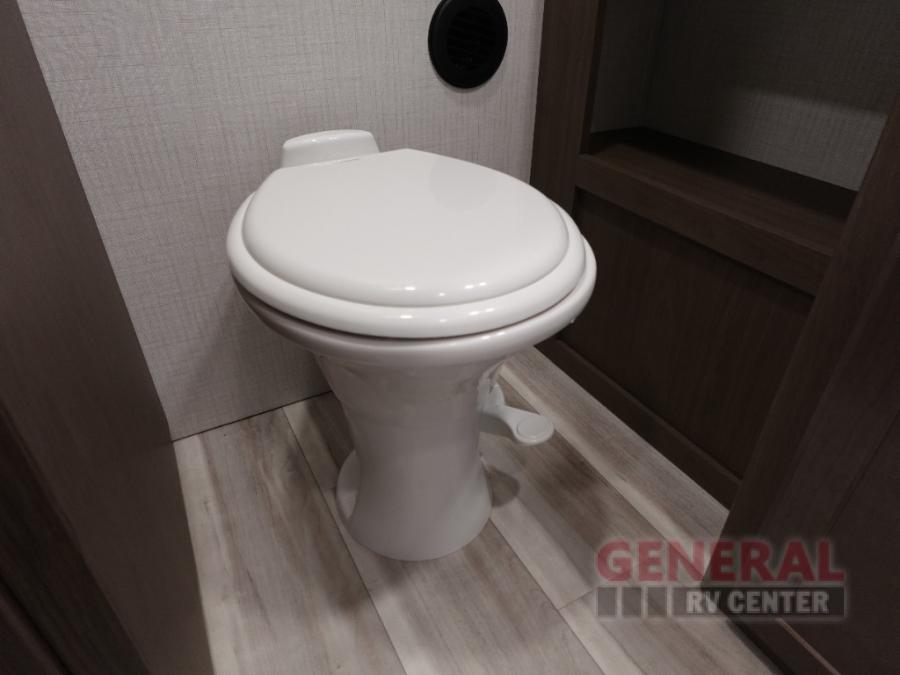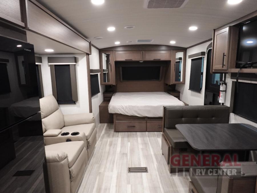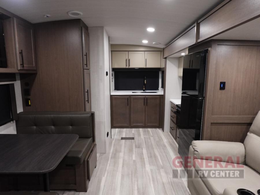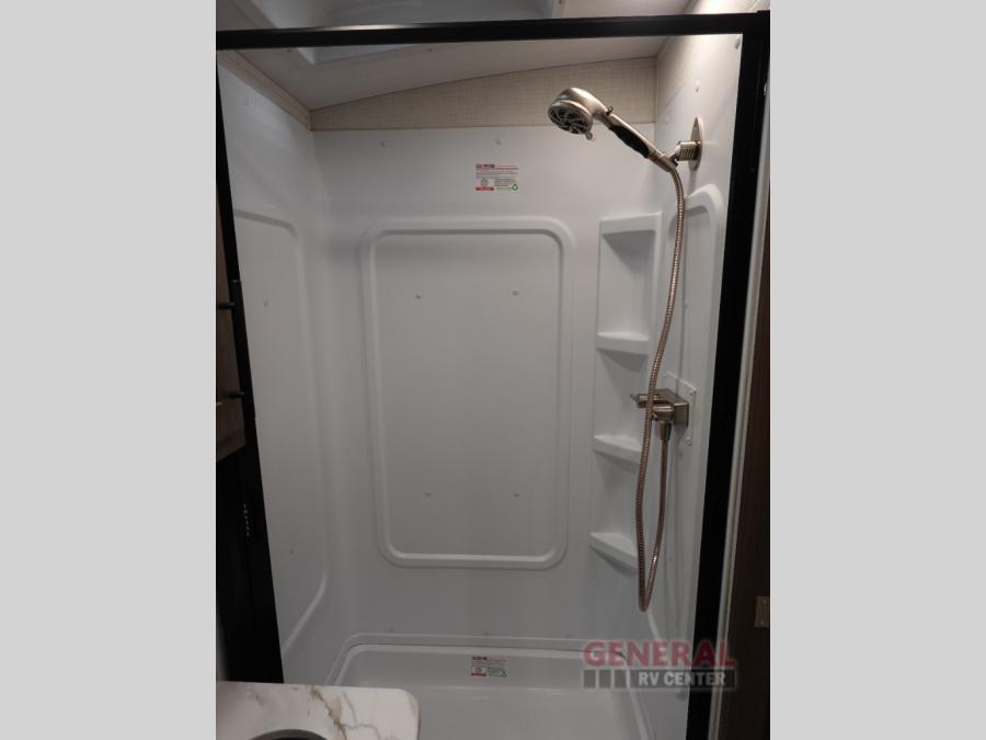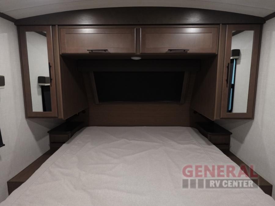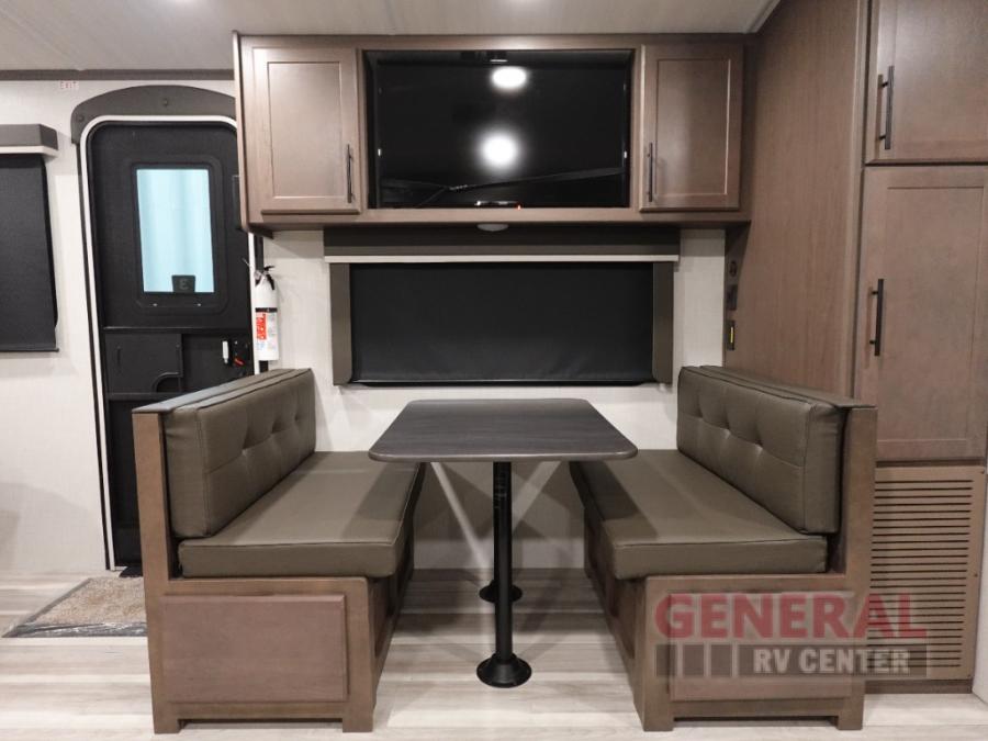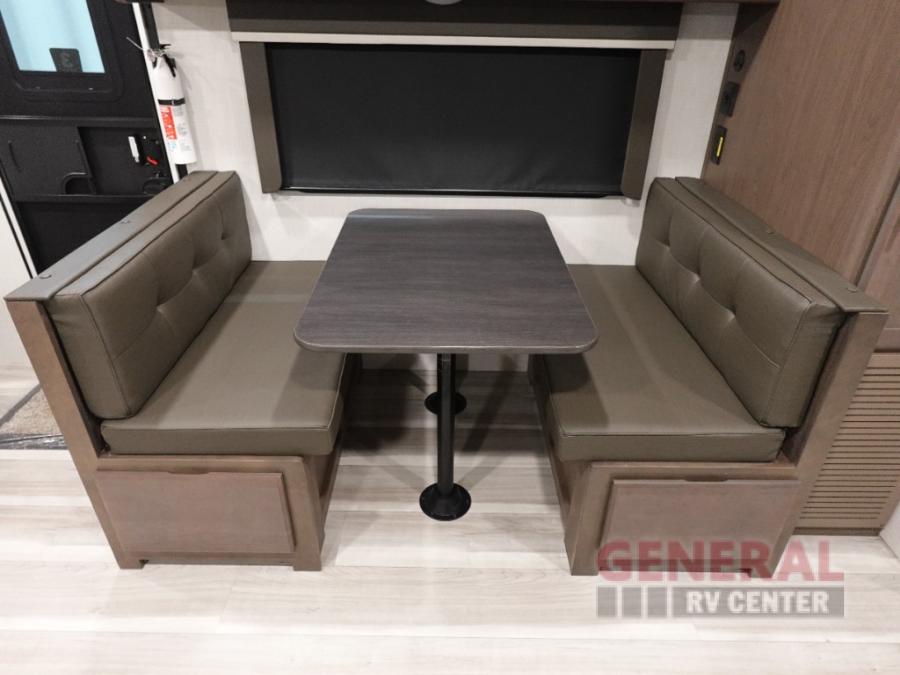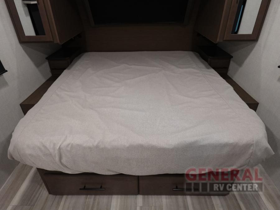 With a king-size bed, this Cougar Half-Ton travel trailer shows that you can still be comfortable even while you're away from home! The bed has drawers and nightstands on either side to keep your belongings tidy. There is a convenient shoe cubby right as you enter the unit to keep this space picked up as well. Right next to the booth dinette is the pantry, and next to the pantry is the full bathroom which is certainly one of the most valuable features to any trailer.
