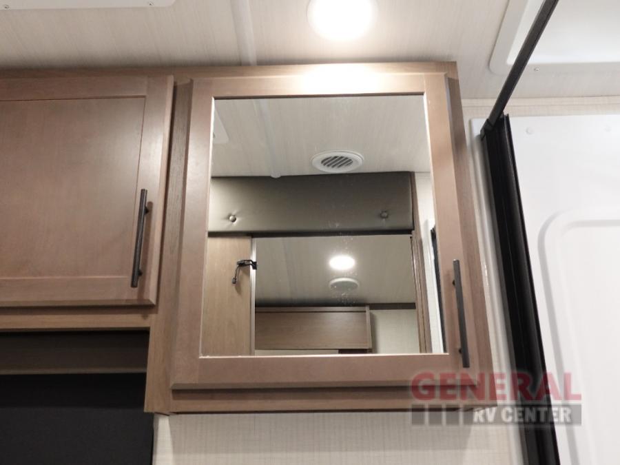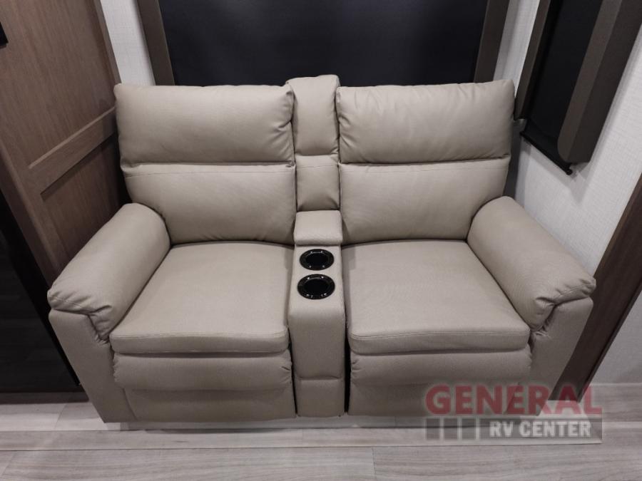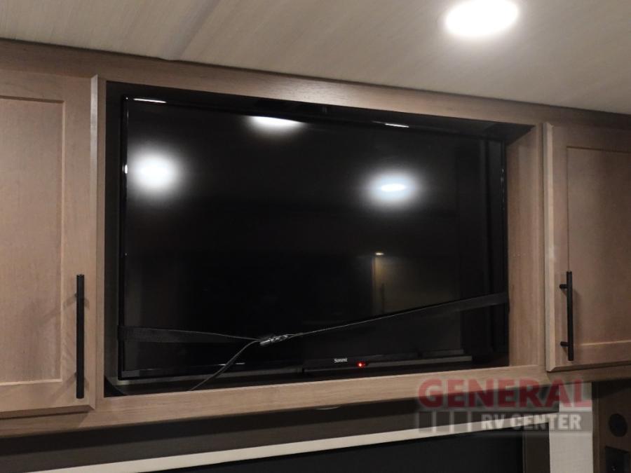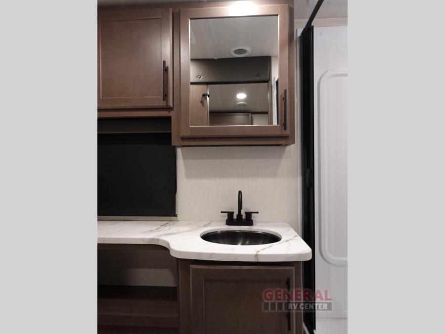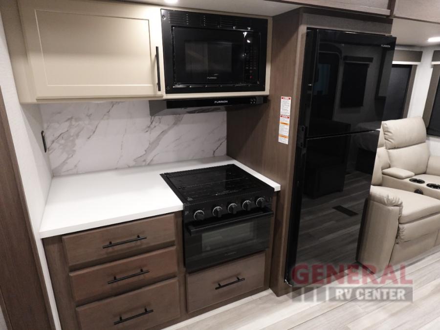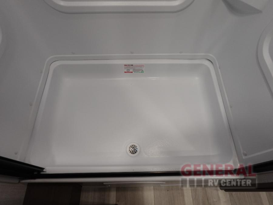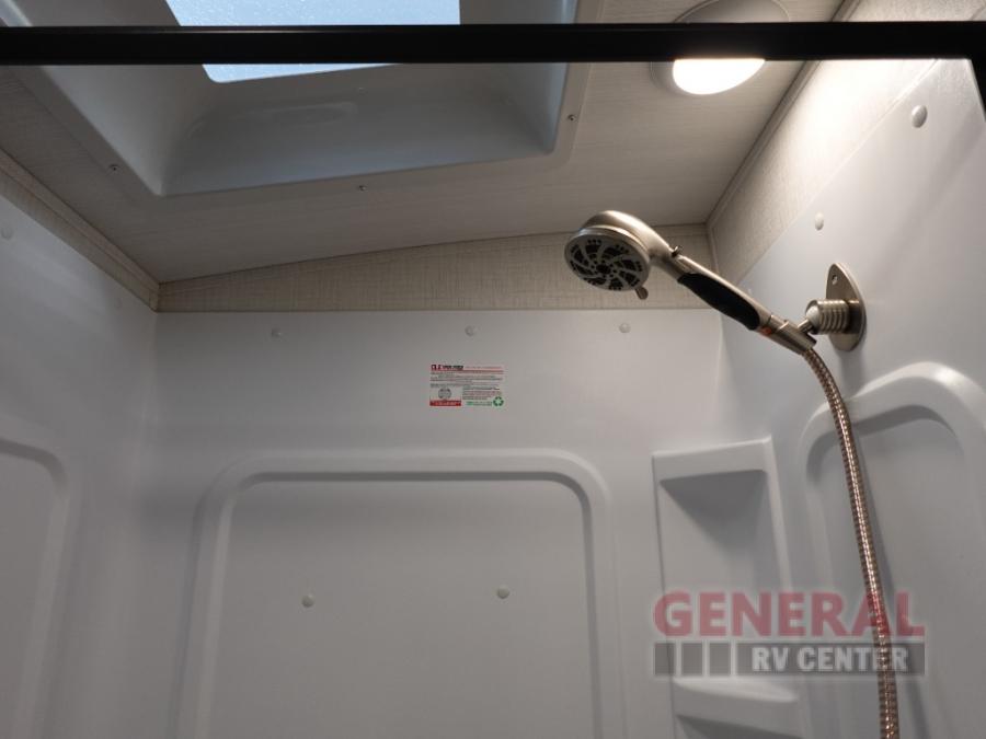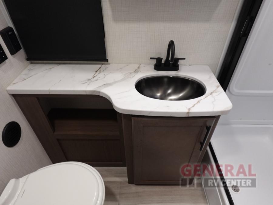 With a king-size bed, this Cougar Half-Ton travel trailer shows that you can still be comfortable even while you're away from home! The bed has drawers and nightstands on either side to keep your belongings tidy. There is a convenient shoe cubby right as you enter the unit to keep this space picked up as well. Right next to the booth dinette is the pantry, and next to the pantry is the full bathroom which is certainly one of the most valuable features to any trailer.