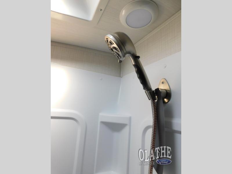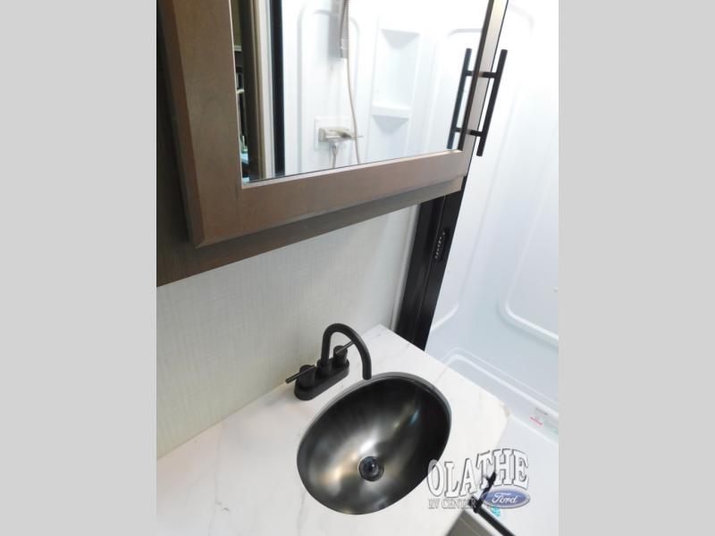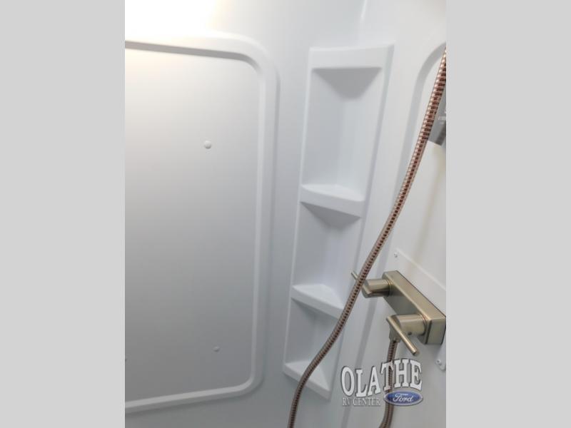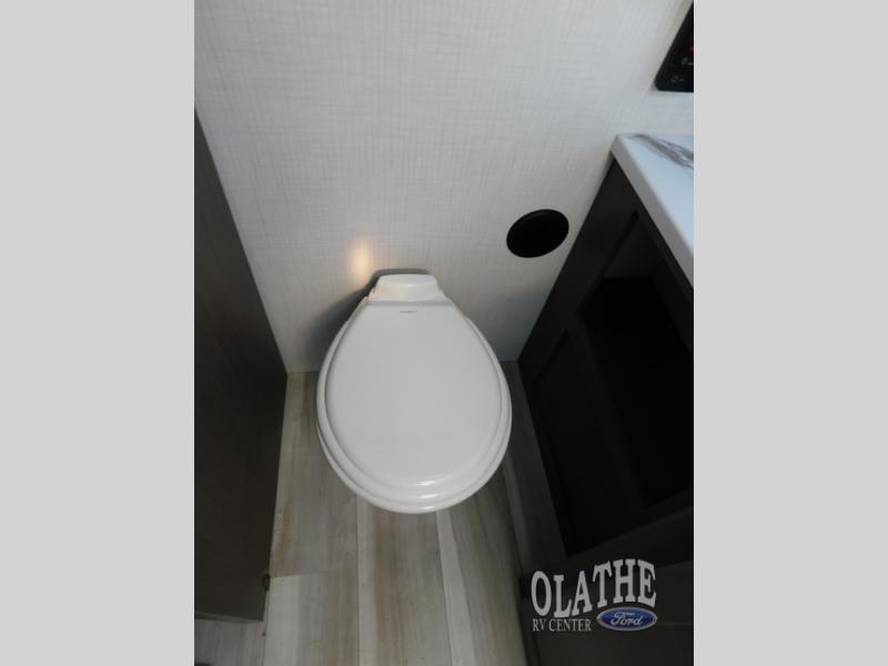 With a king-size bed, this Cougar Half-Ton travel trailer shows that you can still be comfortable even while you're away from home! The bed has drawers and nightstands on either side to keep your belongings tidy. There is a convenient shoe cubby right as you enter the unit to keep this space picked up as well. Right next to the booth dinette is the pantry, and next to the pantry is the full bathroom which is certainly one of the most valuable features to any trailer.