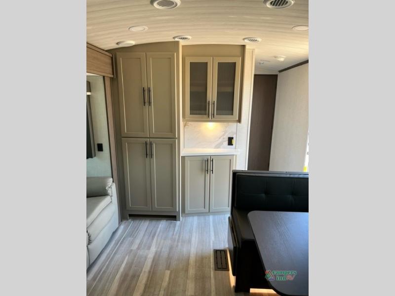 If you're ready for fun summers at the lake, make your adventures complete with this travel trailer in tow. The rear kitchen includes ample counter space to prep burgers, and you can take your preparations outside with the outdoor kitchen prep area. If the weather is nice, you might just want to eat outside too under the 18' power awning, or dine inside at the booth dinette. There is also a tri-fold sleeper sofa within the large slide out and an LED HDTV for movie nights. You'll find plenty of storage throughout, including a kitchen pantry, overhead cabinets, plus dual bedroom nightstands on either side of the king bed!