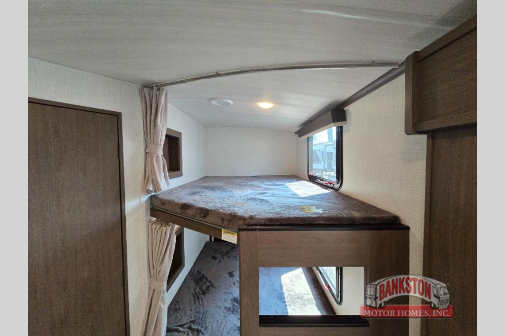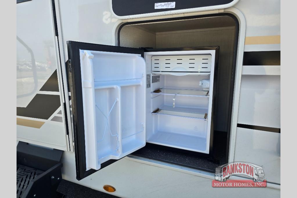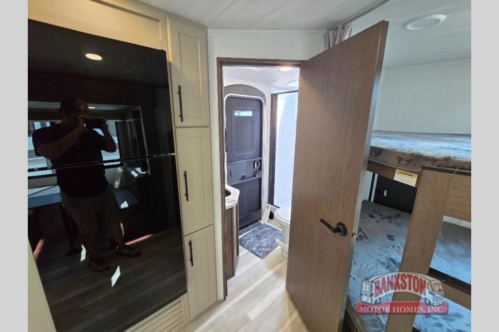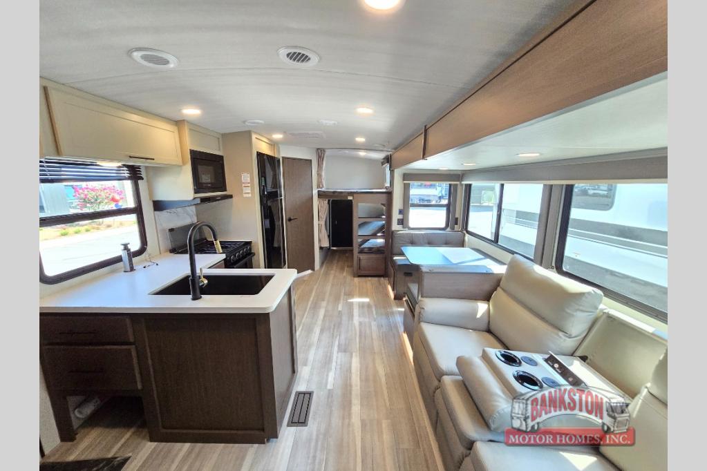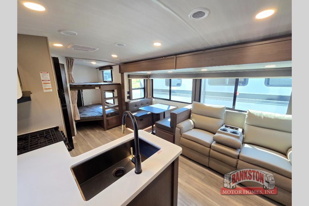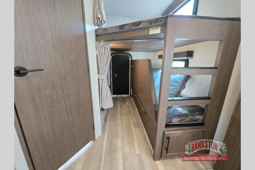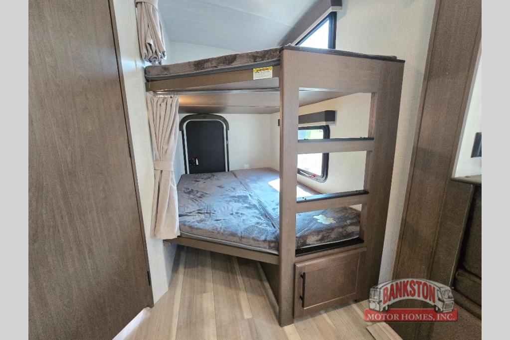 With dual entry doors in this travel trailer, you can enter in through the main living area or the full bath for convenience! Once inside, the sleeper sofa and booth dinette provide places to relax, eat, and play games, plus there is an entertainment center with hidden storage behind to keep movies organized. A full kitchen with a three burner cooktop and 12V refrigerator will allow you to cook and store food, or you can head outdoors to cook on the outdoor kitchen. There is also drop-frame storage outside for fishing poles and hiking gear, and the 21' electric awning provides shade as you relax. When it's time to call it a night, the king bed in the front private bedroom is sure to bring comfort, while the little ones take the double-size bunks, and any other guests can sleep on the living room furniture!