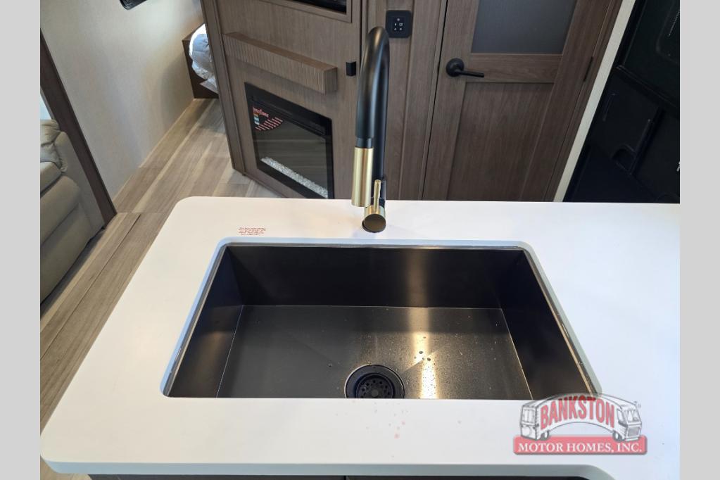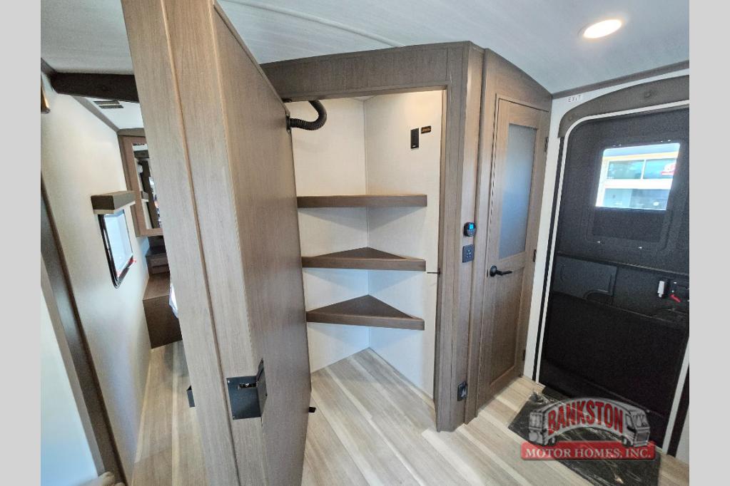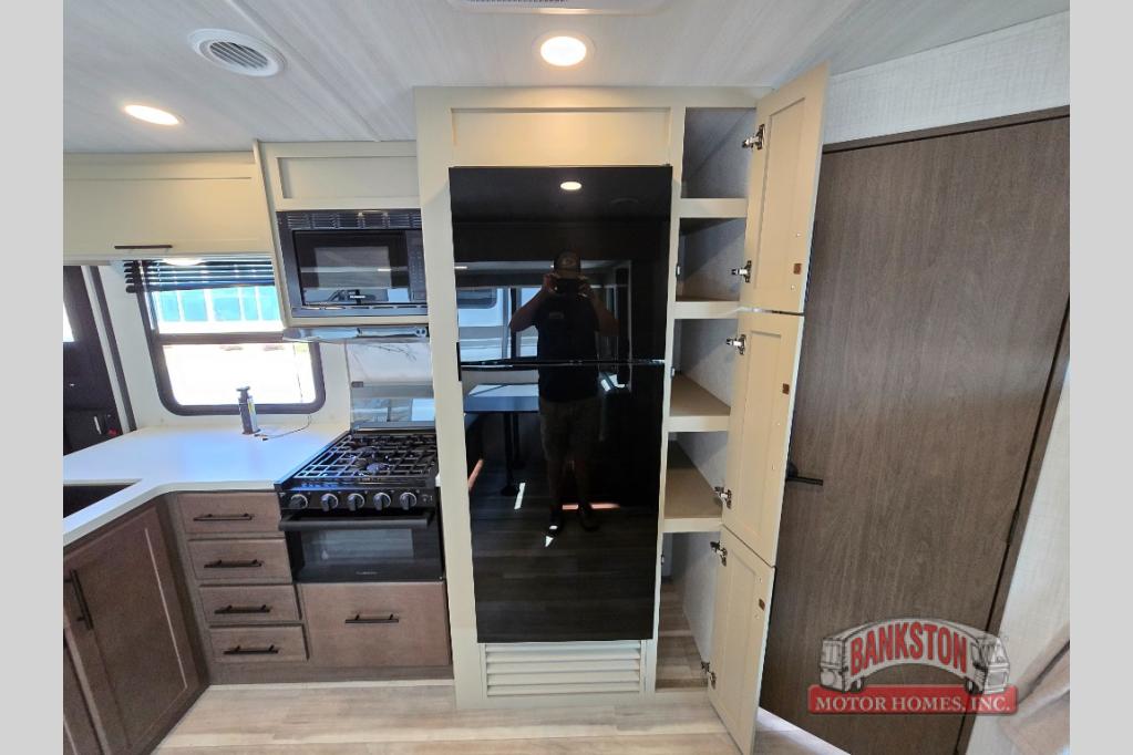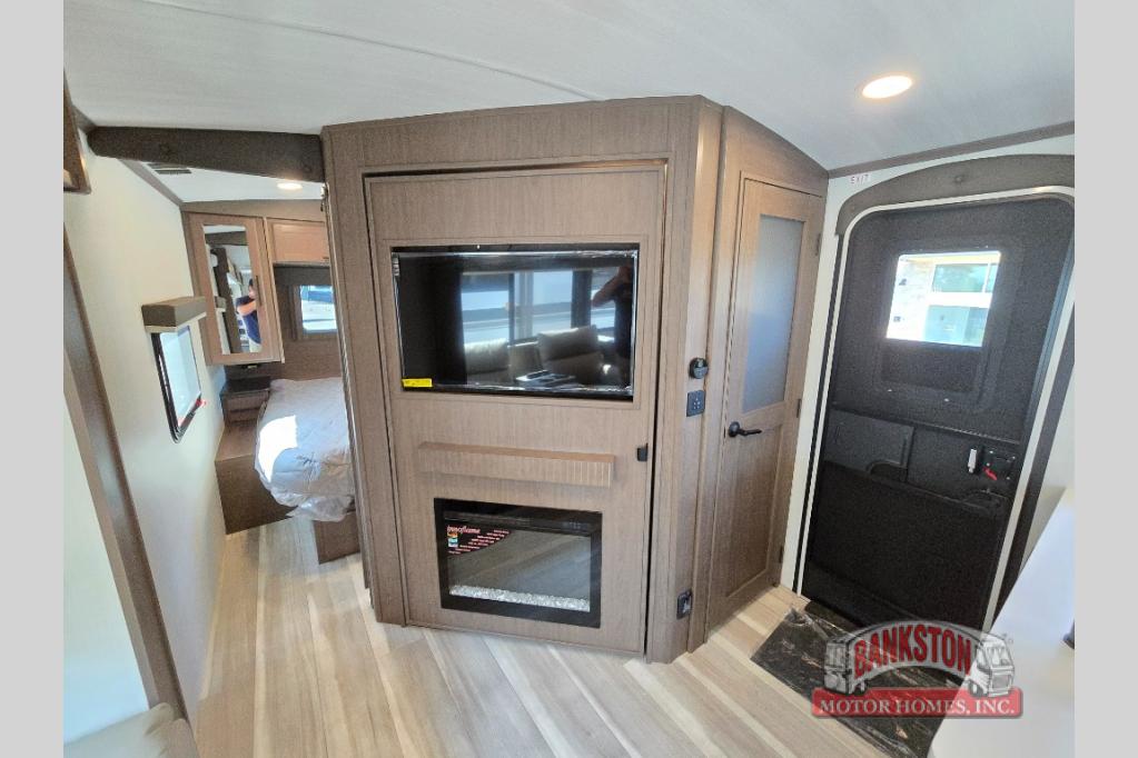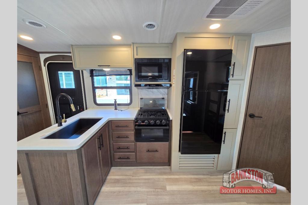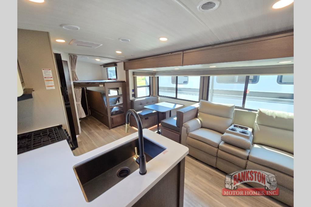 With dual entry doors in this travel trailer, you can enter in through the main living area or the full bath for convenience! Once inside, the sleeper sofa and booth dinette provide places to relax, eat, and play games, plus there is an entertainment center with hidden storage behind to keep movies organized. A full kitchen with a three burner cooktop and 12V refrigerator will allow you to cook and store food, or you can head outdoors to cook on the outdoor kitchen. There is also drop-frame storage outside for fishing poles and hiking gear, and the 21' electric awning provides shade as you relax. When it's time to call it a night, the king bed in the front private bedroom is sure to bring comfort, while the little ones take the double-size bunks, and any other guests can sleep on the living room furniture!