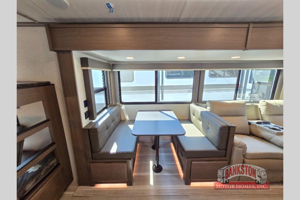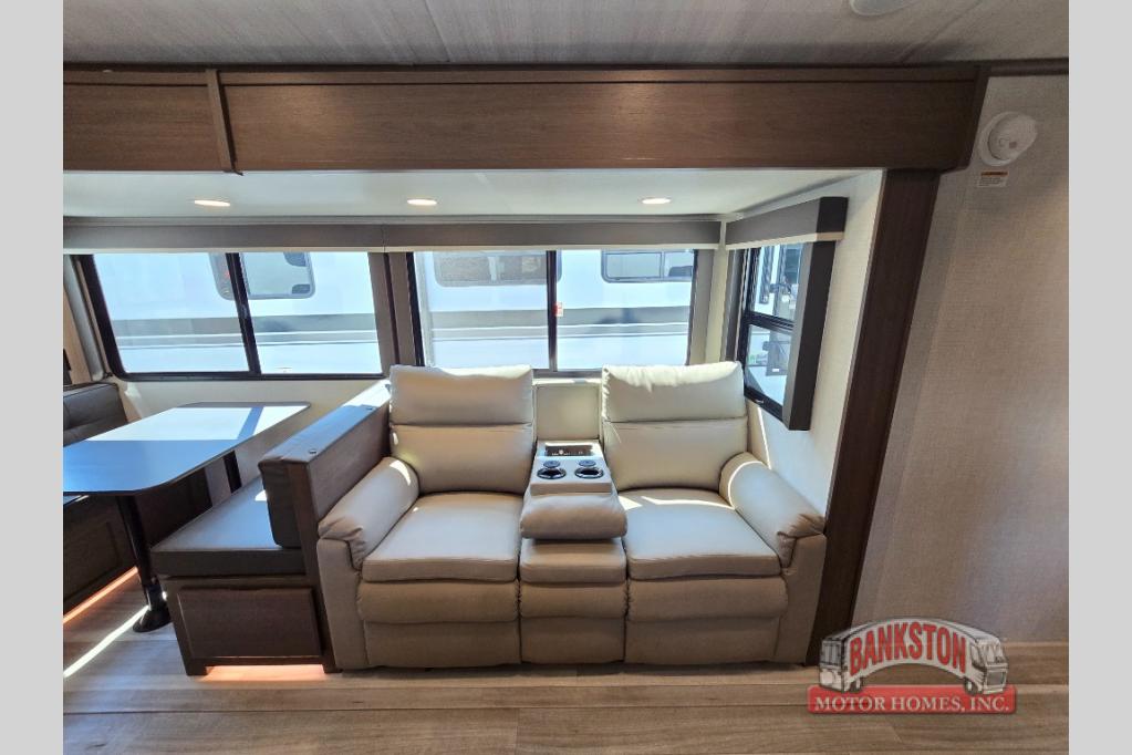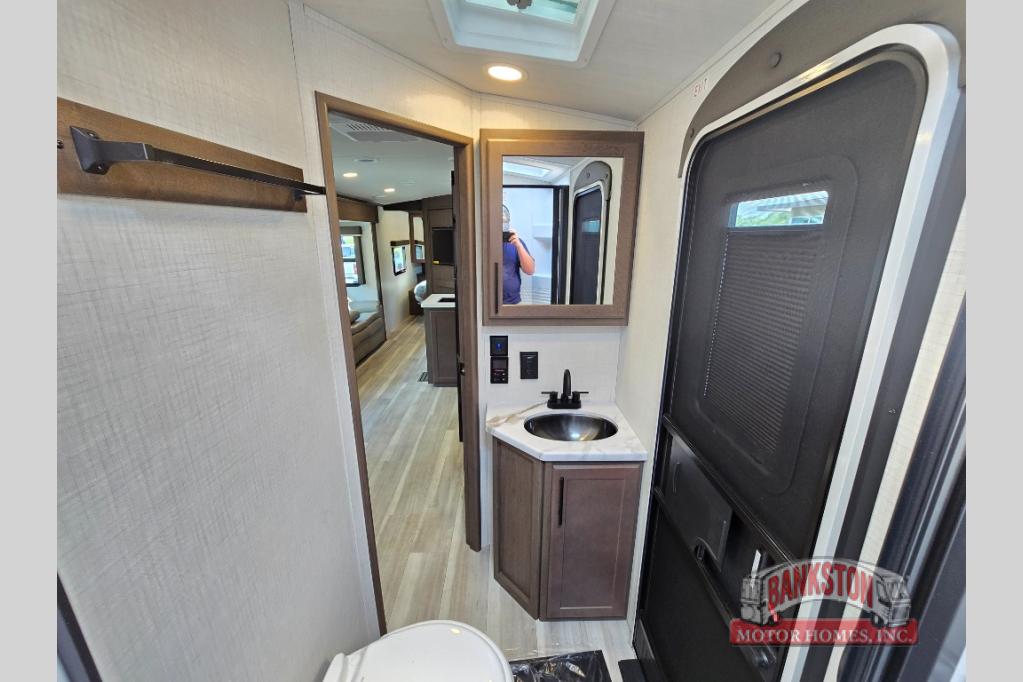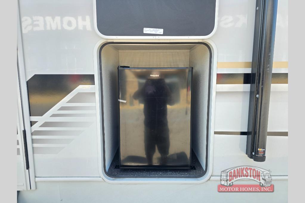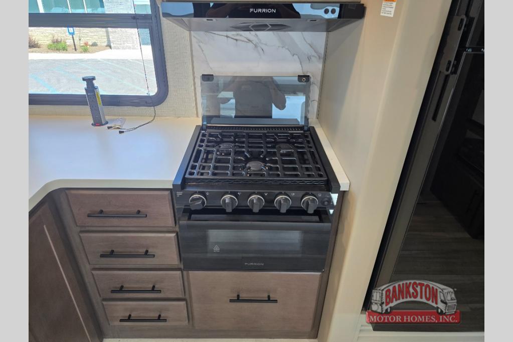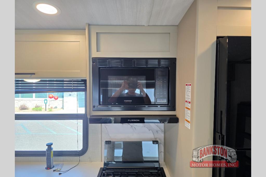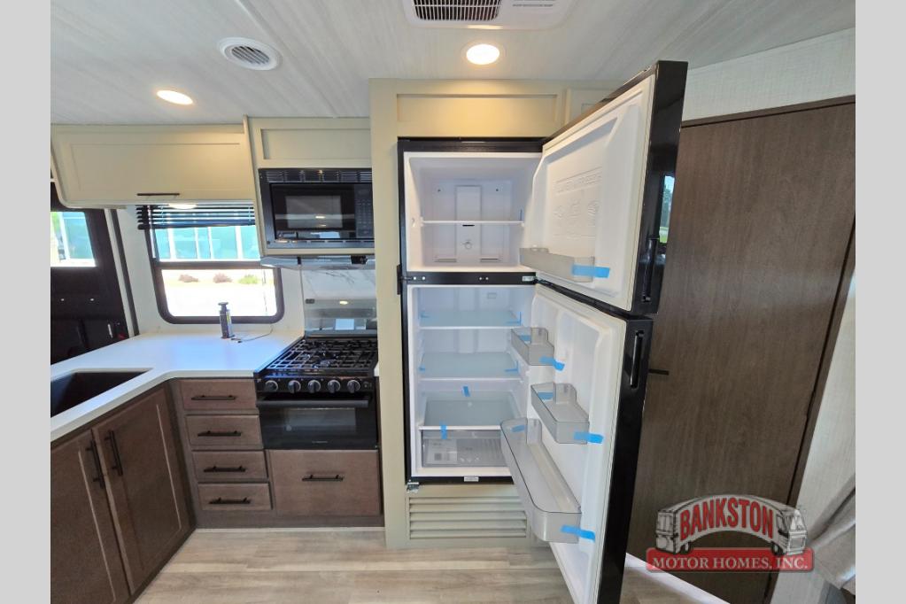 With dual entry doors in this travel trailer, you can enter in through the main living area or the full bath for convenience! Once inside, the sleeper sofa and booth dinette provide places to relax, eat, and play games, plus there is an entertainment center with hidden storage behind to keep movies organized. A full kitchen with a three burner cooktop and 12V refrigerator will allow you to cook and store food, or you can head outdoors to cook on the outdoor kitchen. There is also drop-frame storage outside for fishing poles and hiking gear, and the 21' electric awning provides shade as you relax. When it's time to call it a night, the king bed in the front private bedroom is sure to bring comfort, while the little ones take the double-size bunks, and any other guests can sleep on the living room furniture!