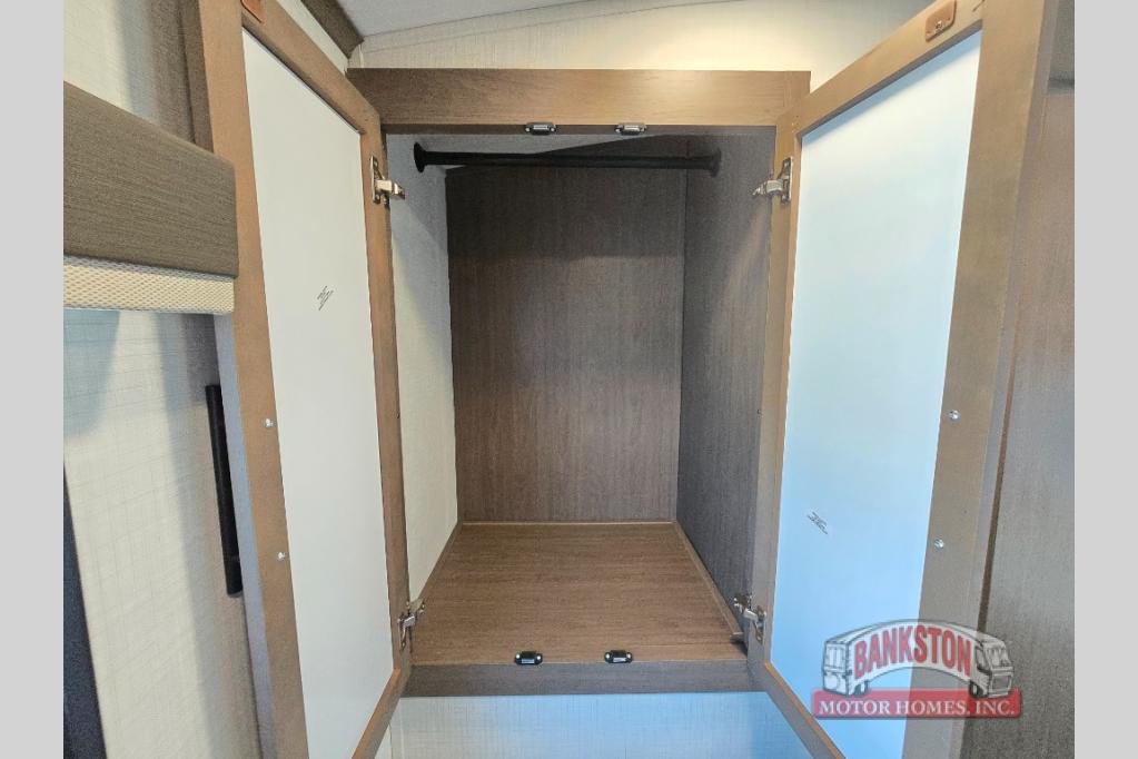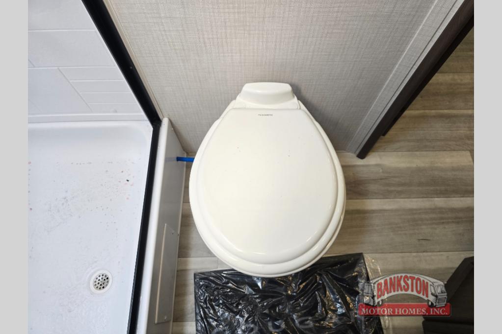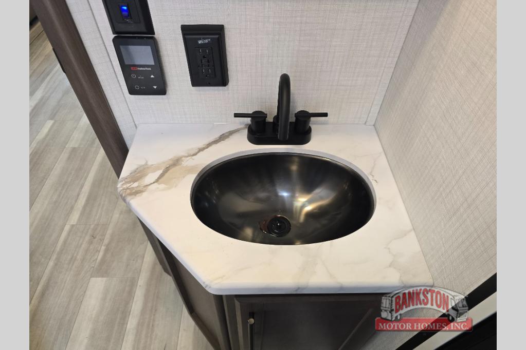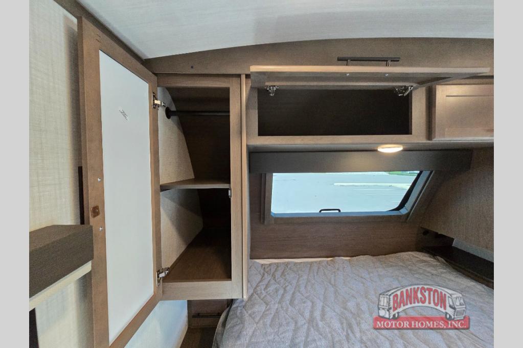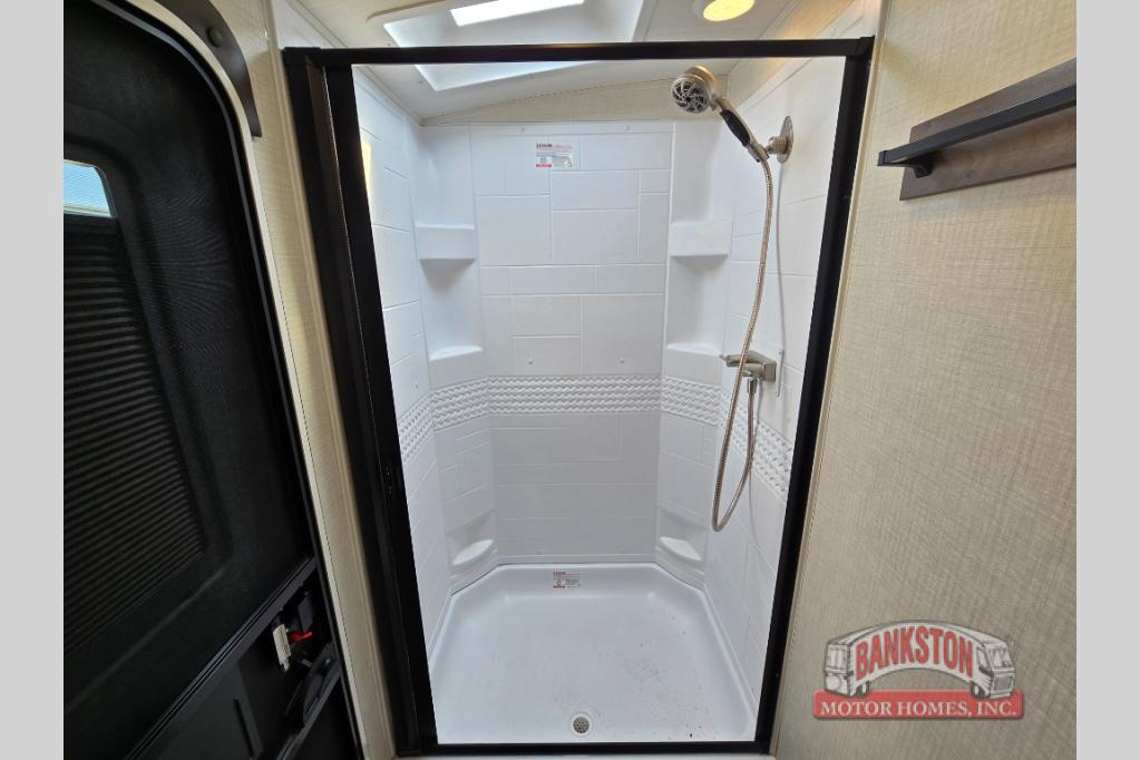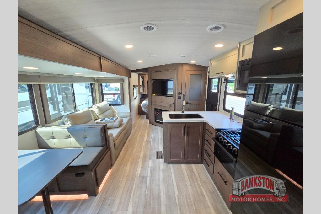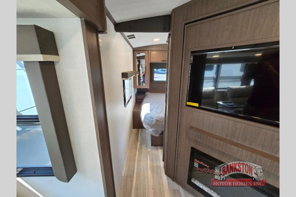 With dual entry doors in this travel trailer, you can enter in through the main living area or the full bath for convenience! Once inside, the sleeper sofa and booth dinette provide places to relax, eat, and play games, plus there is an entertainment center with hidden storage behind to keep movies organized. A full kitchen with a three burner cooktop and 12V refrigerator will allow you to cook and store food, or you can head outdoors to cook on the outdoor kitchen. There is also drop-frame storage outside for fishing poles and hiking gear, and the 21' electric awning provides shade as you relax. When it's time to call it a night, the king bed in the front private bedroom is sure to bring comfort, while the little ones take the double-size bunks, and any other guests can sleep on the living room furniture!