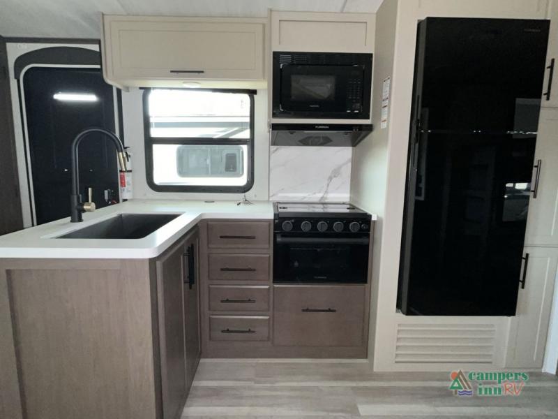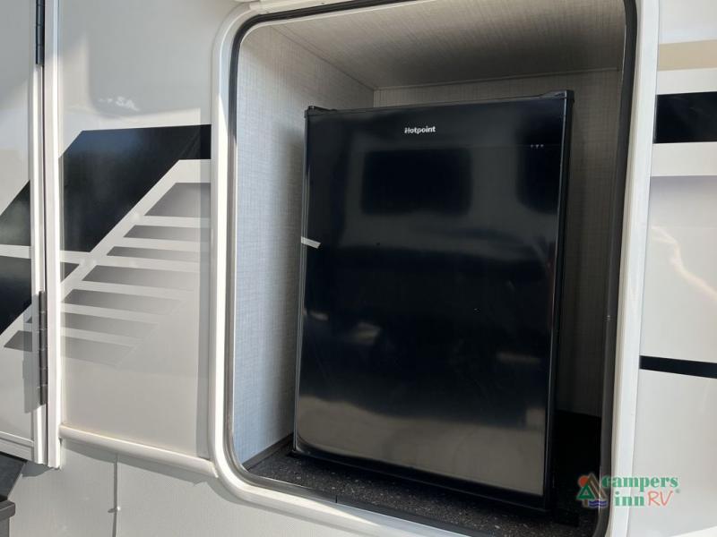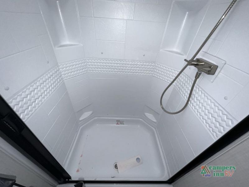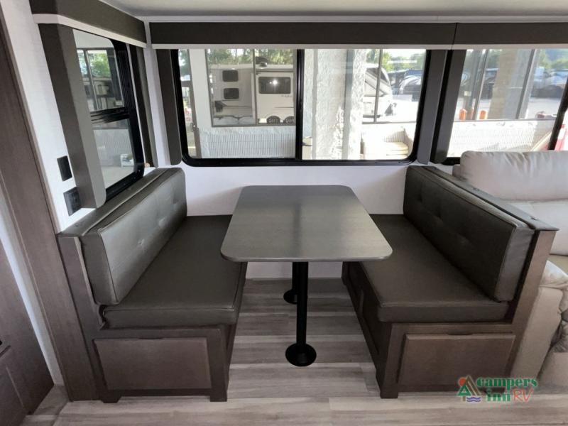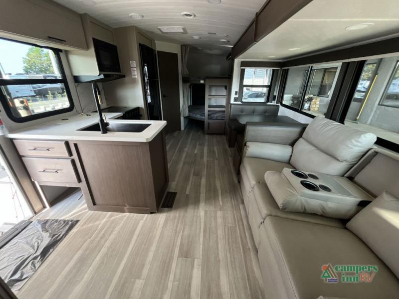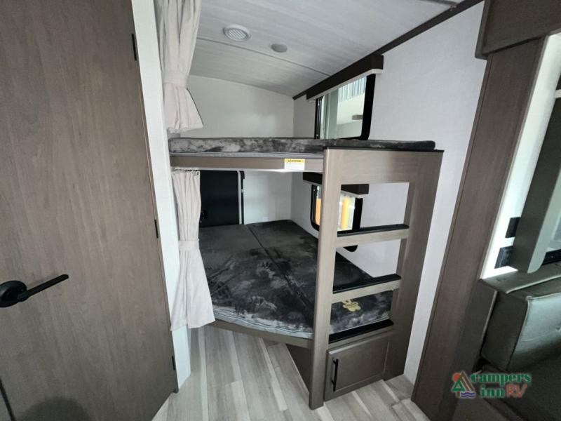 With dual entry doors in this travel trailer, you can enter in through the main living area or the full bath for convenience! Once inside, the sleeper sofa and booth dinette provide places to relax, eat, and play games, plus there is an entertainment center with hidden storage behind to keep movies organized. A full kitchen with a three burner cooktop and 12V refrigerator will allow you to cook and store food, or you can head outdoors to use the outdoor kitchen prep area. There is also drop-frame storage outside for fishing poles and hiking gear, and the 21' electric awning provides shade as you relax. When it's time to call it a night, the king bed in the front private bedroom is sure to bring comfort, while the little ones take the double-size bunks, and any other guests can sleep on the living room furniture!