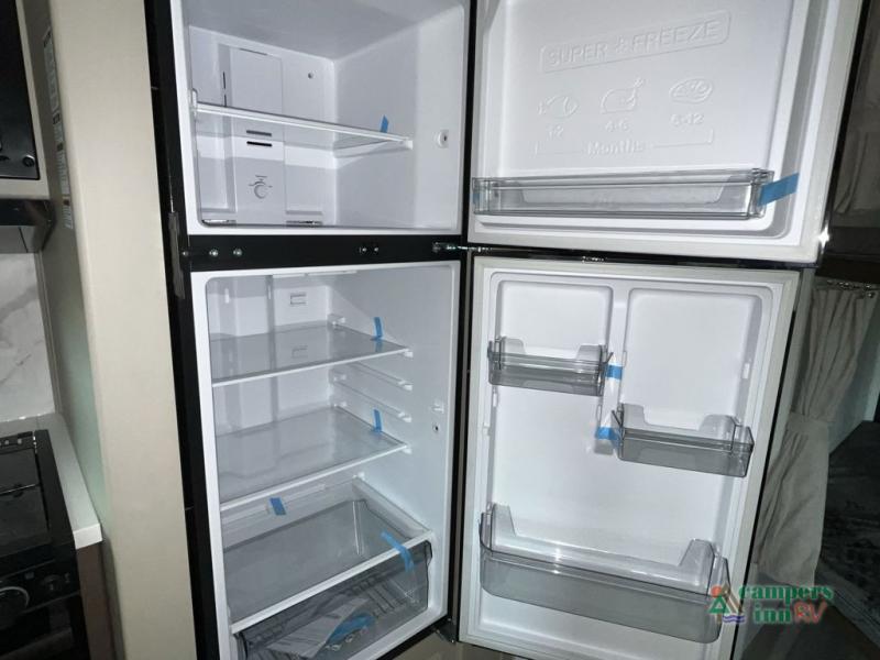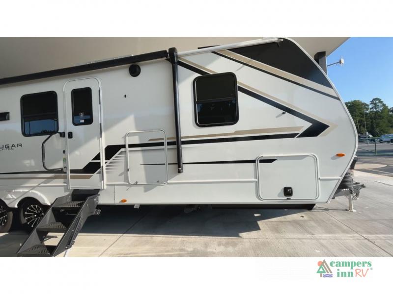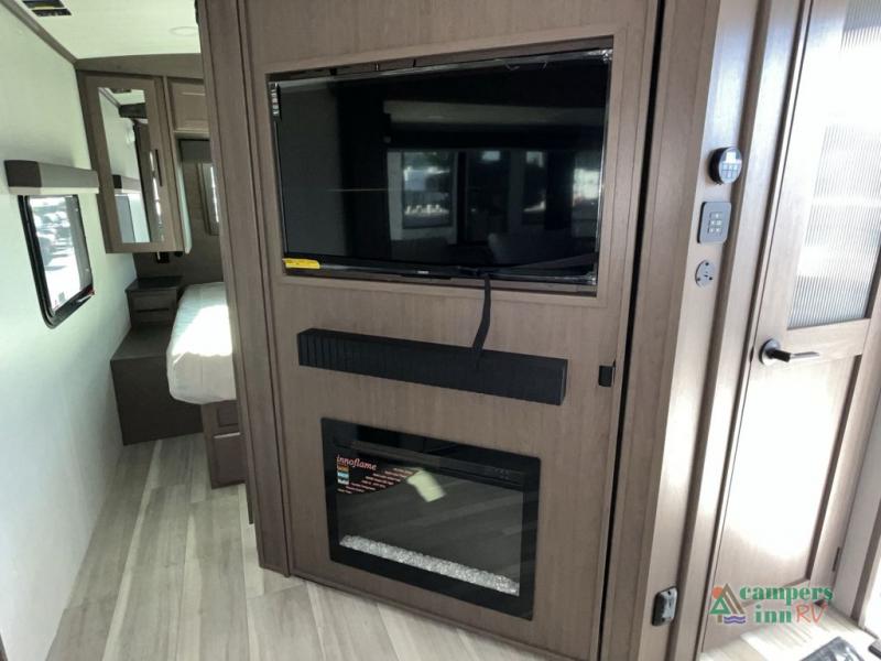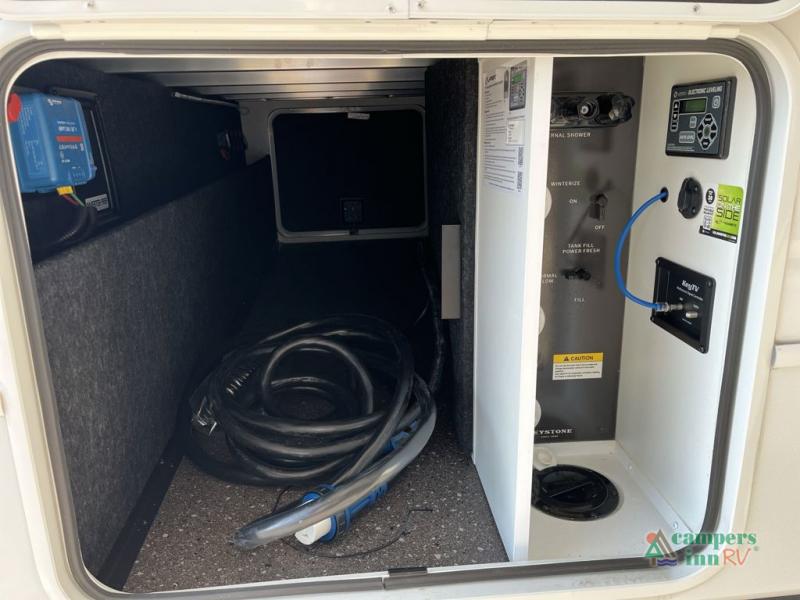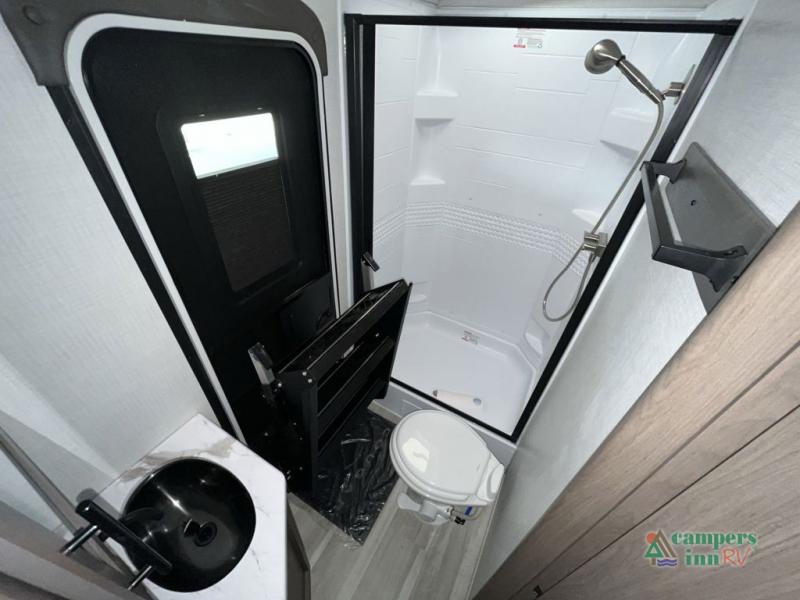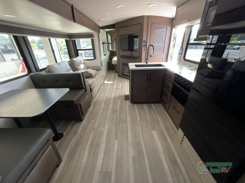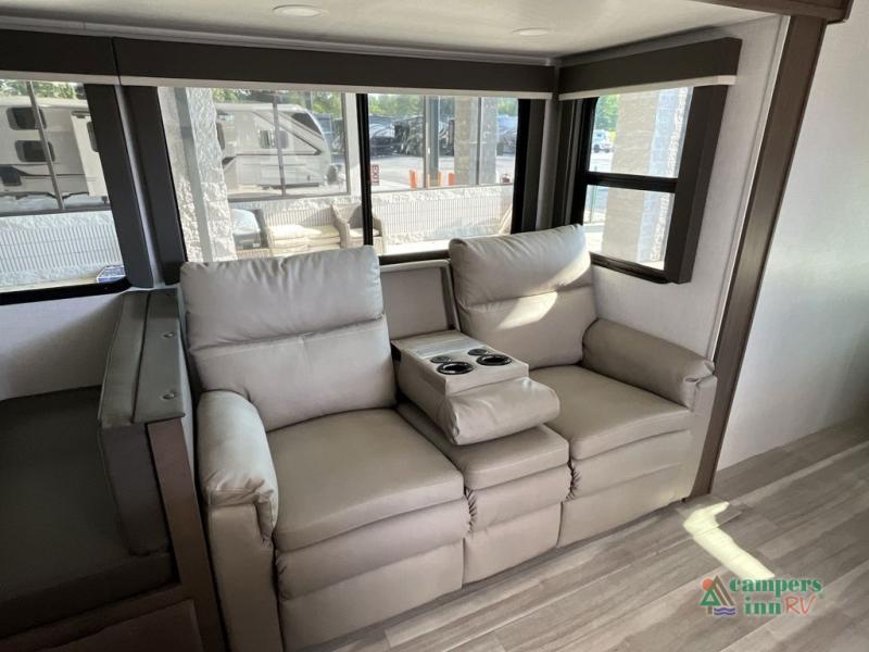 With dual entry doors in this travel trailer, you can enter in through the main living area or the full bath for convenience! Once inside, the sleeper sofa and booth dinette provide places to relax, eat, and play games, plus there is an entertainment center with hidden storage behind to keep movies organized. A full kitchen with a three burner cooktop and 12V refrigerator will allow you to cook and store food, or you can head outdoors to use the outdoor kitchen prep area. There is also drop-frame storage outside for fishing poles and hiking gear, and the 21' electric awning provides shade as you relax. When it's time to call it a night, the king bed in the front private bedroom is sure to bring comfort, while the little ones take the double-size bunks, and any other guests can sleep on the living room furniture!